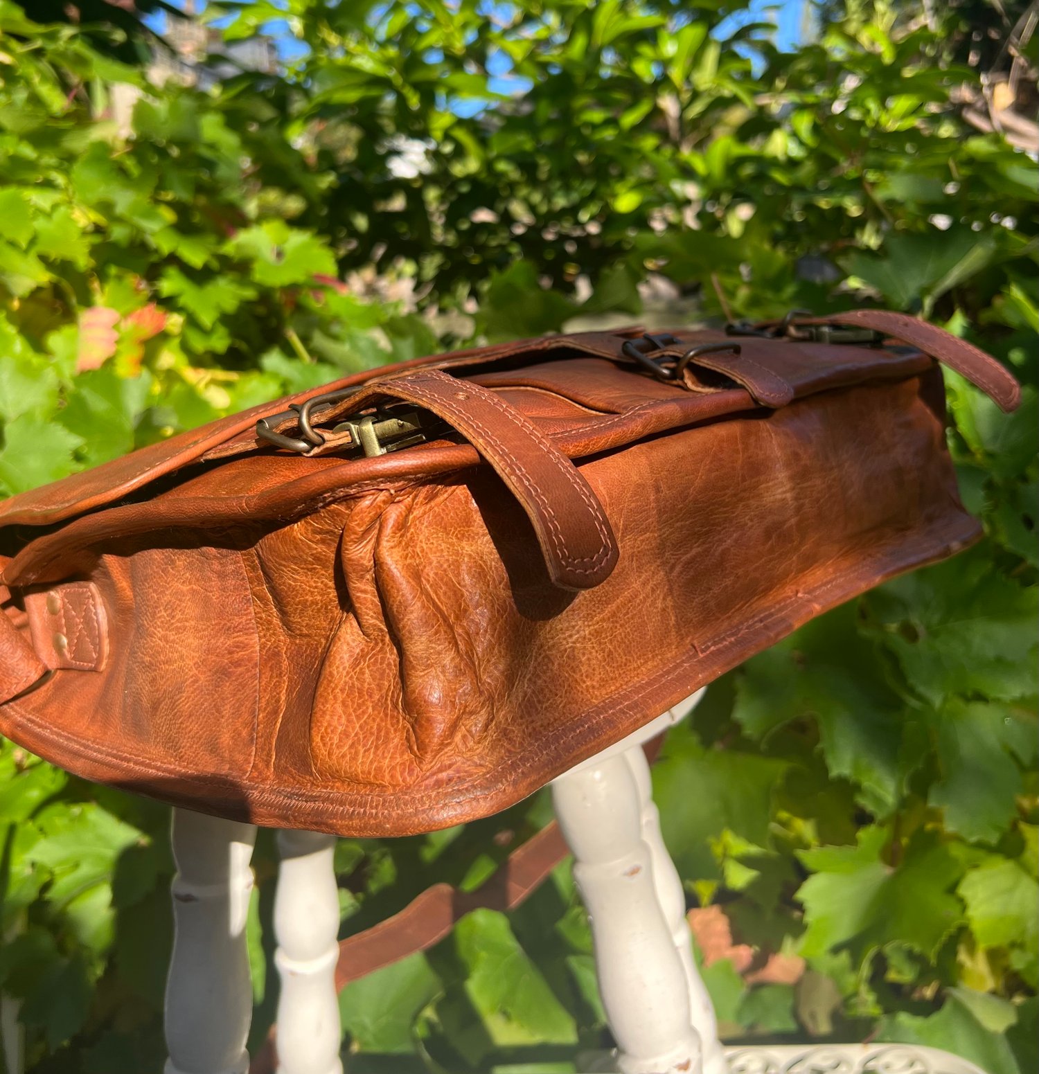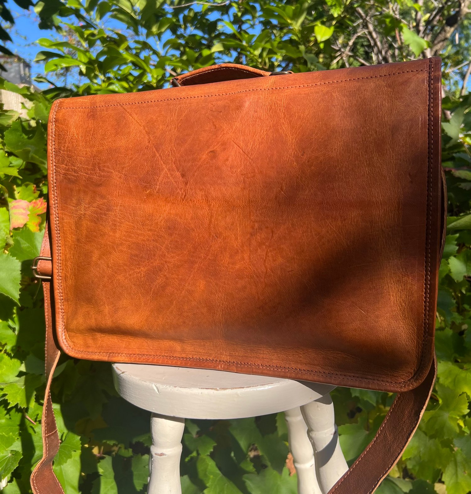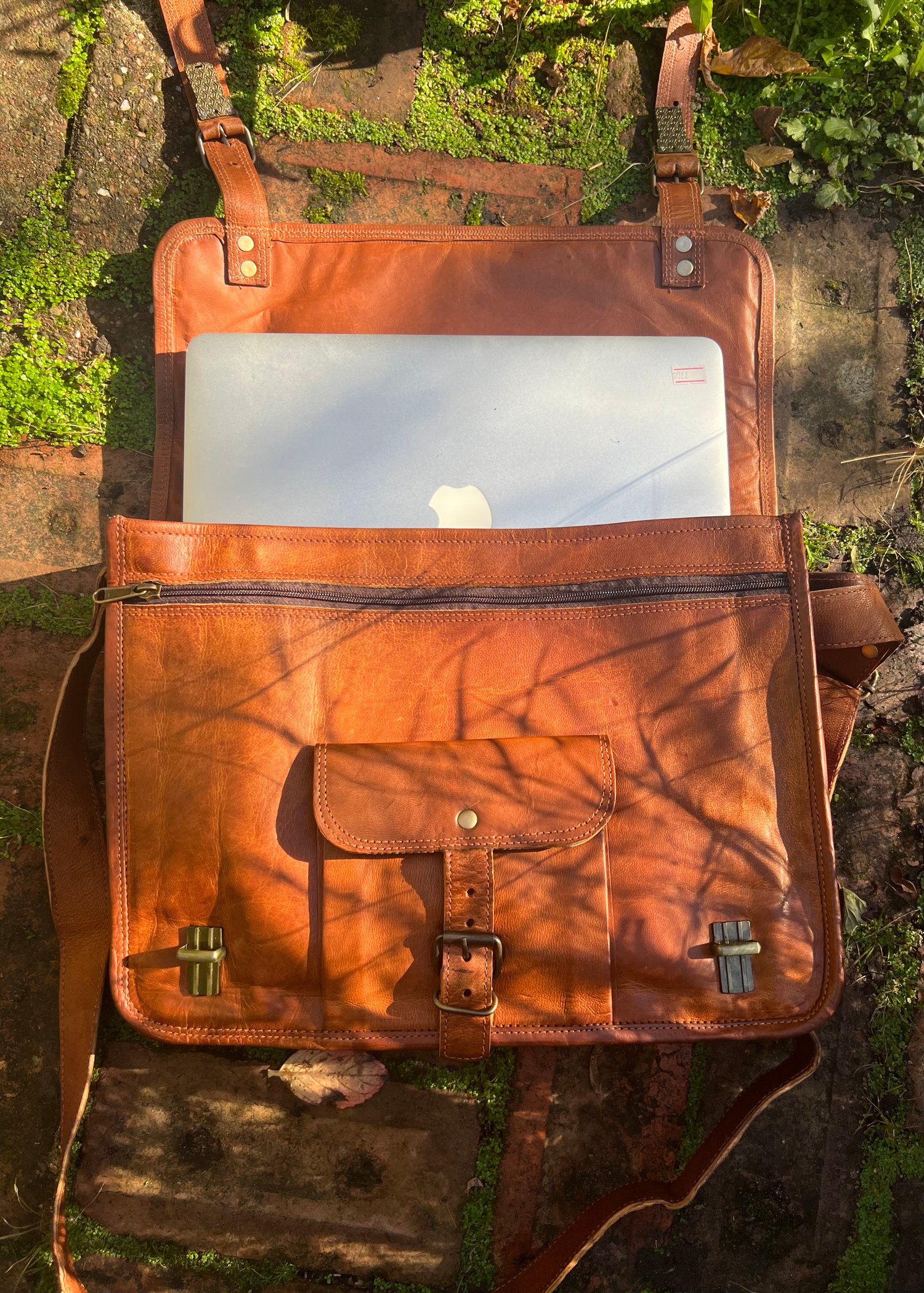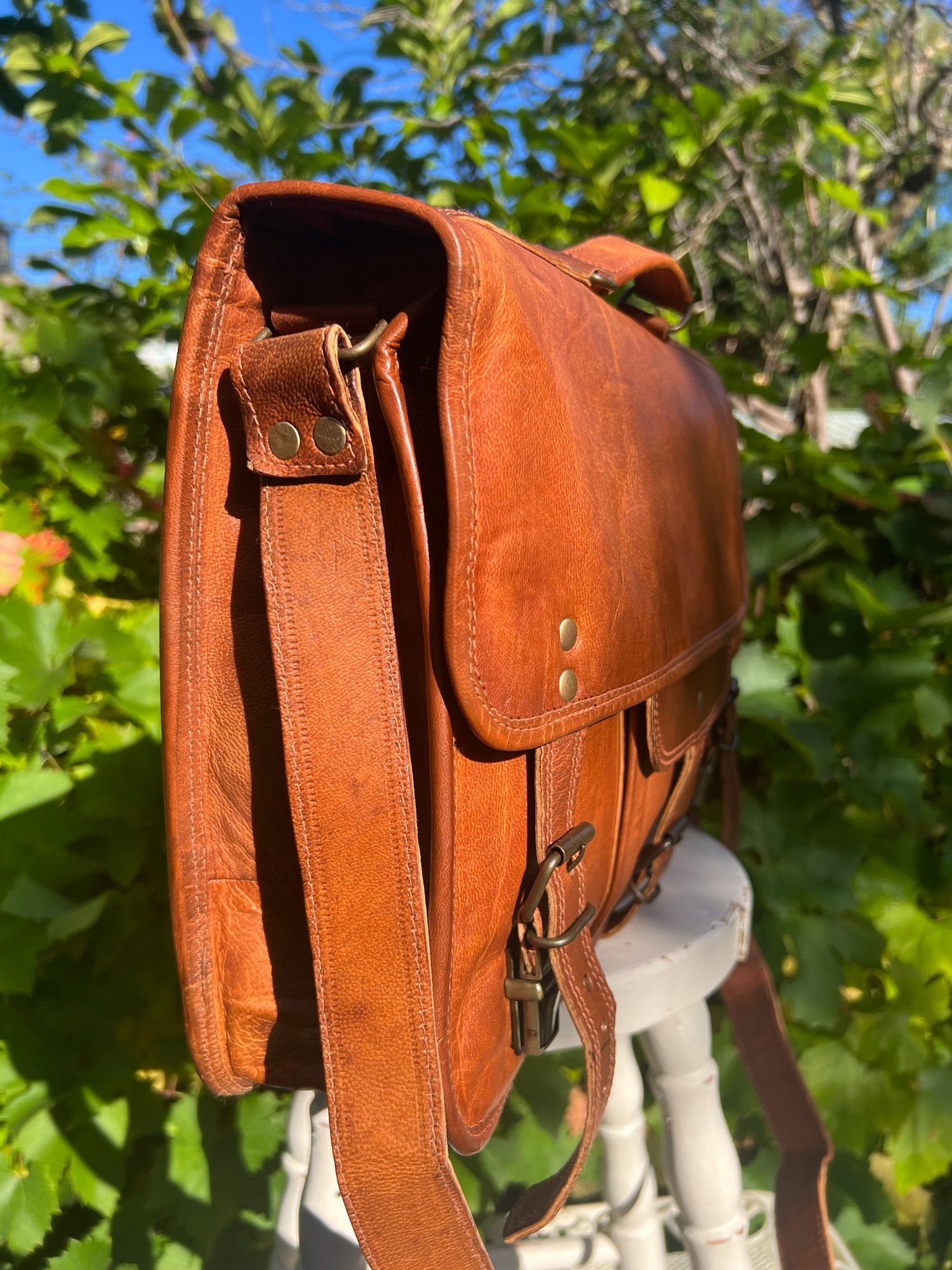 This spacious handmade crossbody messenger is made from leather which is oiled and dried in the Indian sunshine giving it a distressed vintage finish. The leather softens and the colour deepens with age.