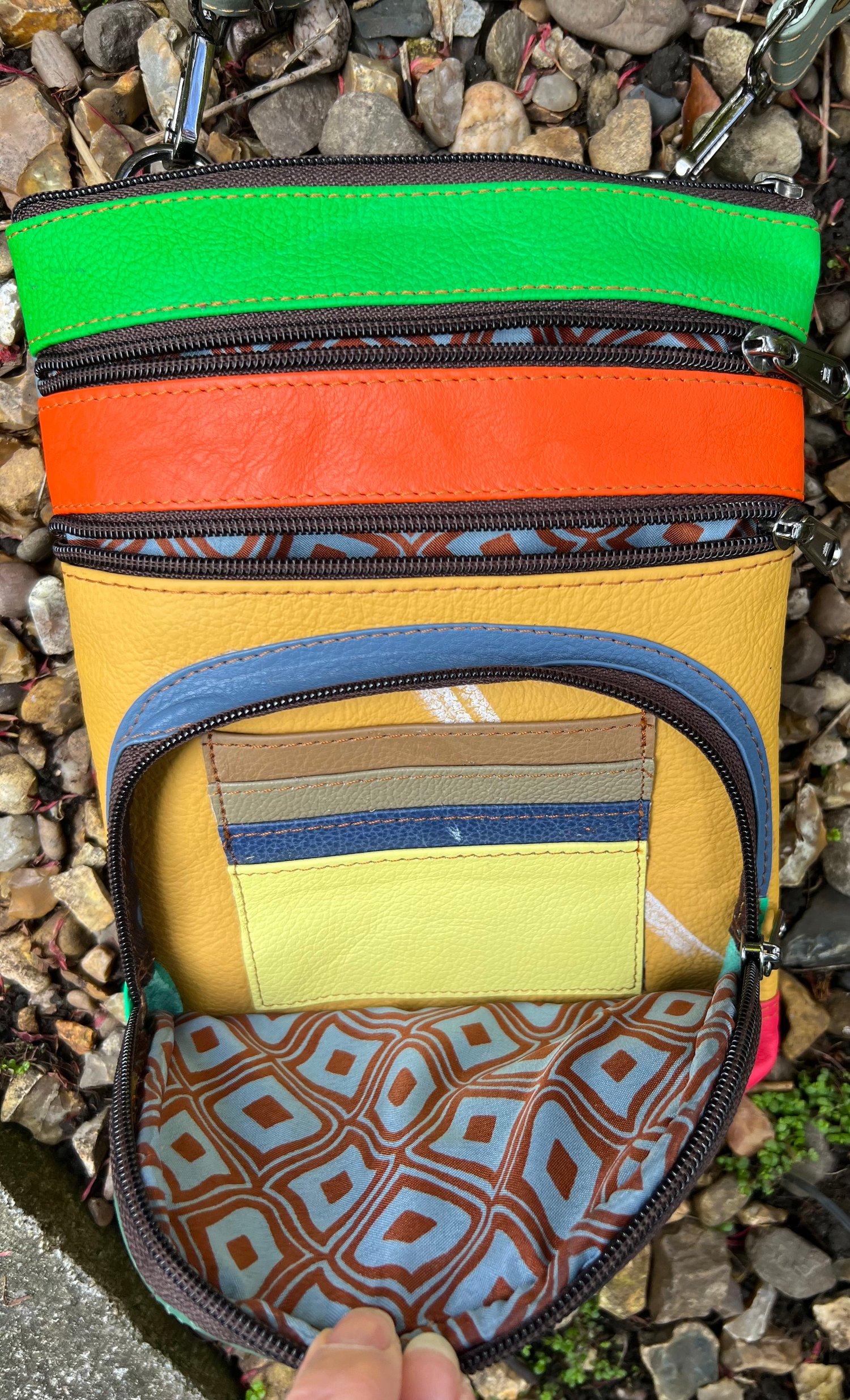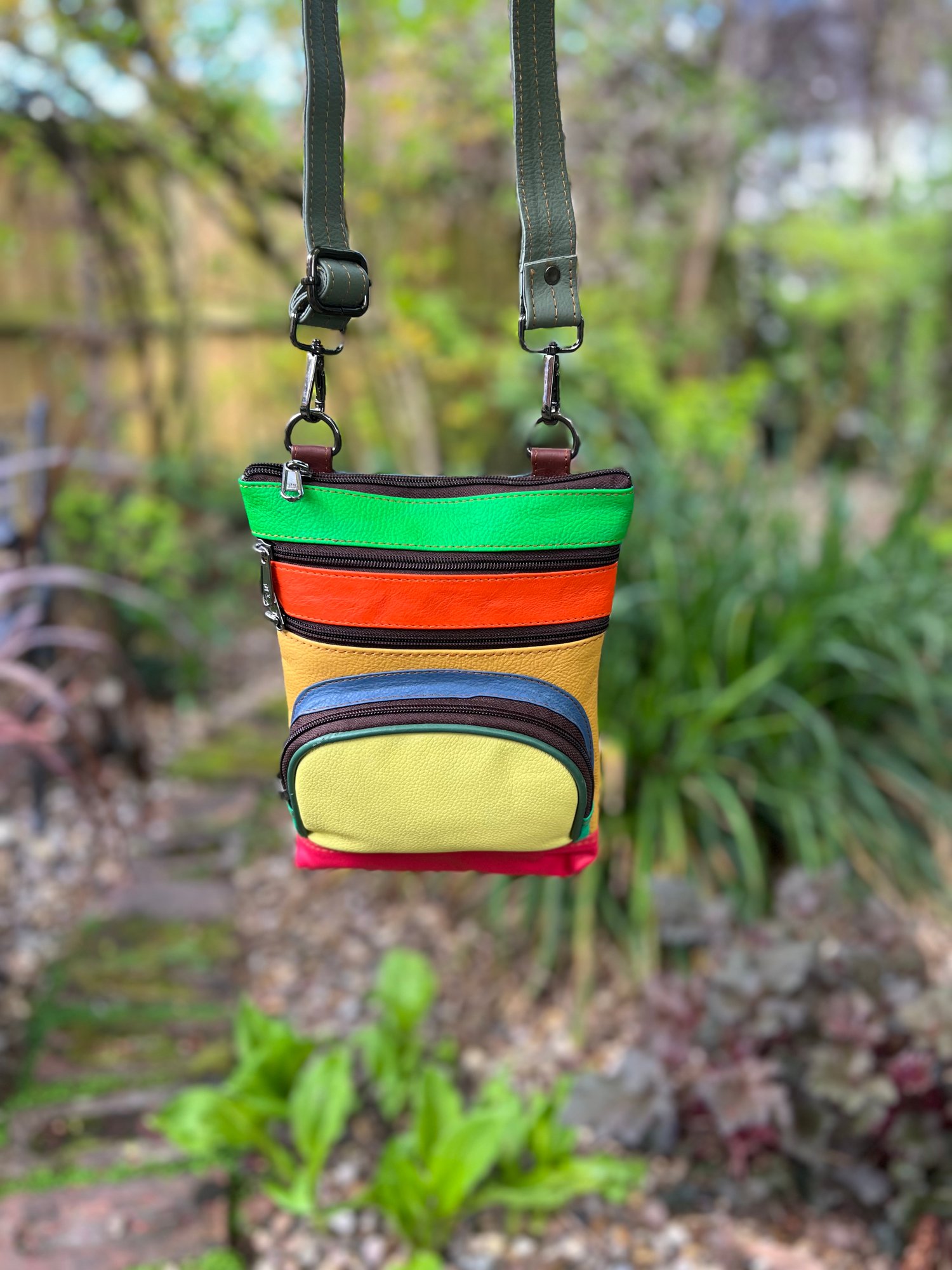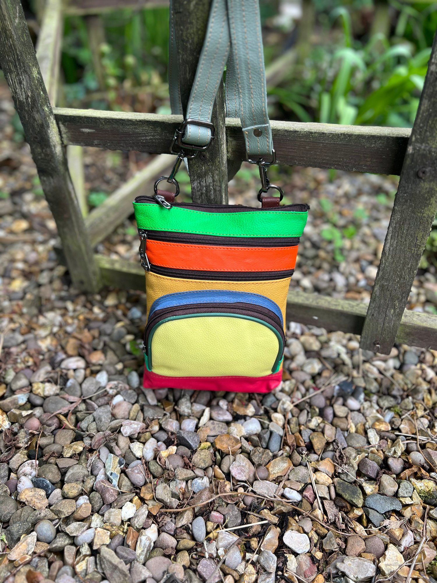 Our sustainable colourful leather bags are made for us in India using offcuts of leather which would otherwise go to landfill. They have been ethically crafted to produce both an unusual and unique bag.