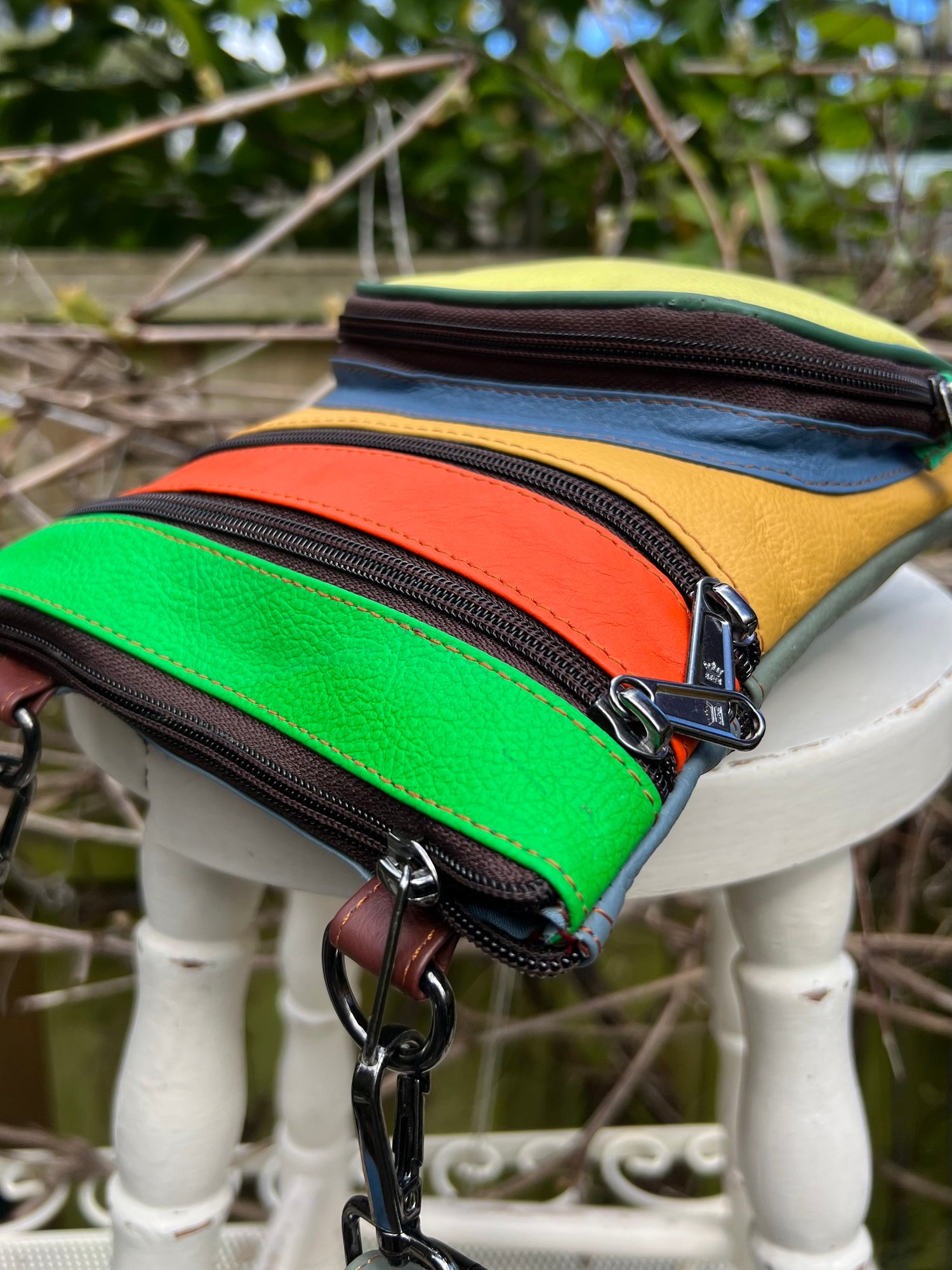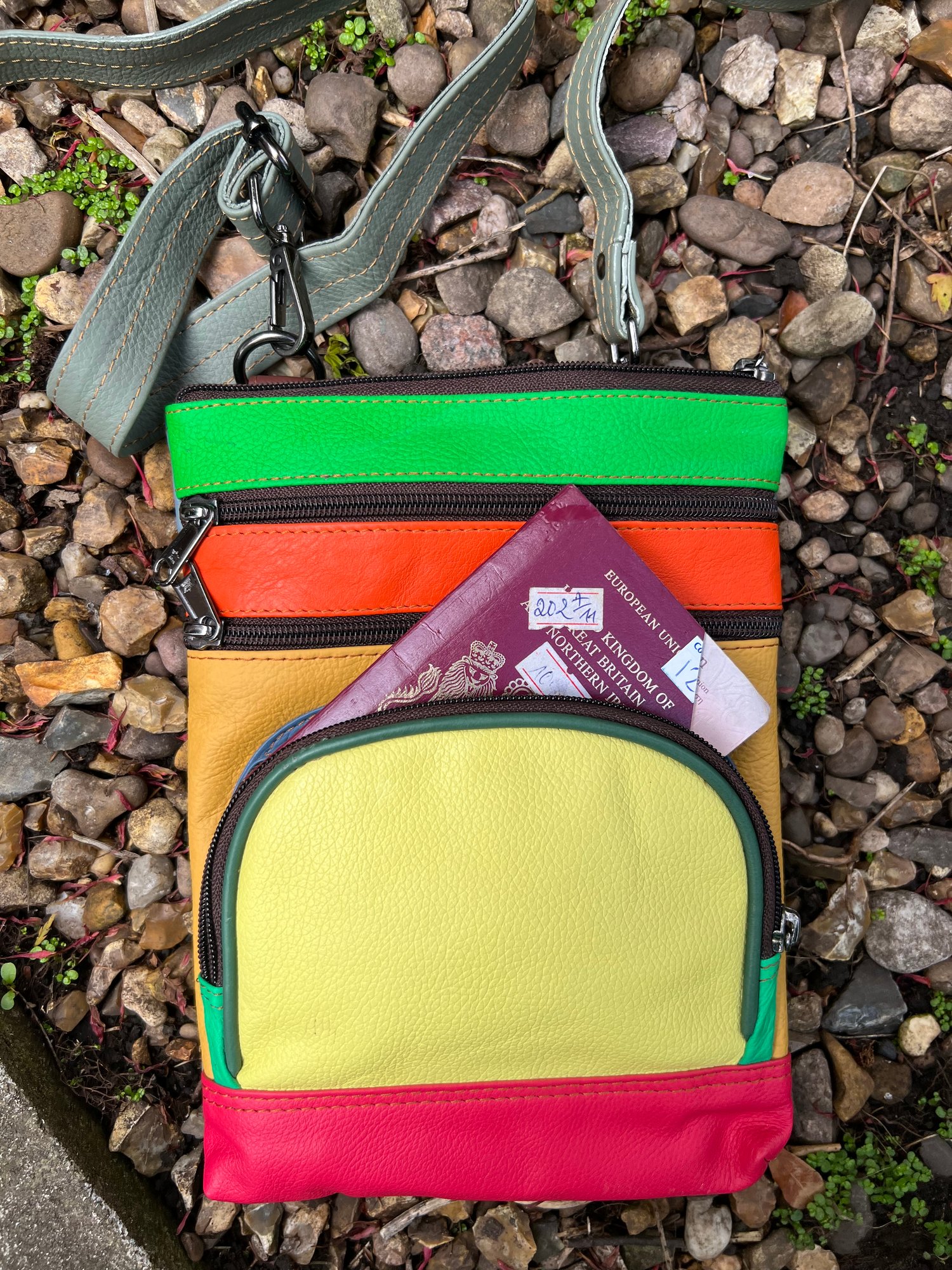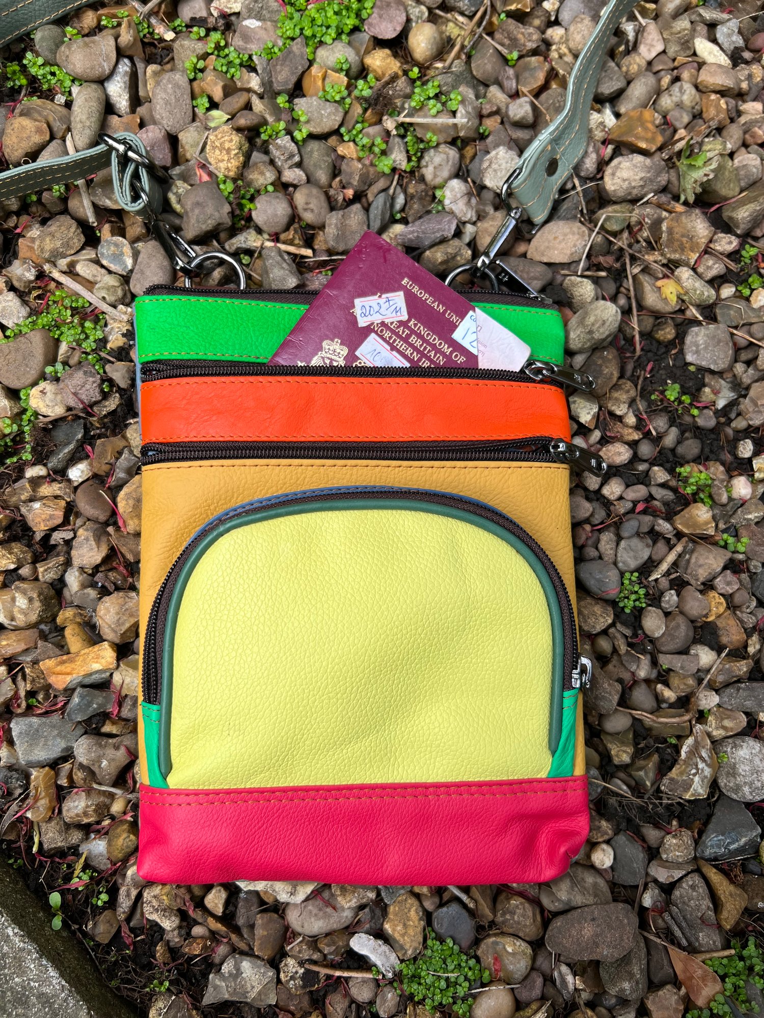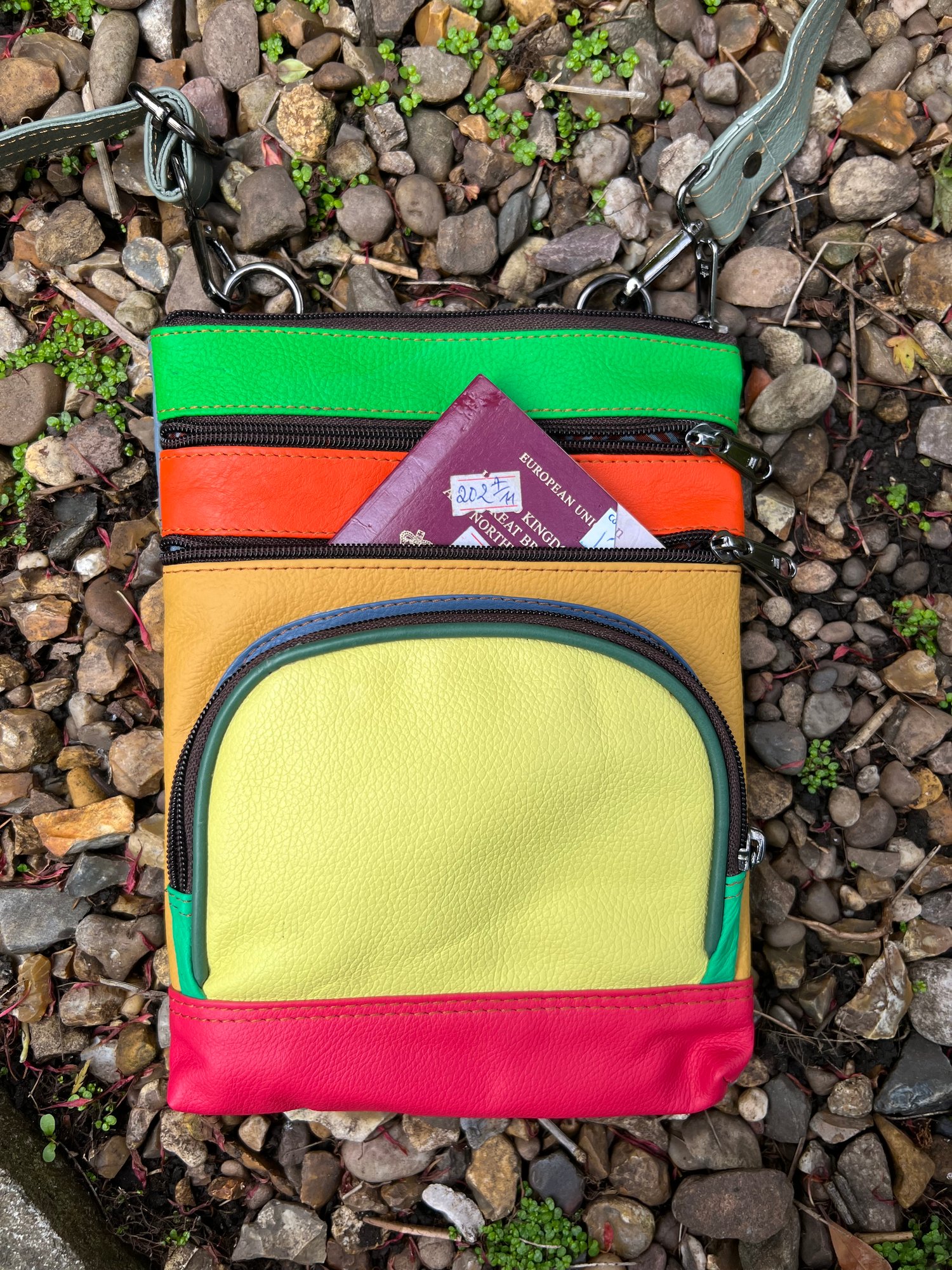 Our sustainable colourful leather bags are made for us in India using offcuts of leather which would otherwise go to landfill. They have been ethically crafted to produce both an unusual and unique bag.