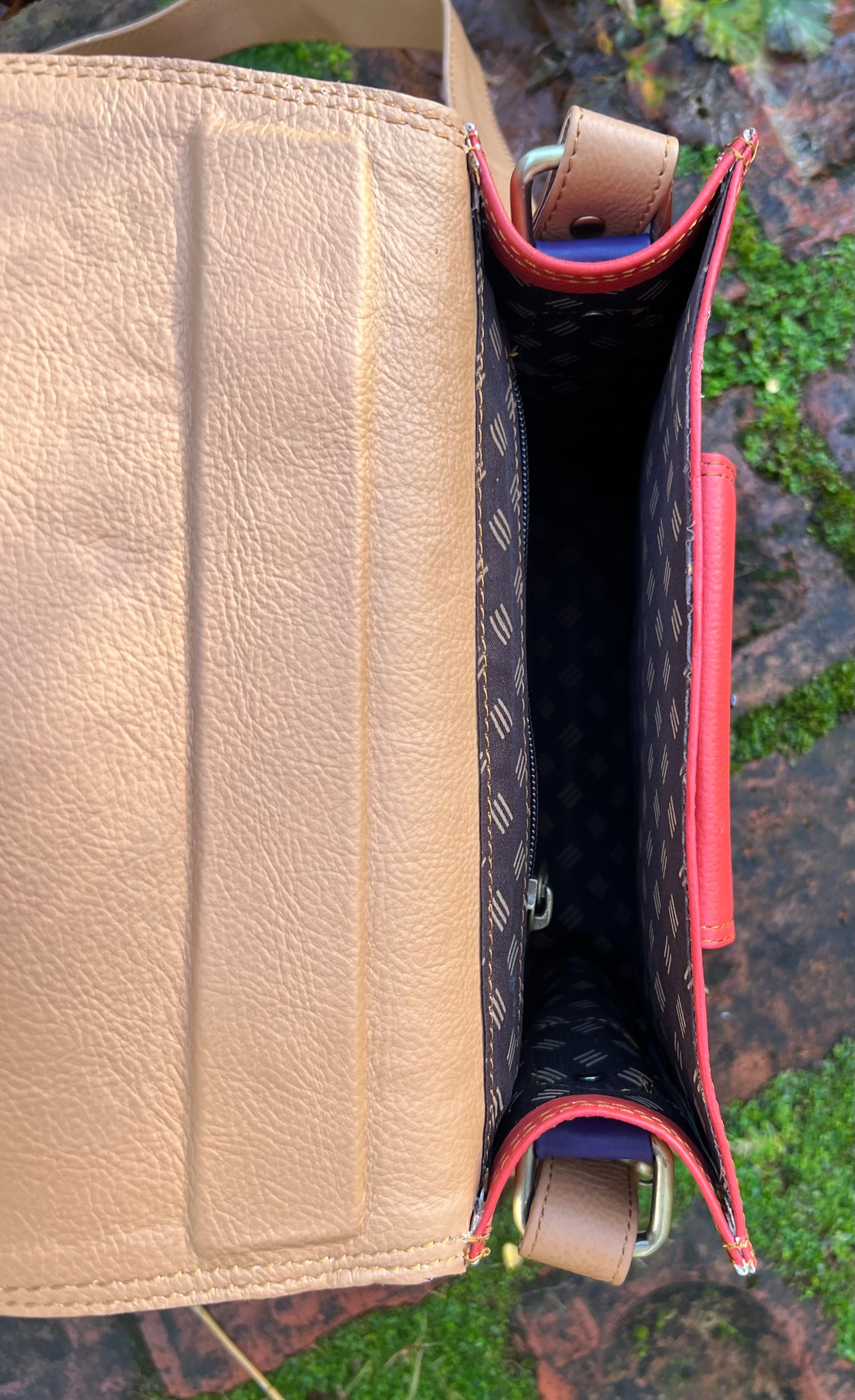 Externally, zipped pockets to the back & front plus further pocket to front, fastening with a magnetic stud beneath mock buckle, matching the 2 other fasteners.