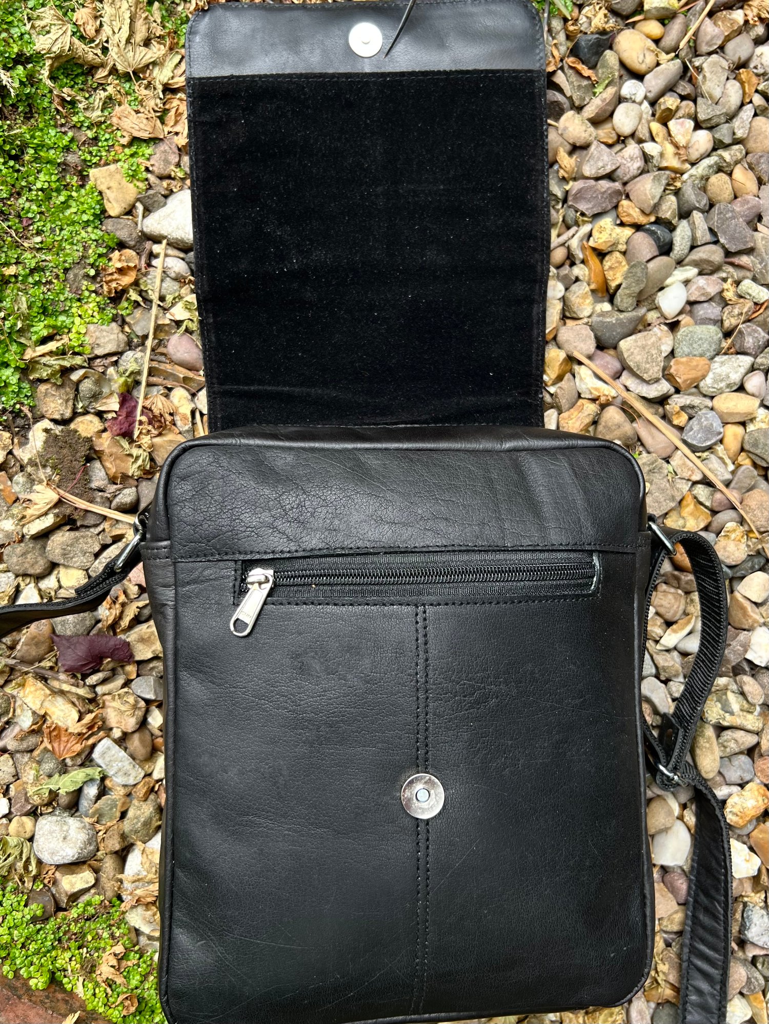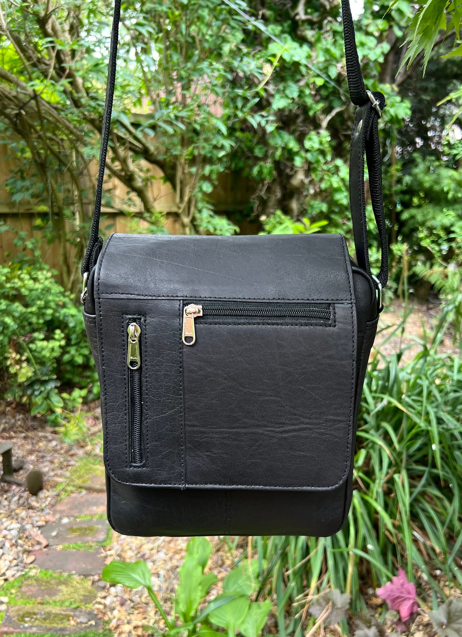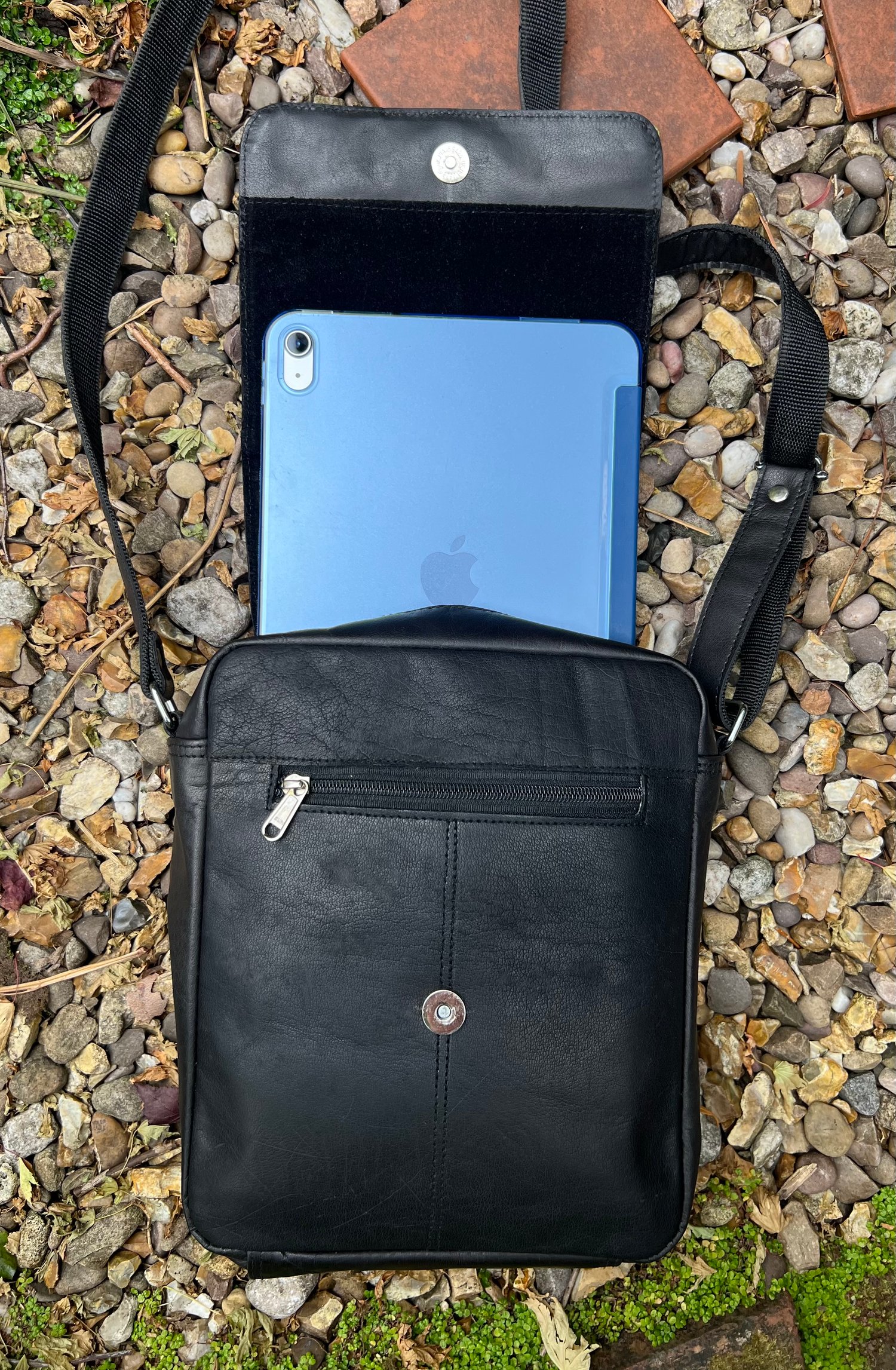 The bag fastens with a magnetic stud, and has an adjustable strap (140cm/55”).