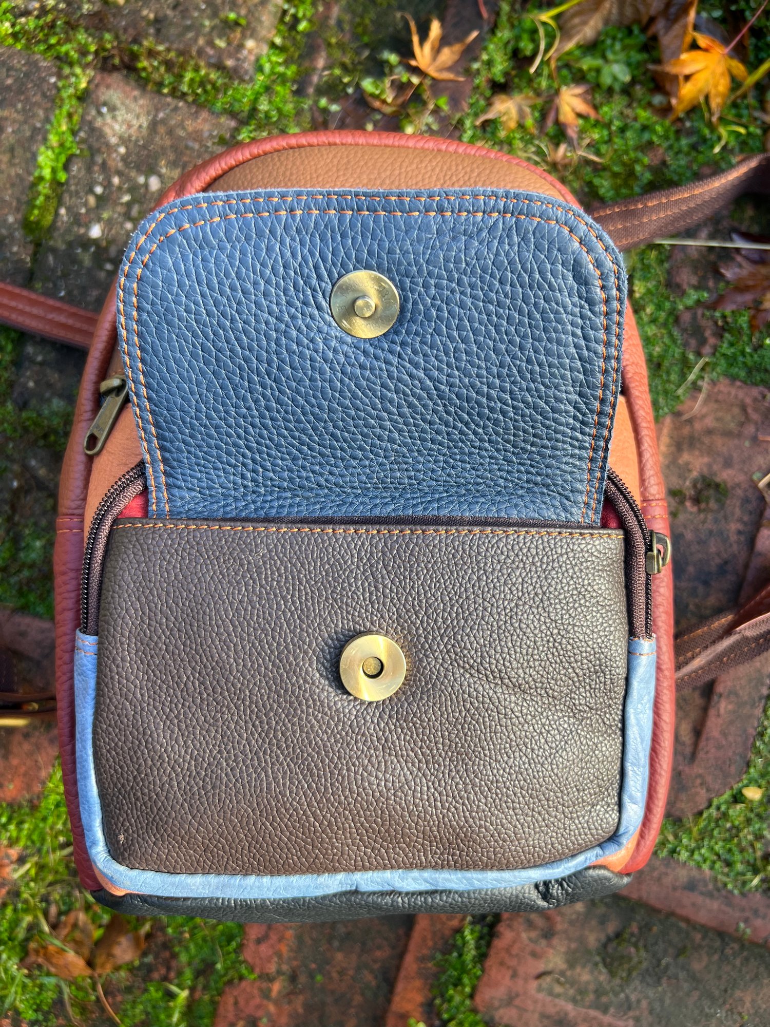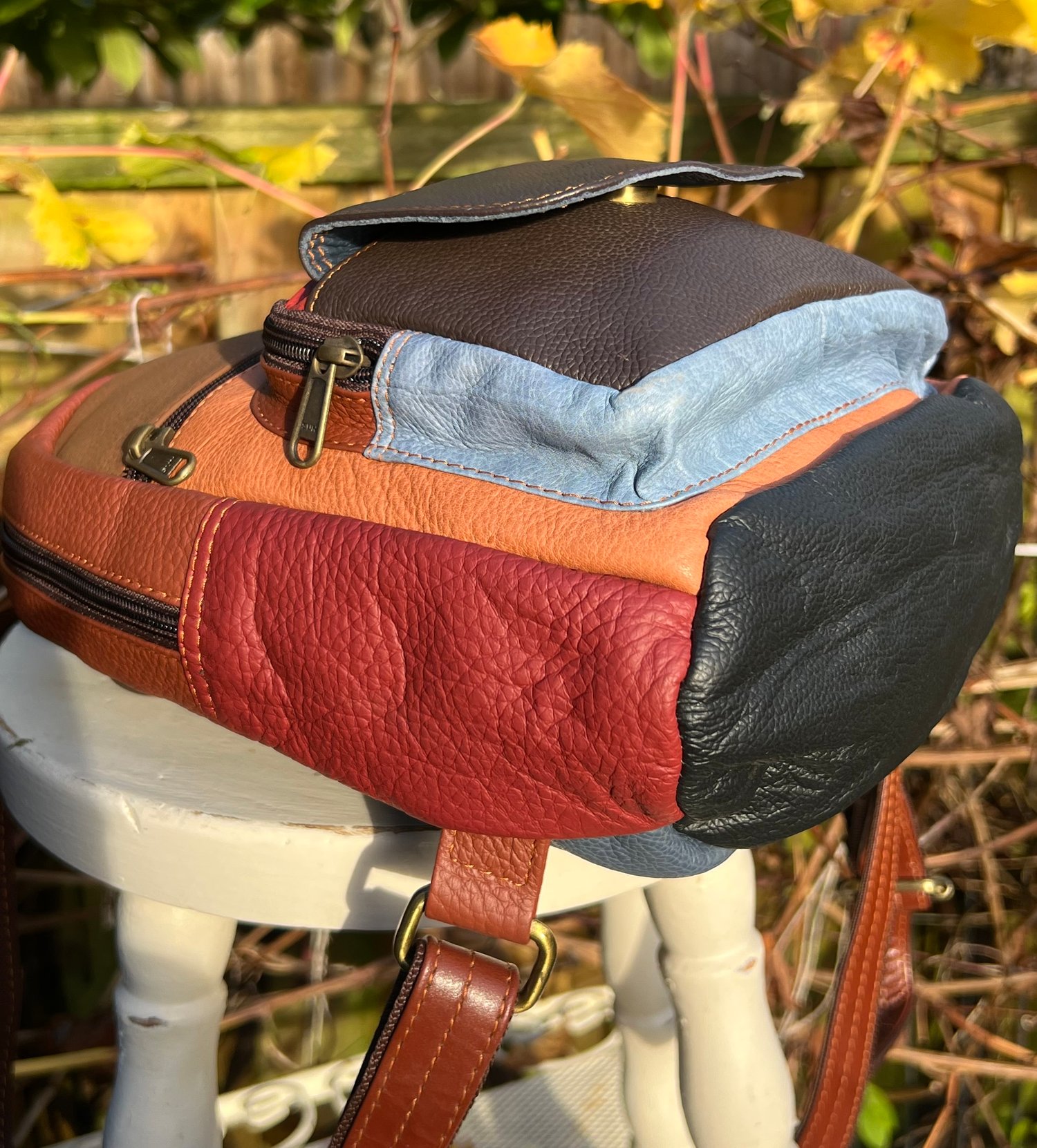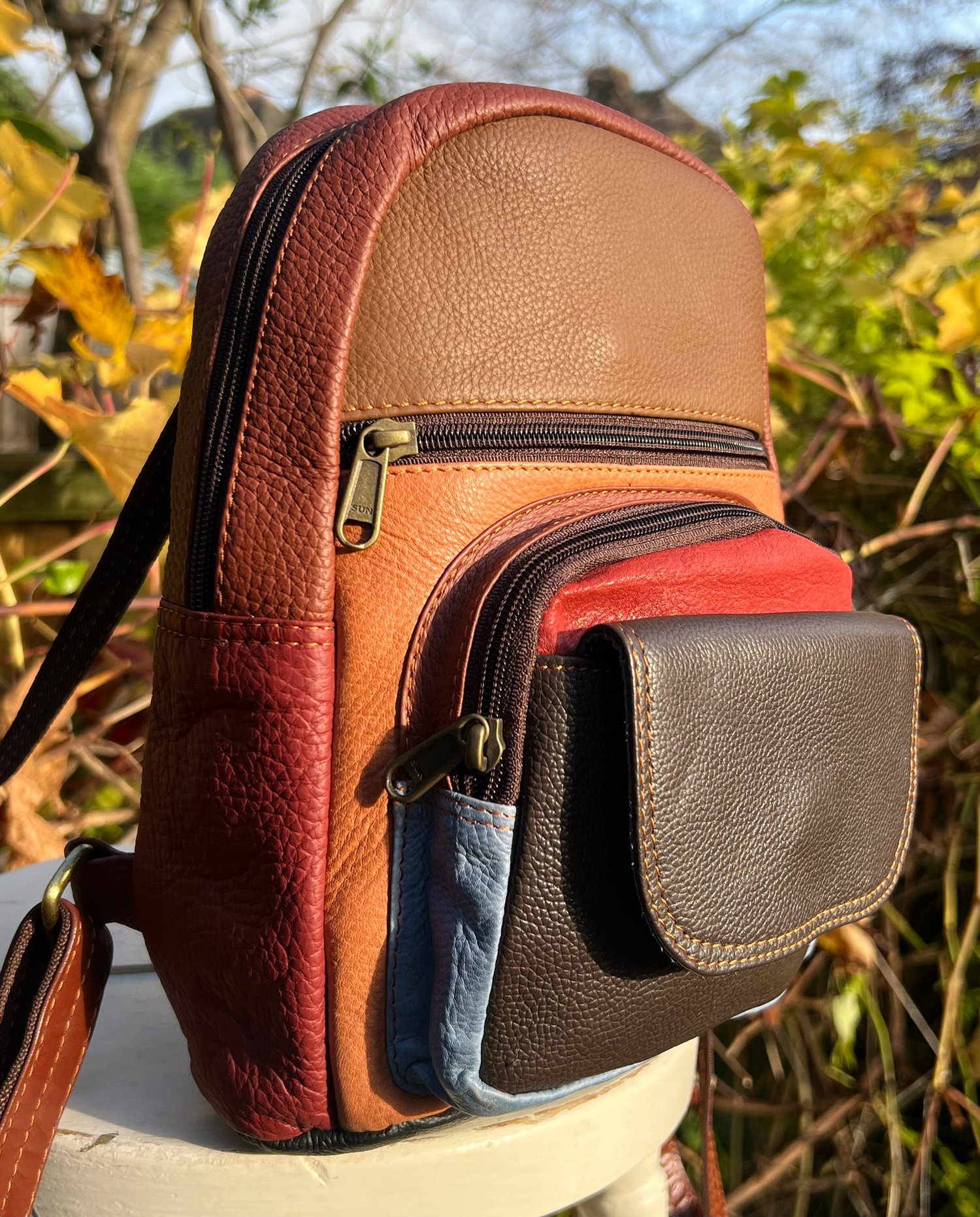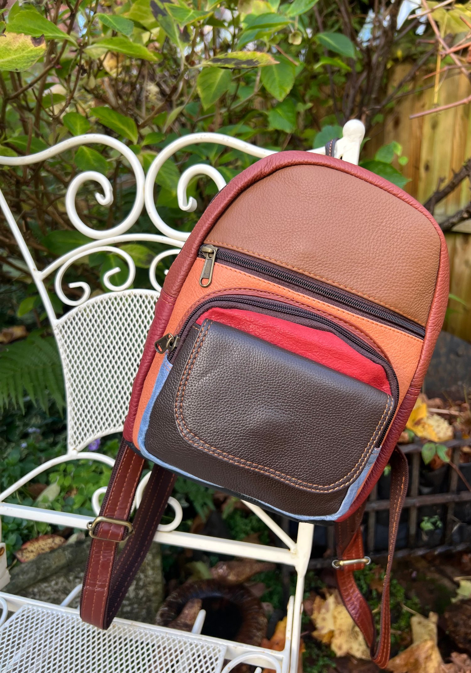 New to our Harlequin Collection is this multicoloured buffalo leather baby backpack. Made from discarded leather offcuts, each one of our bags is one-of-a-kind.