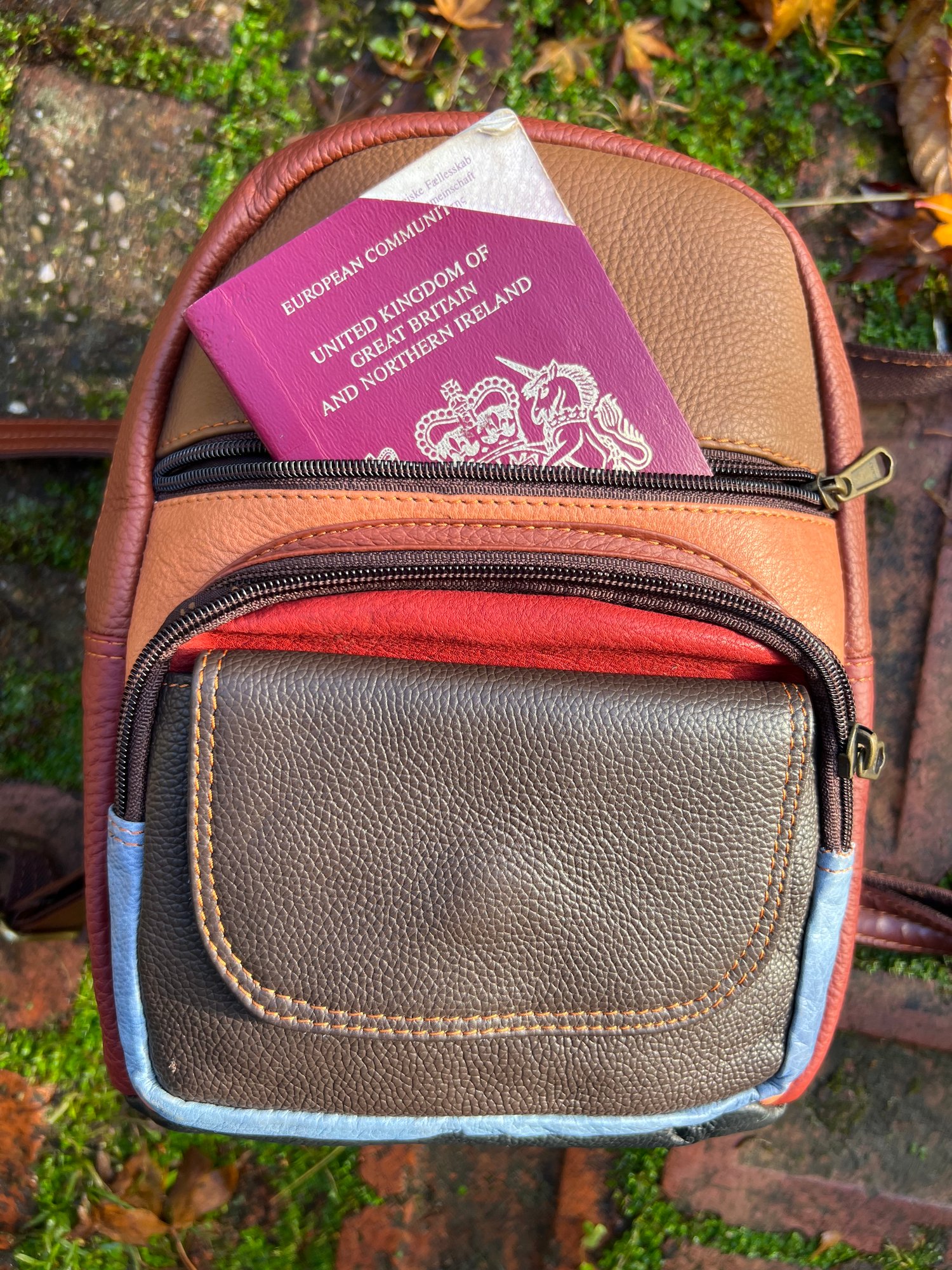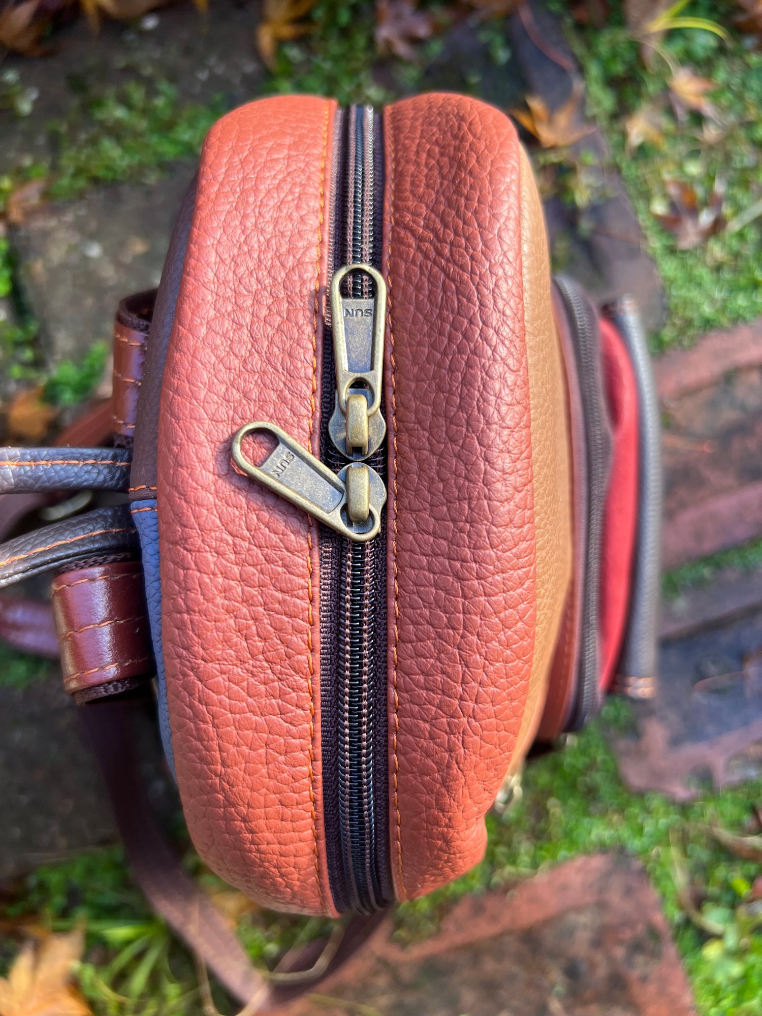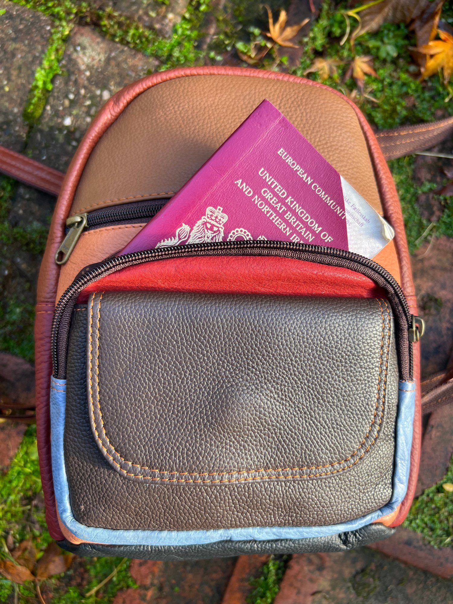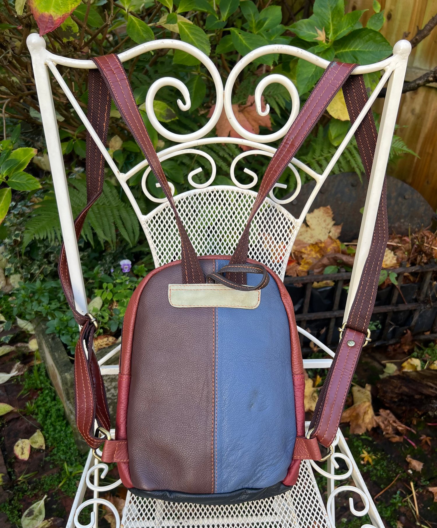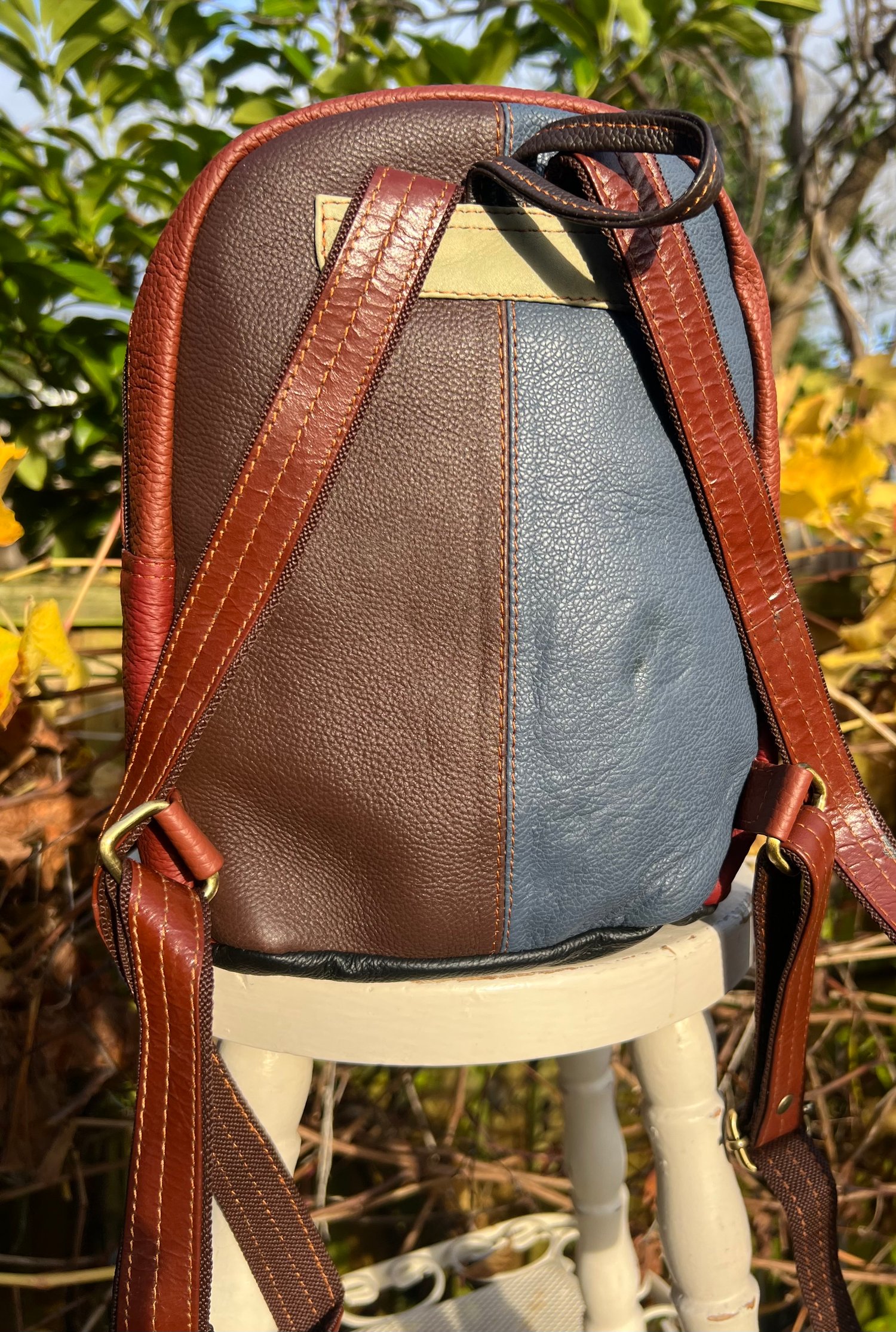 New to our Harlequin Collection is this multicoloured buffalo leather baby backpack. Made from discarded leather offcuts, each one of our bags is one-of-a-kind.