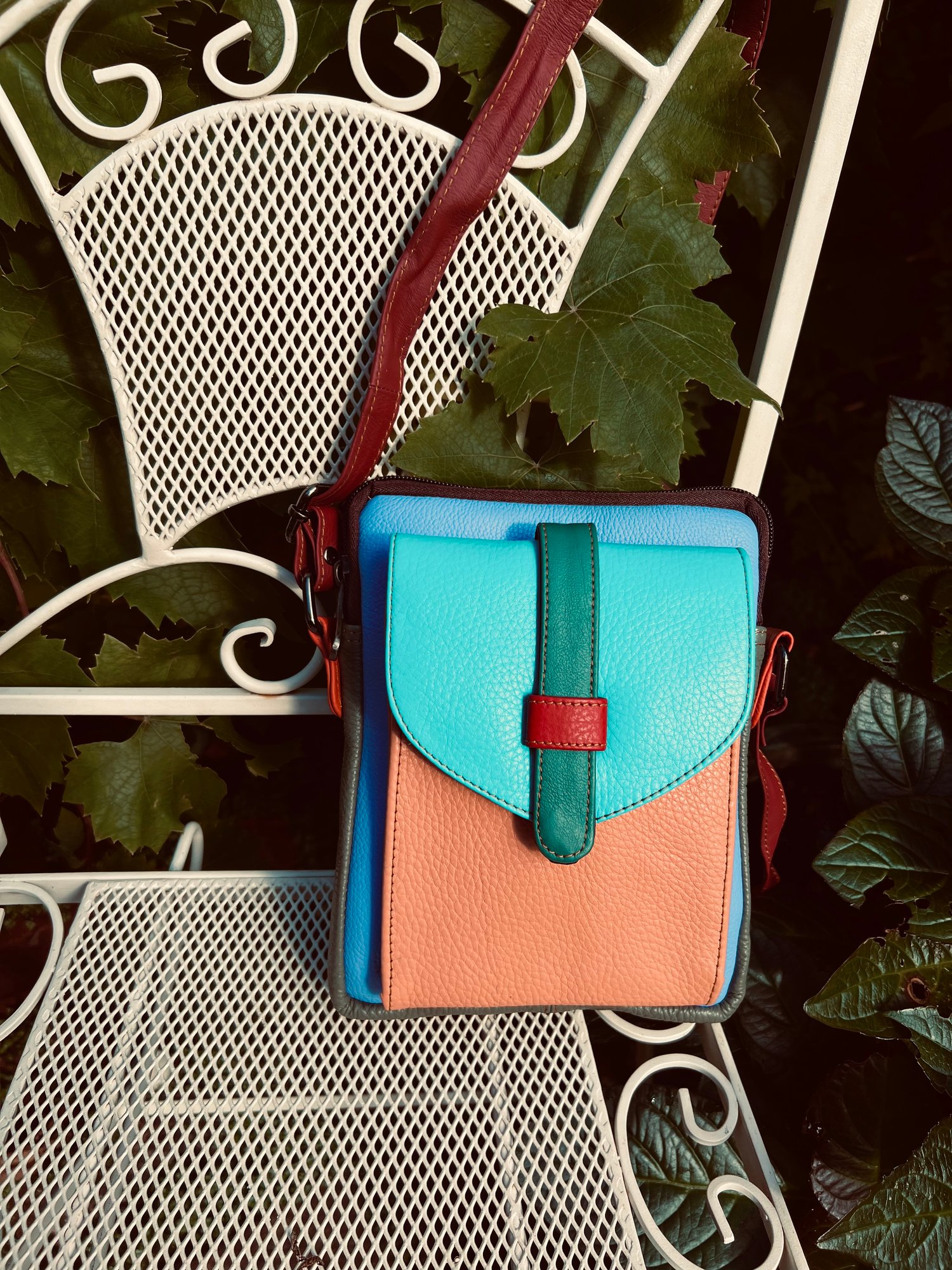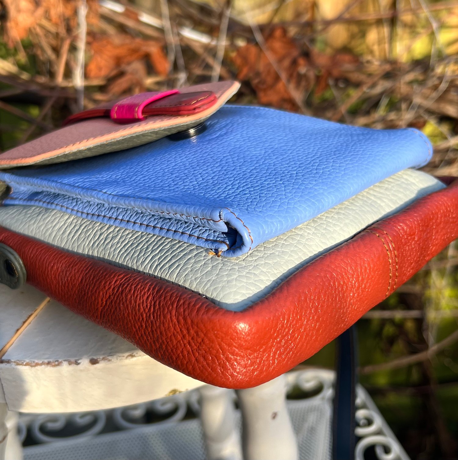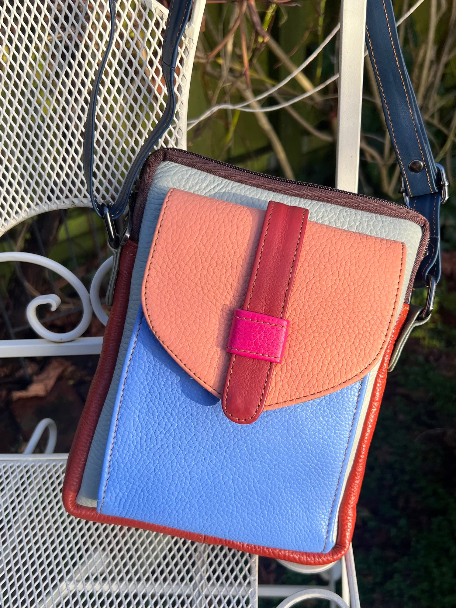 Our sustainable colourful leather bags are made for us in India using offcuts of leather which would otherwise go to landfill. They have been ethically crafted to produce both an unusual and unique bag.
