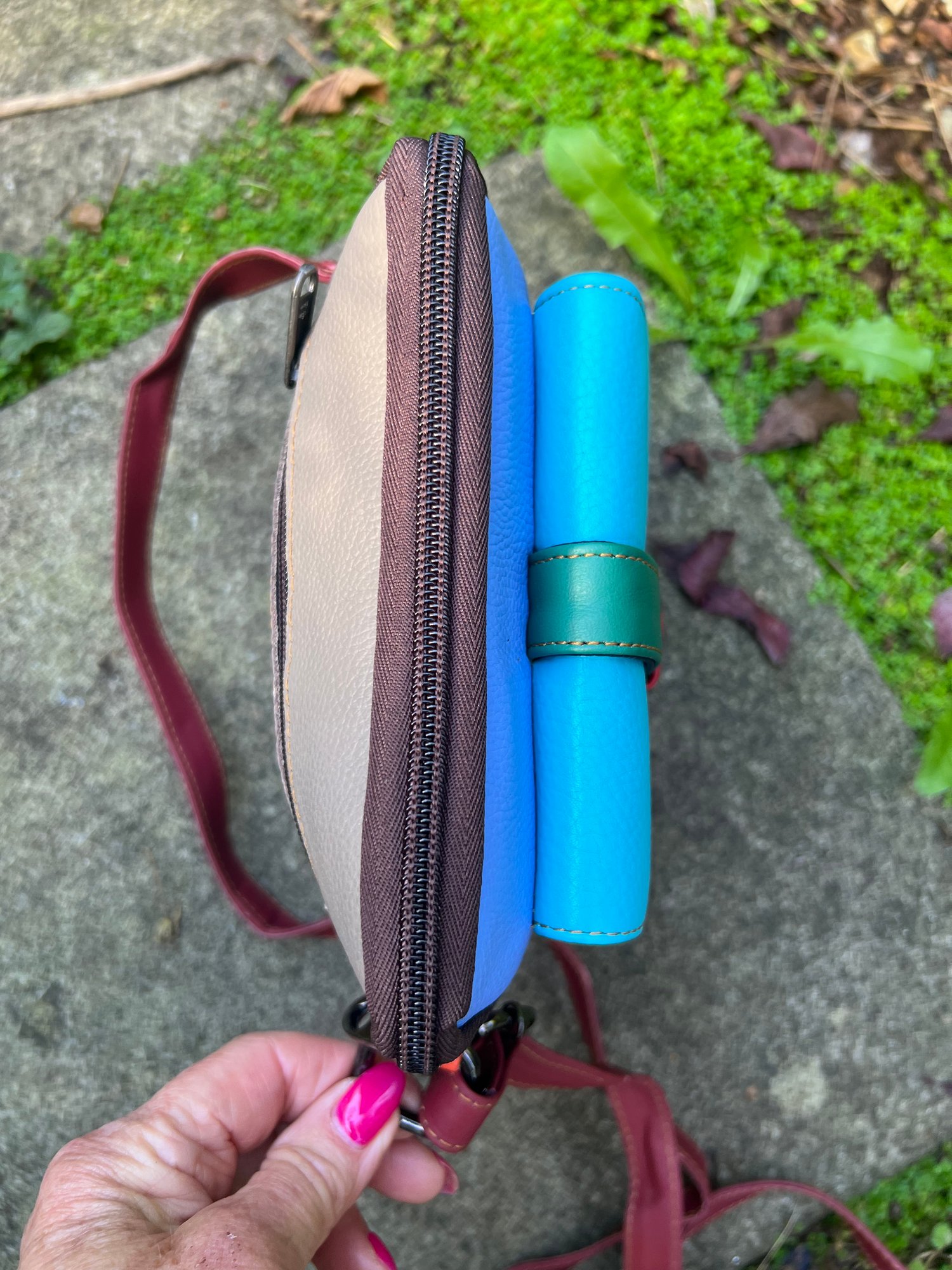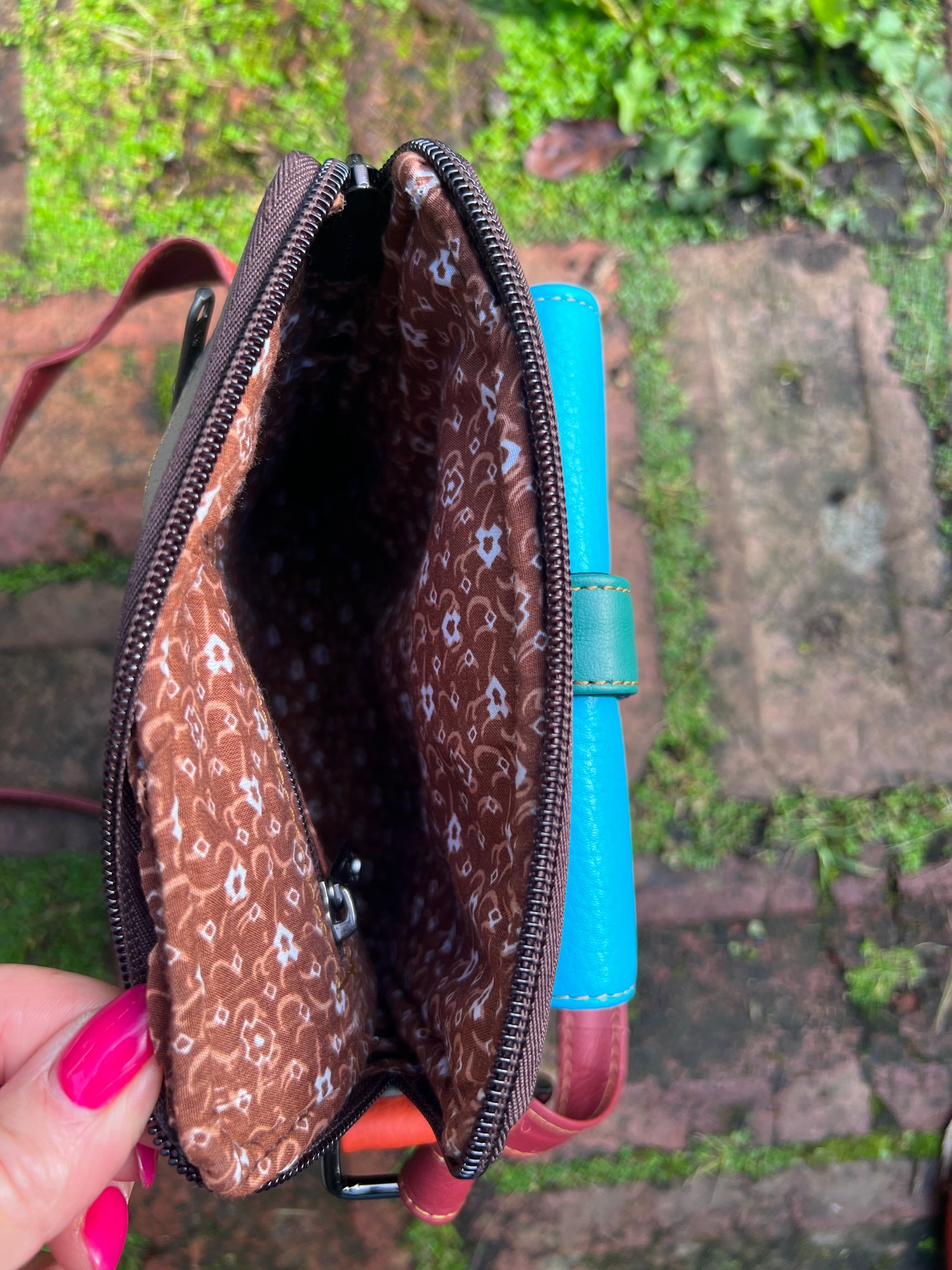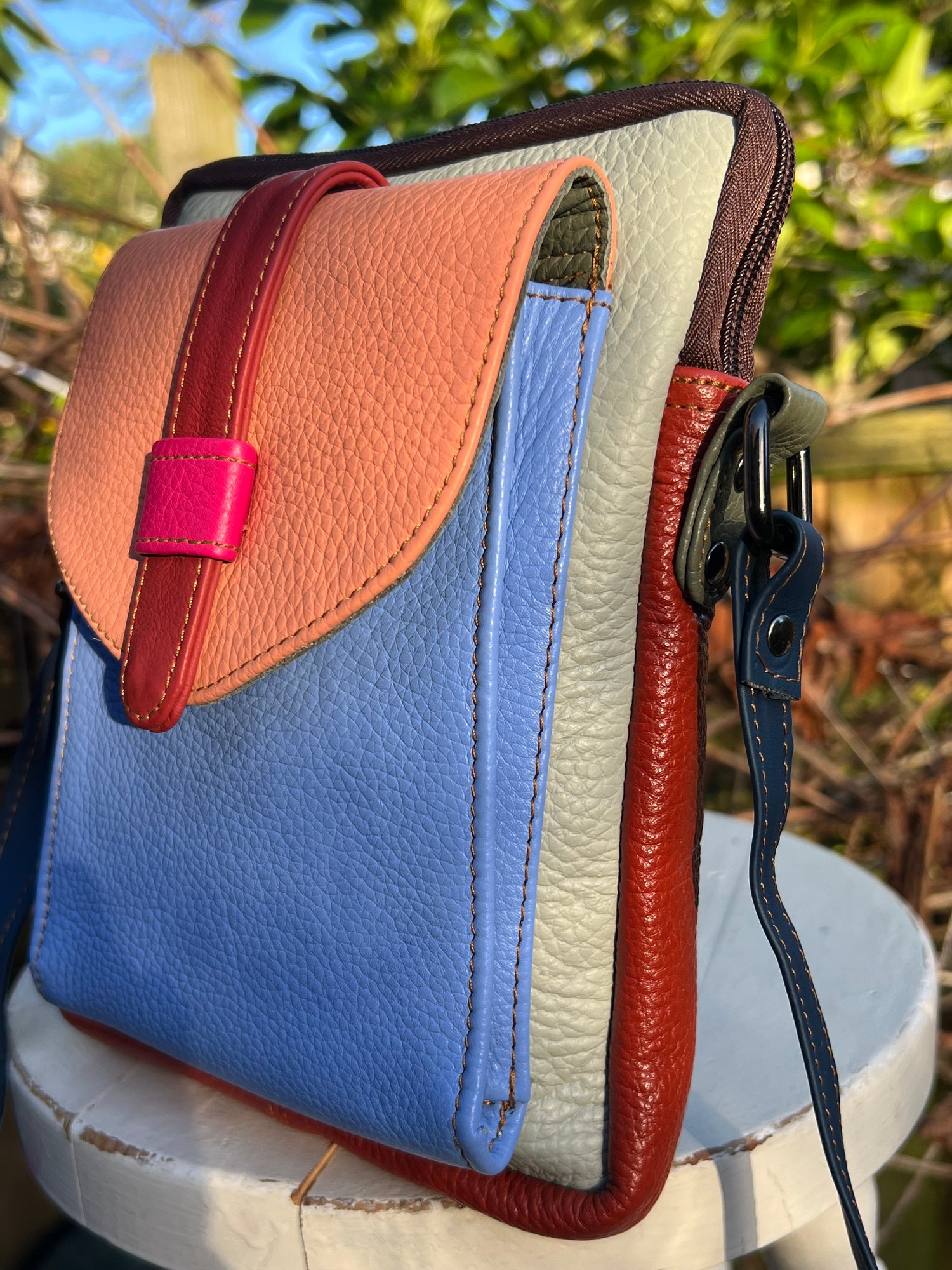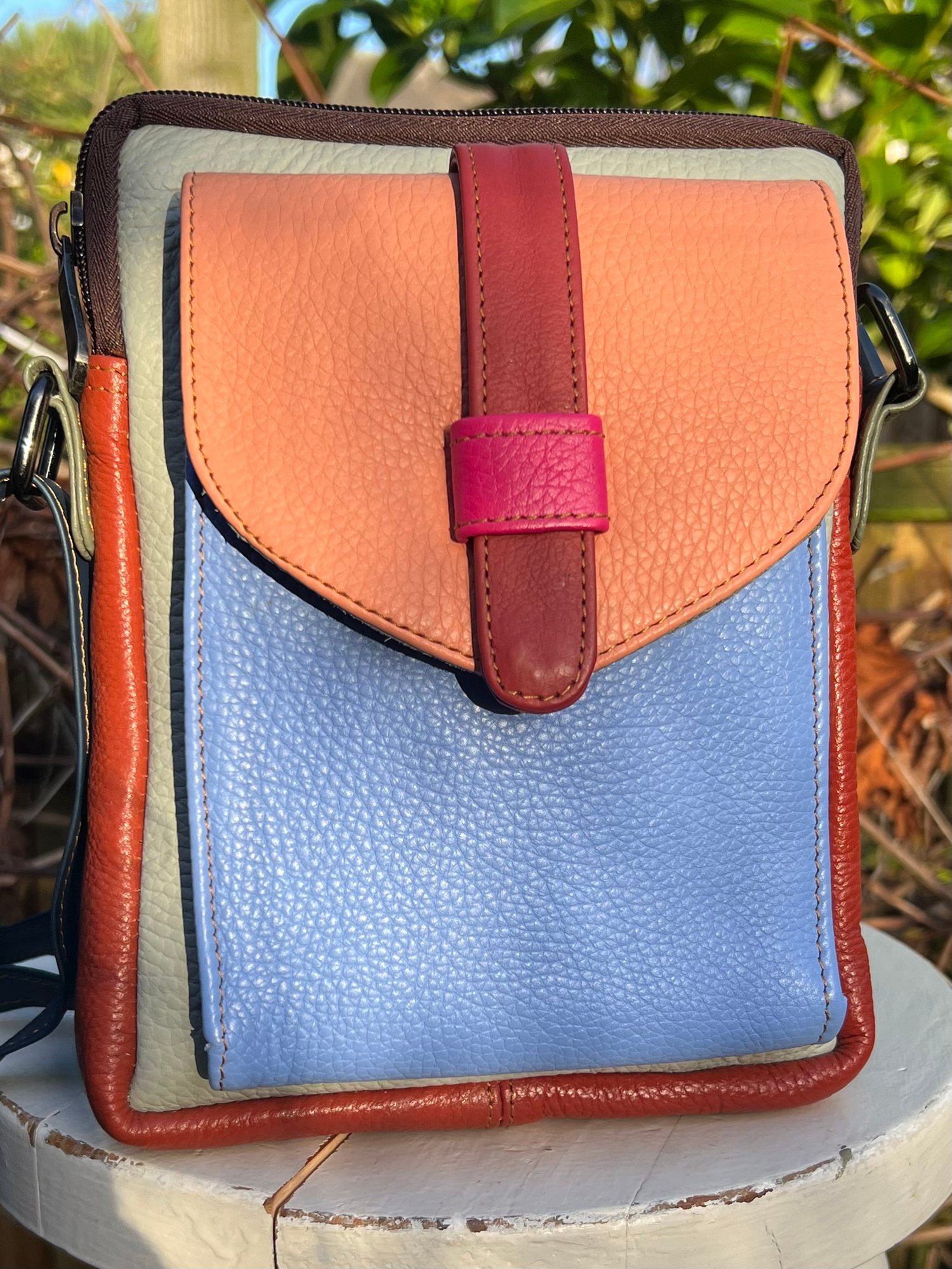 Our sustainable colourful leather bags are made for us in India using offcuts of leather which would otherwise go to landfill. They have been ethically crafted to produce both an unusual and unique bag.