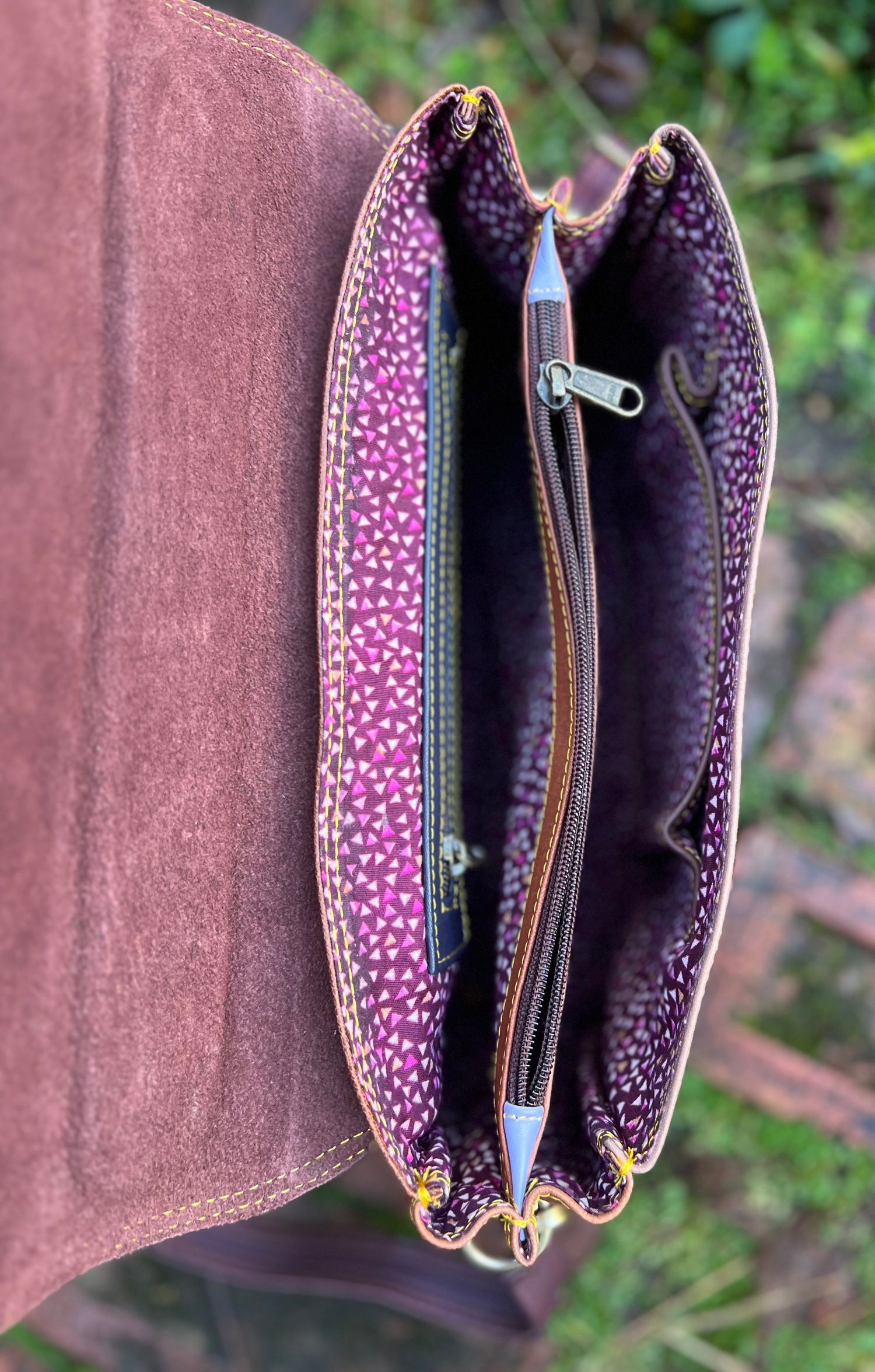 Inside, the bag is lined in attractive floral cotton fabric, and is divided into two sections by a central zipped compartment. There are additional zipped and open pockets.