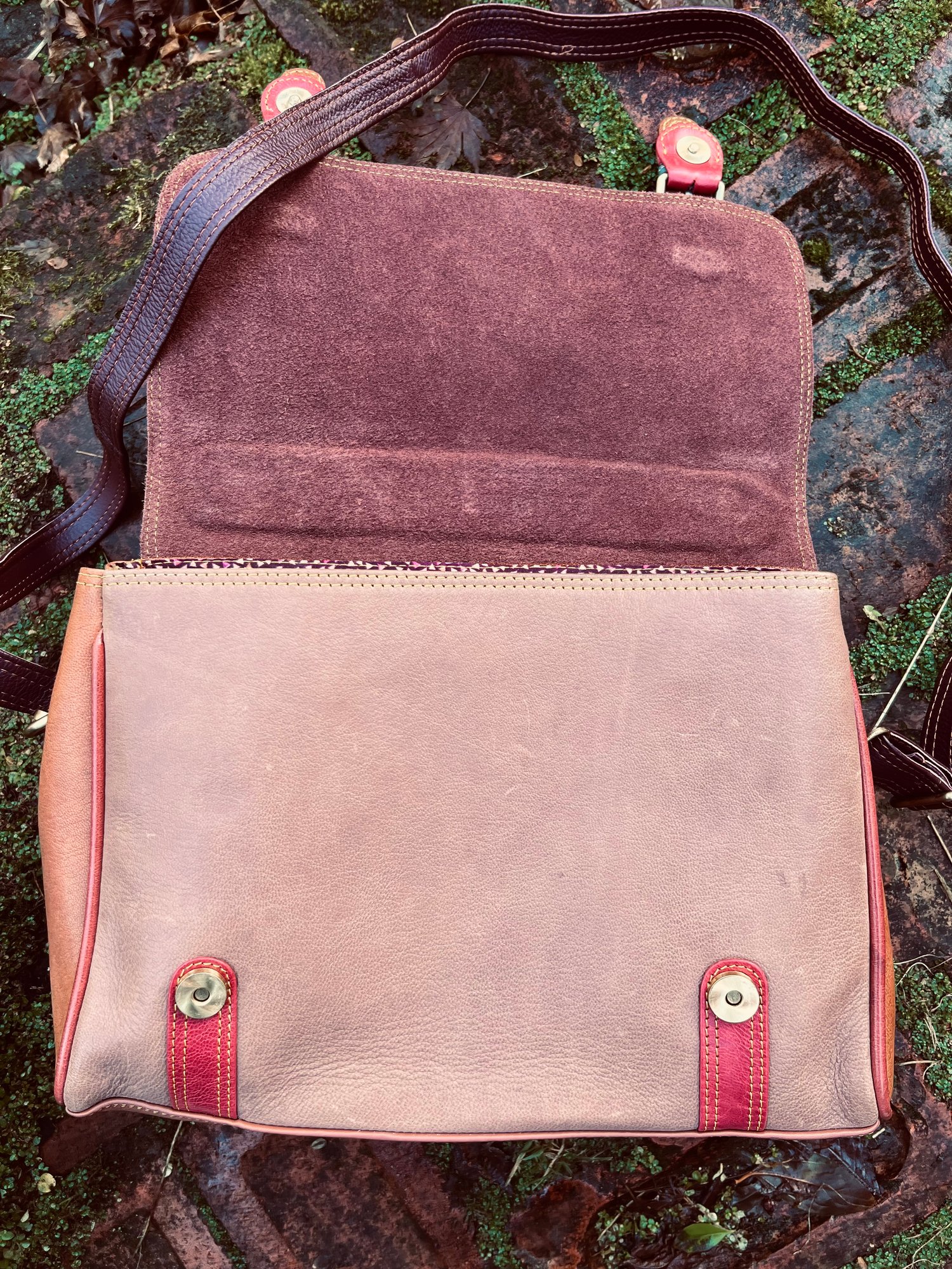 Externally, there is a zipped pocket to the back, metal “standing studs” on the bottom, a carry handle and long adjustable bolt-on shoulder/crossbody strap (50”). The bag fastens with two magnetic studs beneath mock buckles.