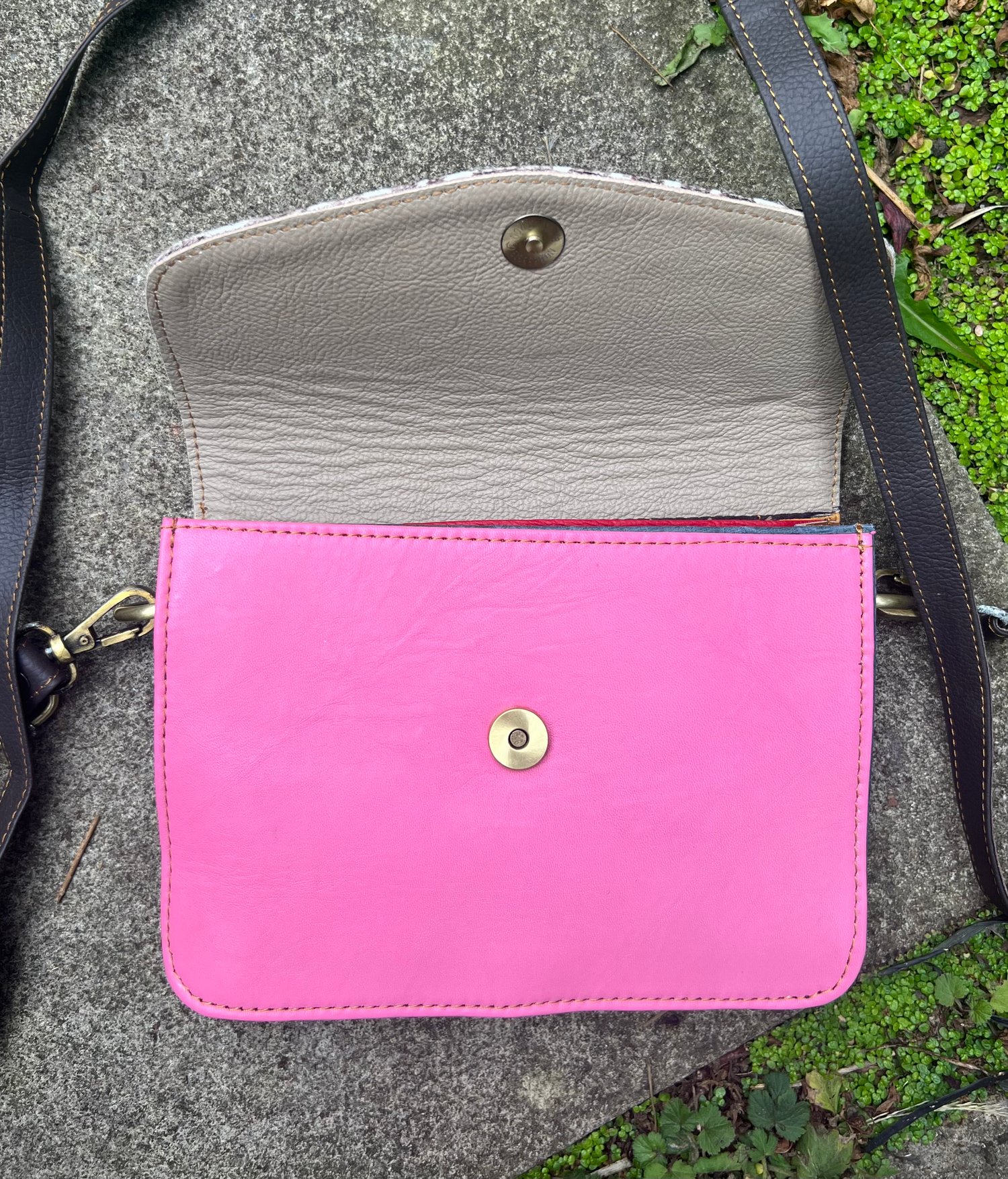 It has 3 internal compartments including a zipped pocket and  fastens with a concealed magnetic stud.