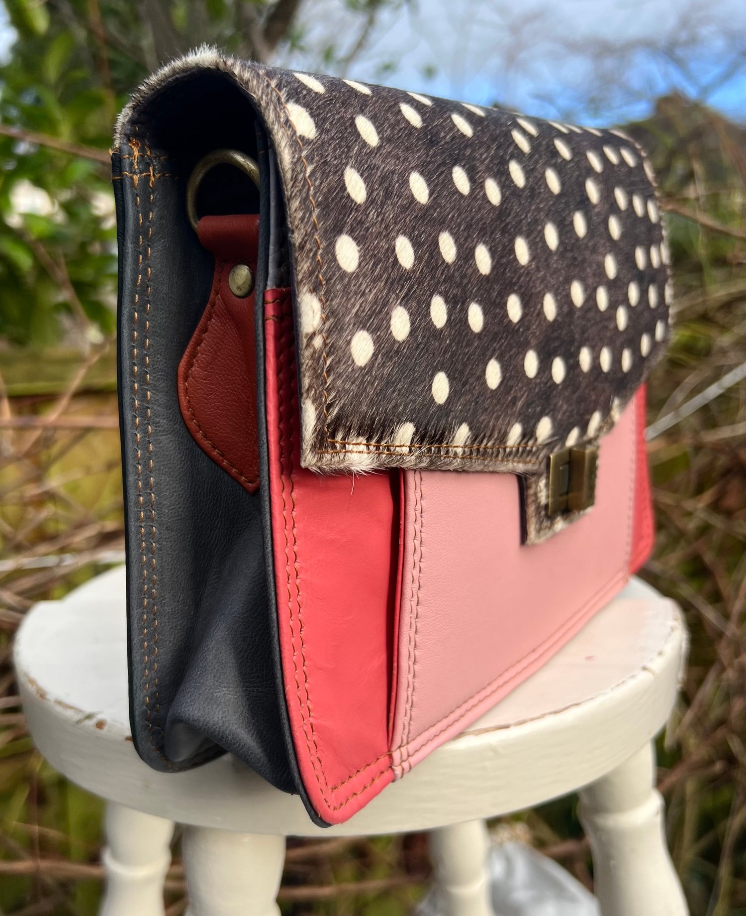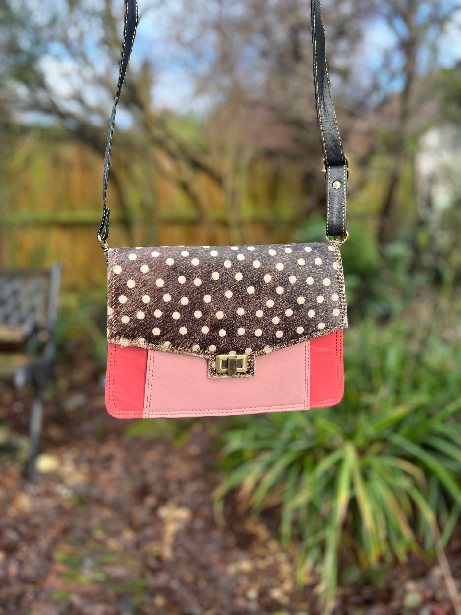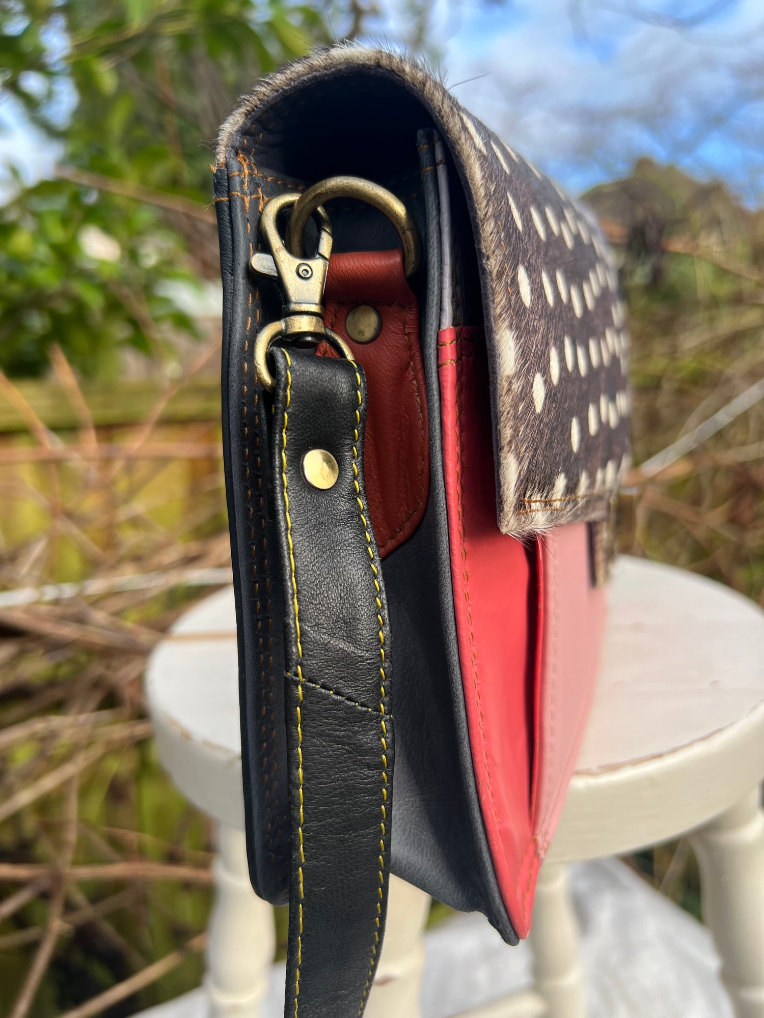 New to our Harlequin Collection is this leather/fur shoulder bag which is made in India from offcuts which would otherwise go to landfill.