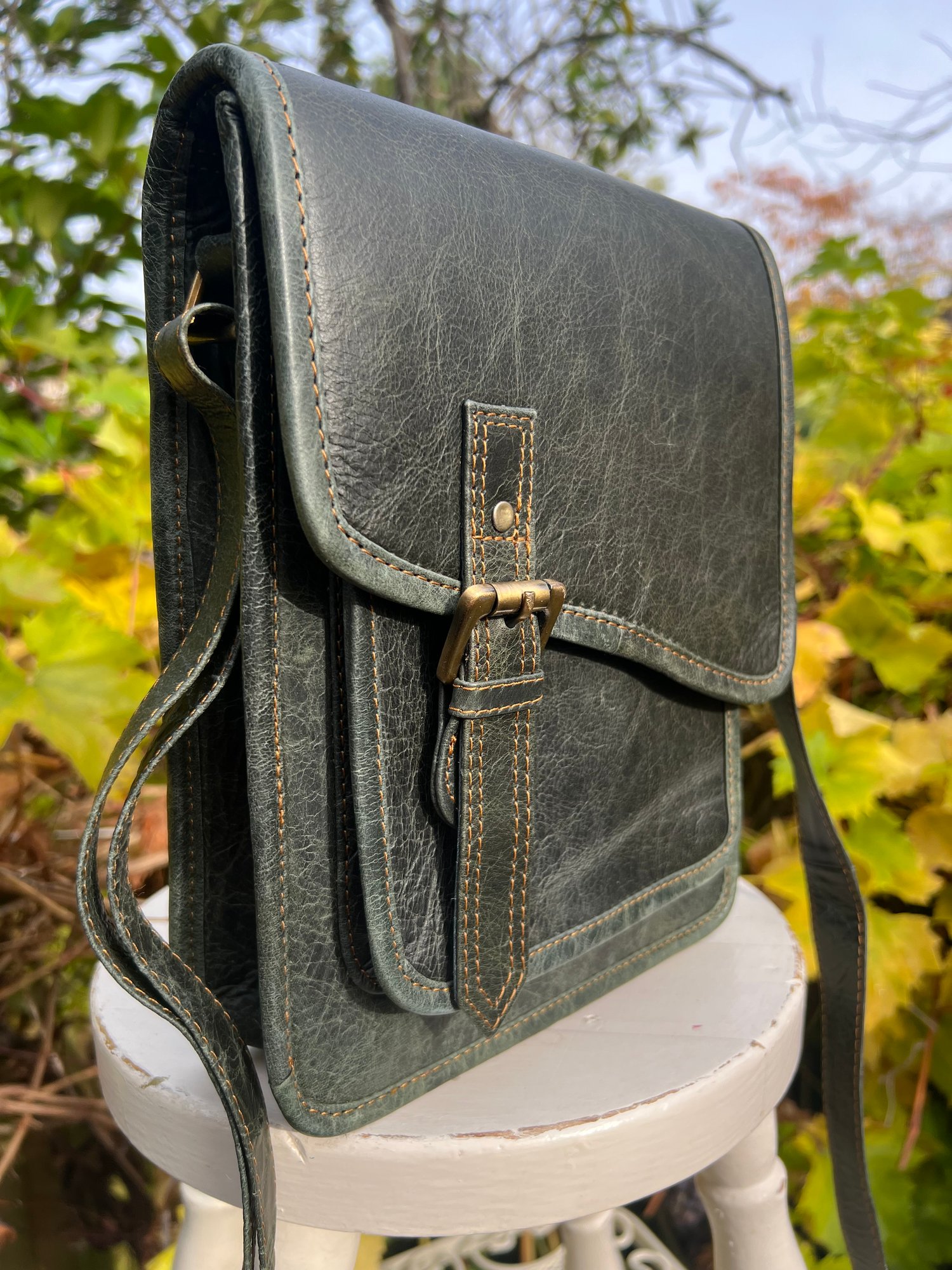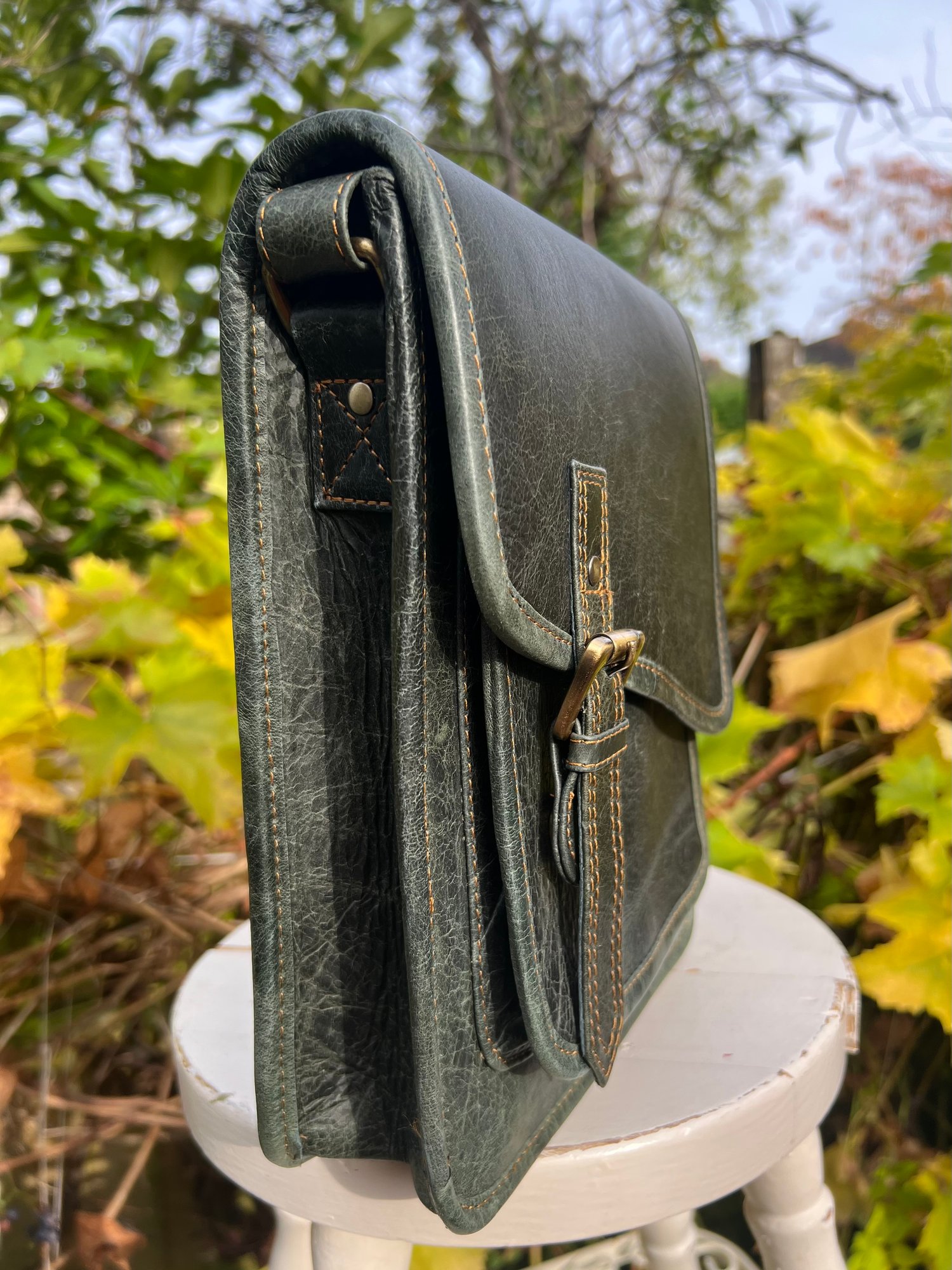 Stylish buffalo leather bag in dark green.