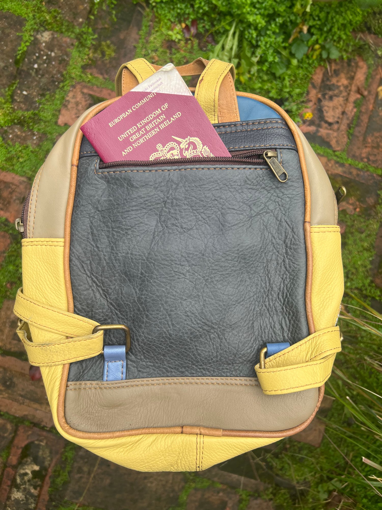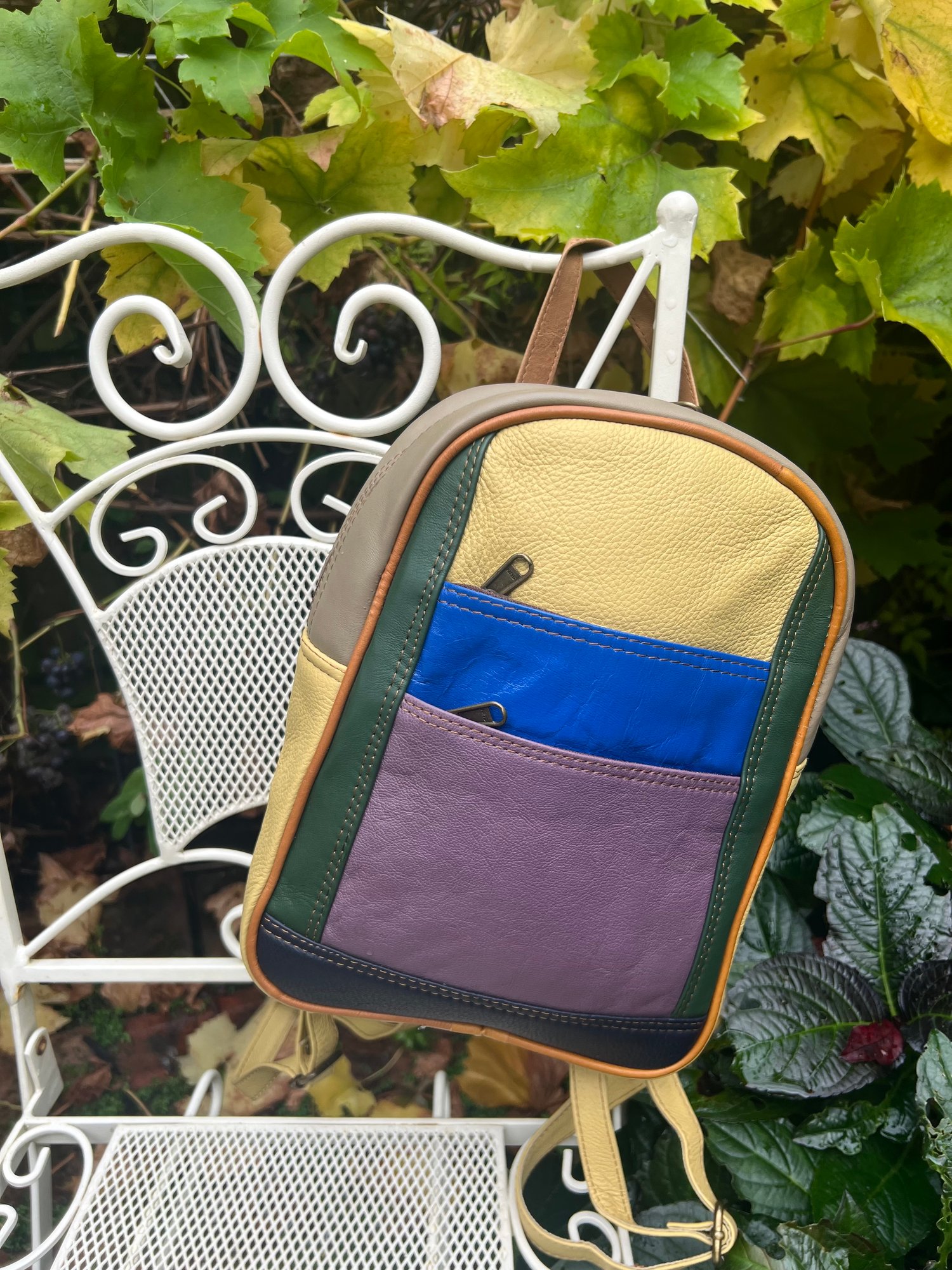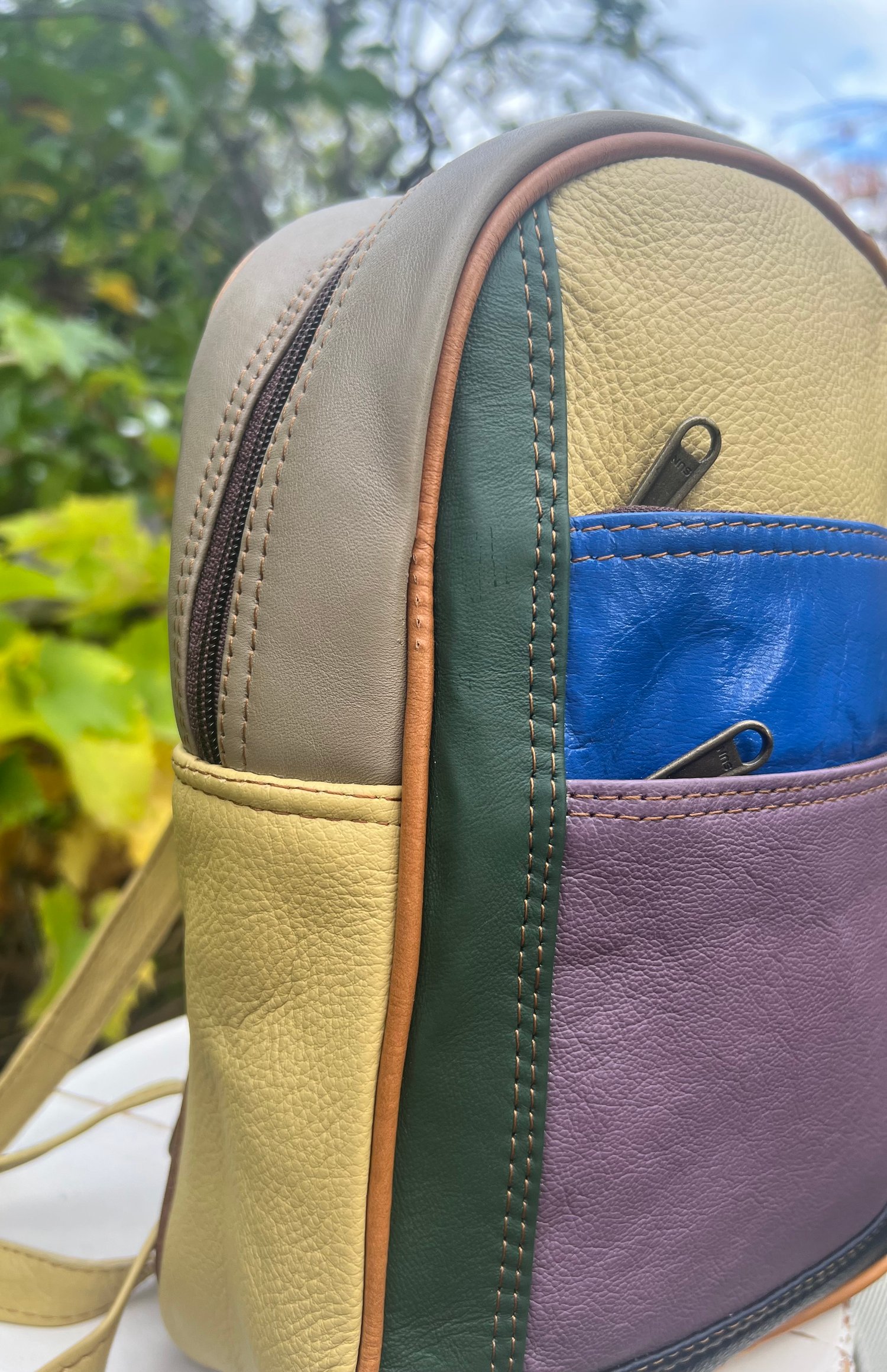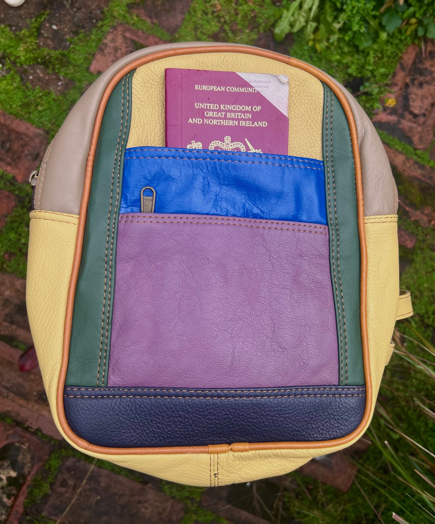 New to our Harlequin Collection is this multicoloured buffalo leather baby backpack. Made from discarded leather offcuts, each one of our bags is one-of-a-kind.