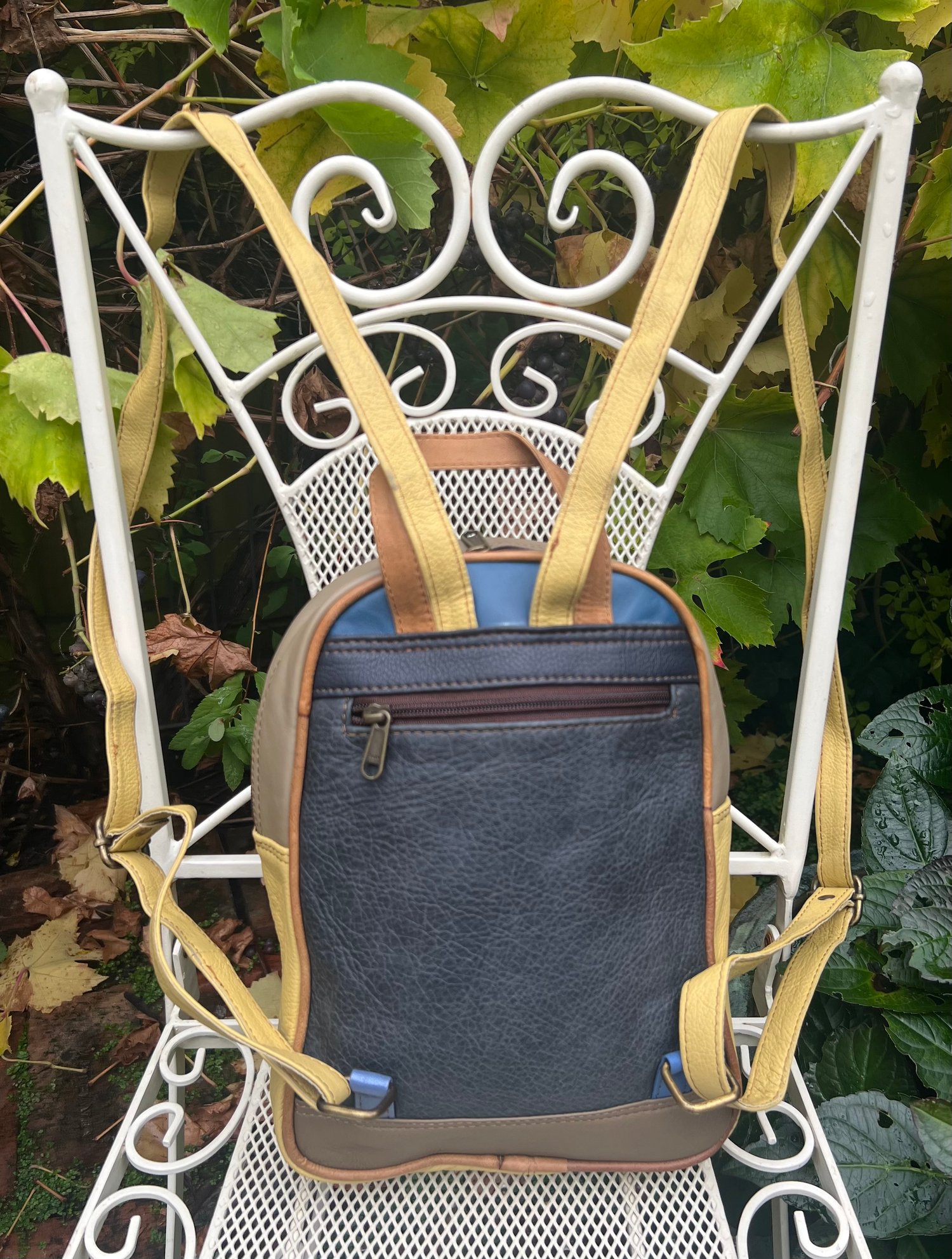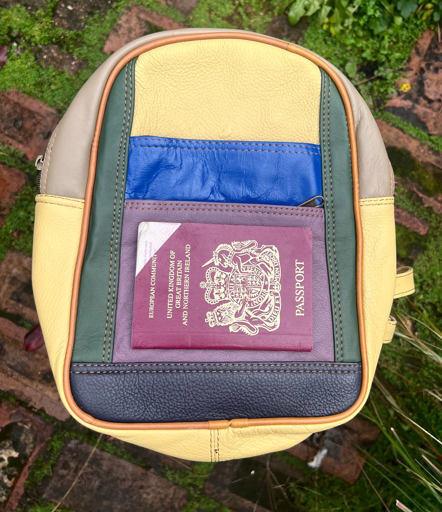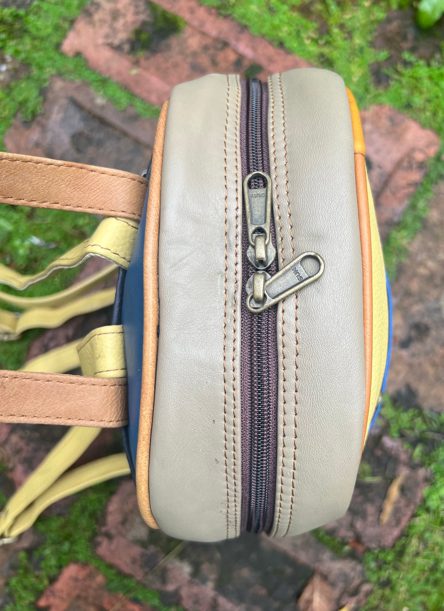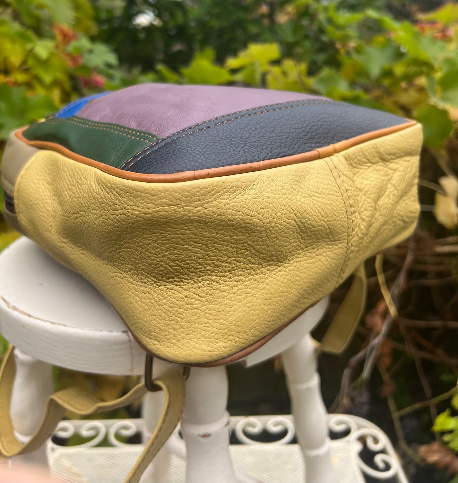 New to our Harlequin Collection is this multicoloured buffalo leather baby backpack. Made from discarded leather offcuts, each one of our bags is one-of-a-kind.