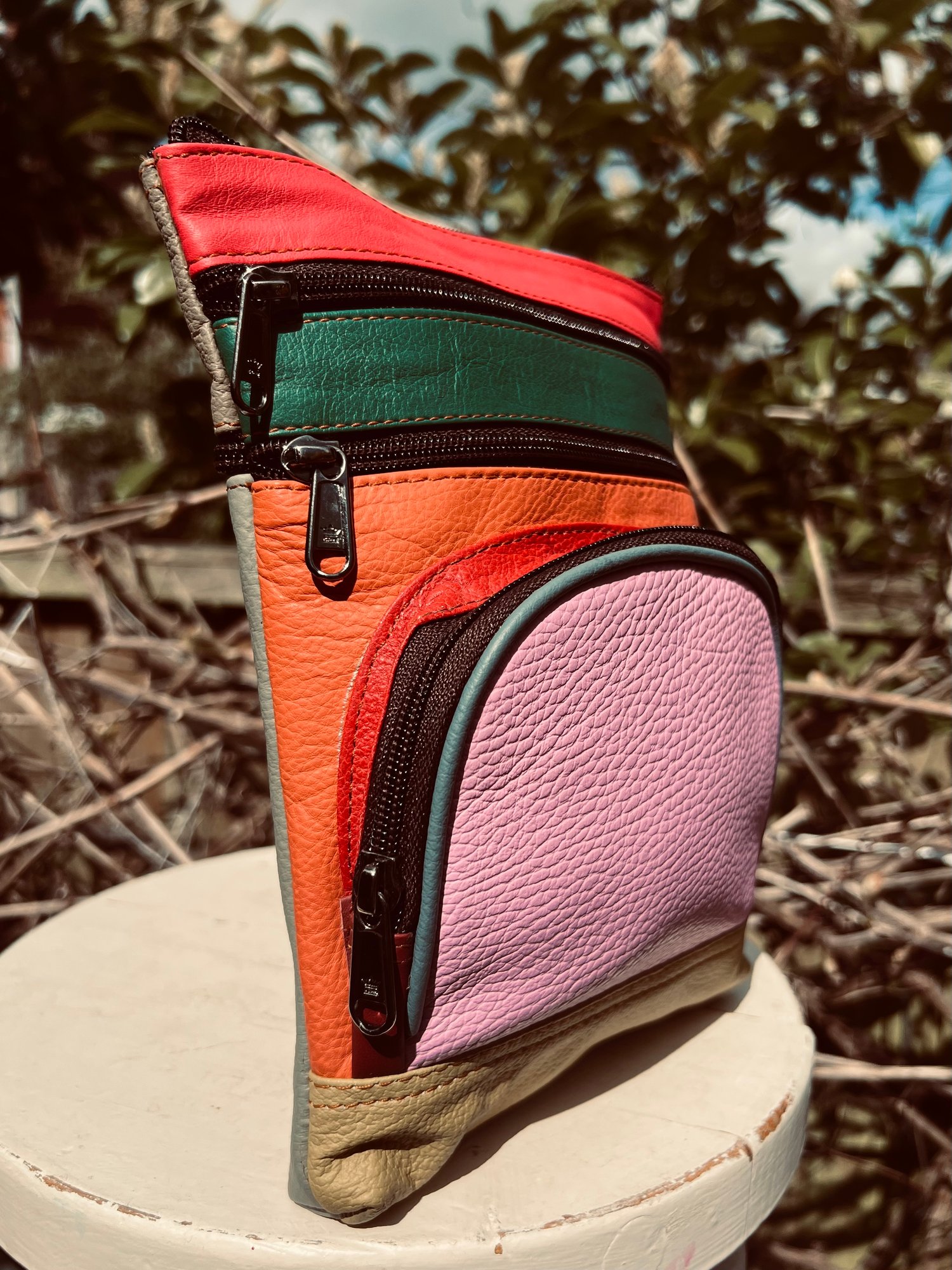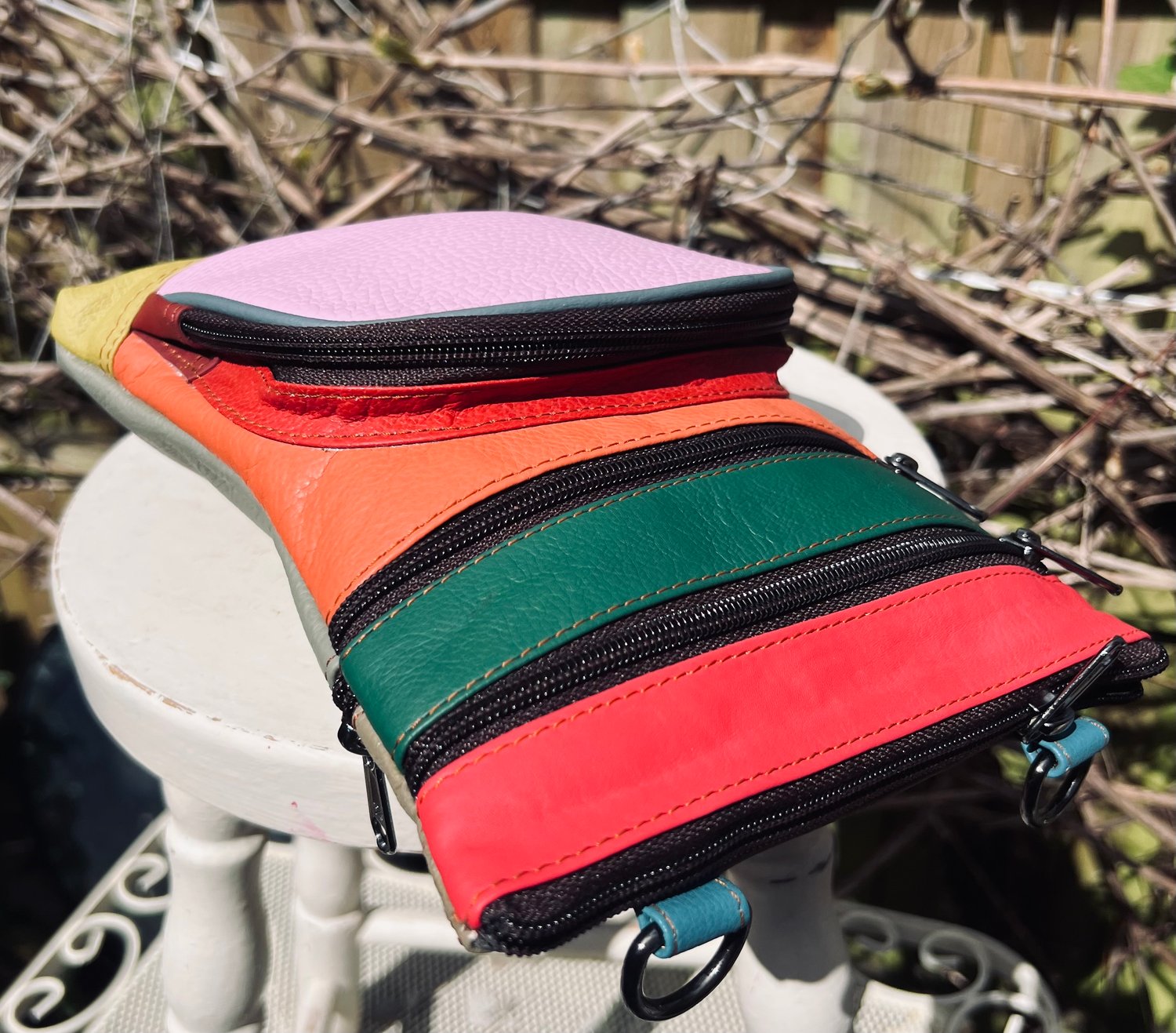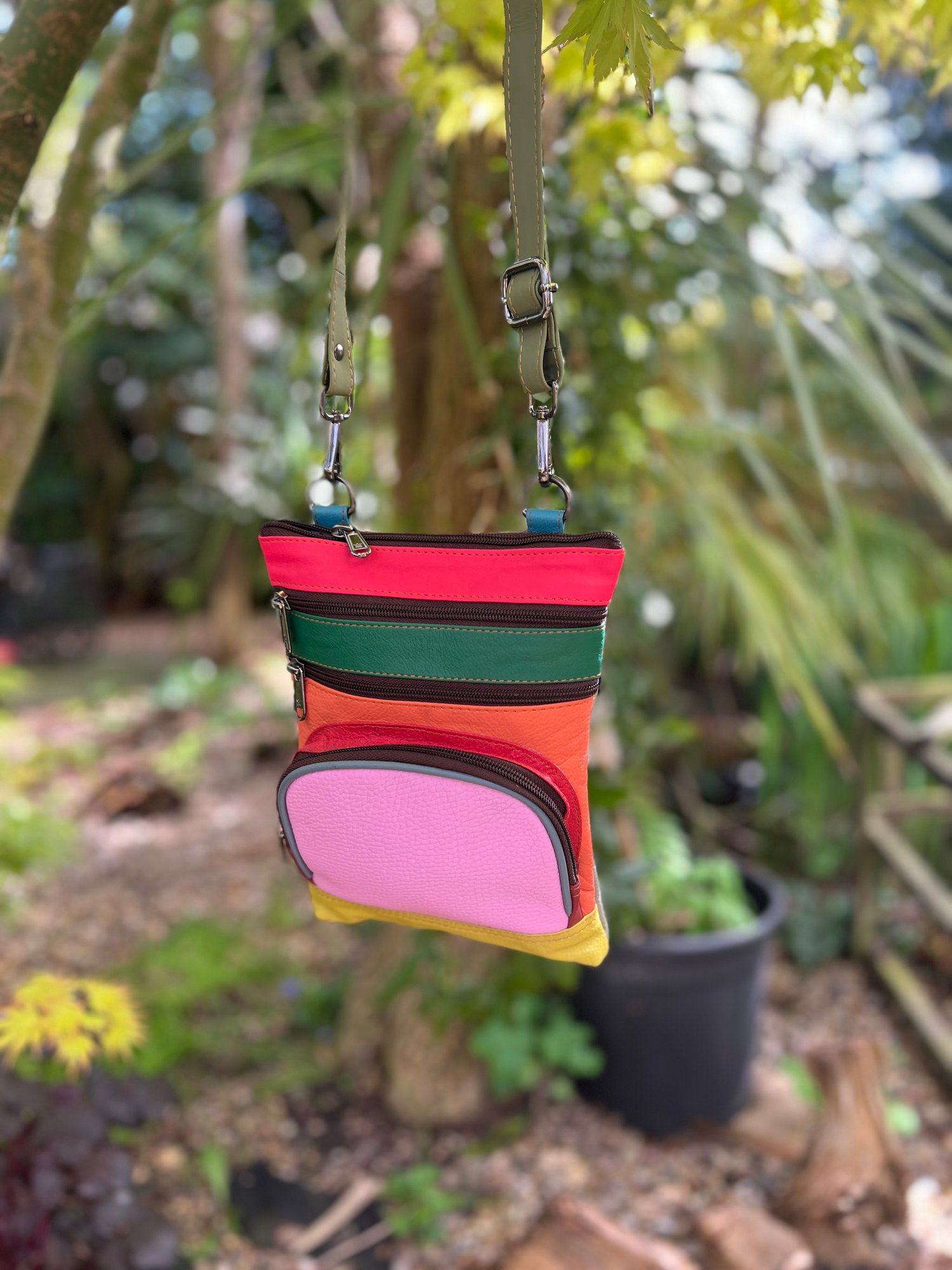 Our sustainable colourful leather bags are made for us in India using offcuts of leather which would otherwise go to landfill. They have been ethically crafted to produce both an unusual and unique bag.