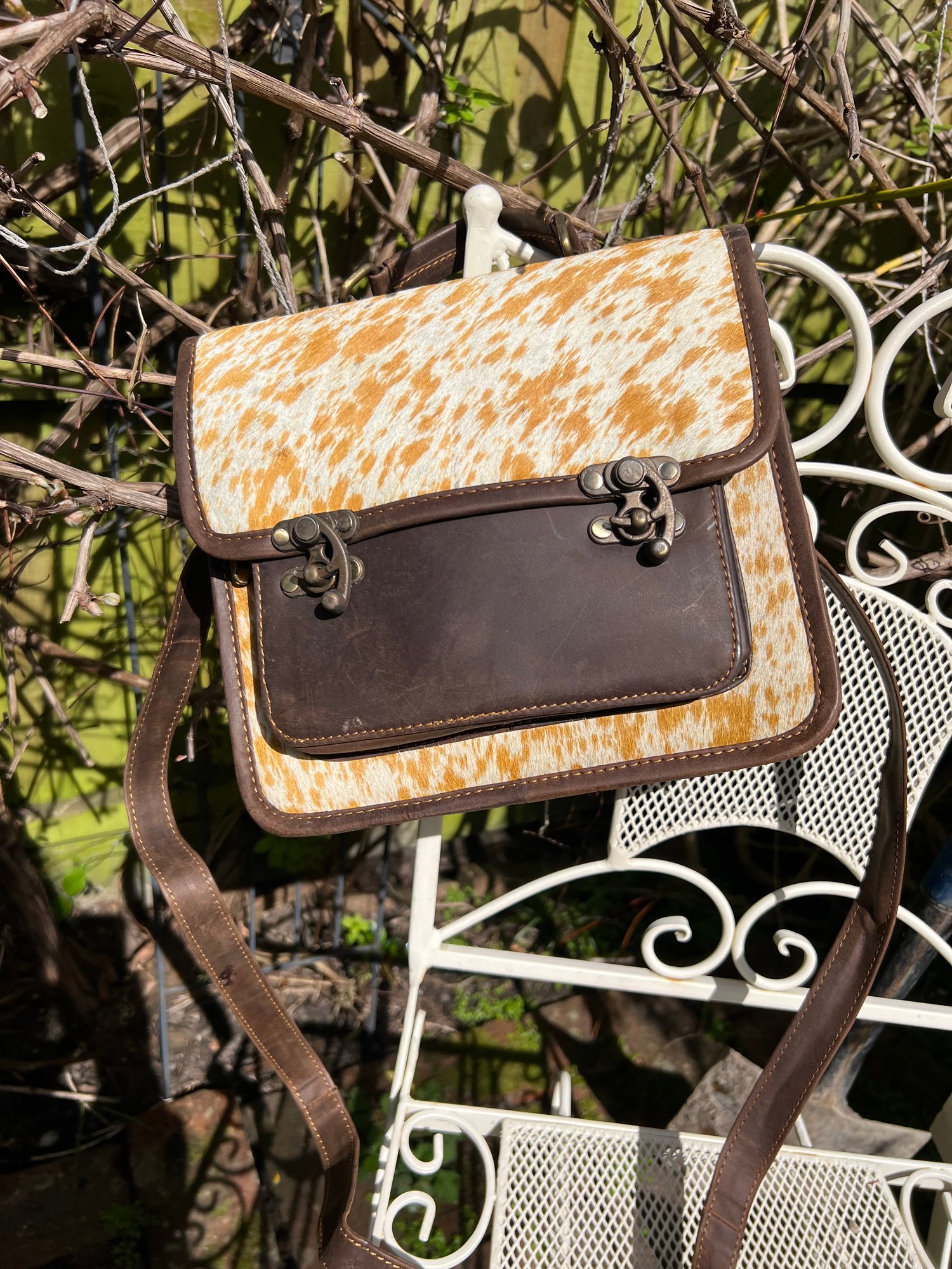 Outside to the front is a large zipped pocket - perfect for your phone. There is a long, adjustable leather strap and a sturdy leather carry handle. The messenger fastens with 2 cute metal curly locks.