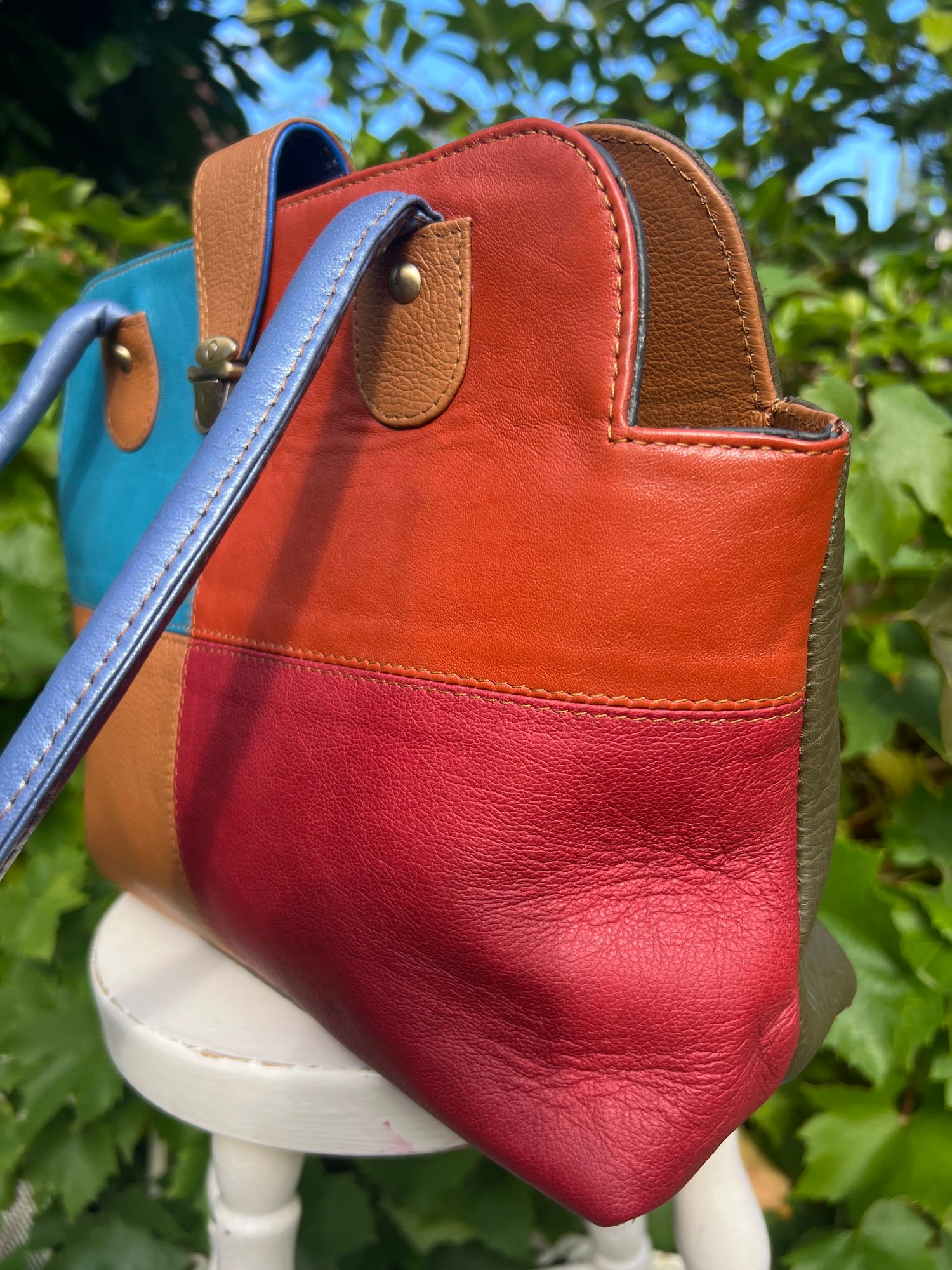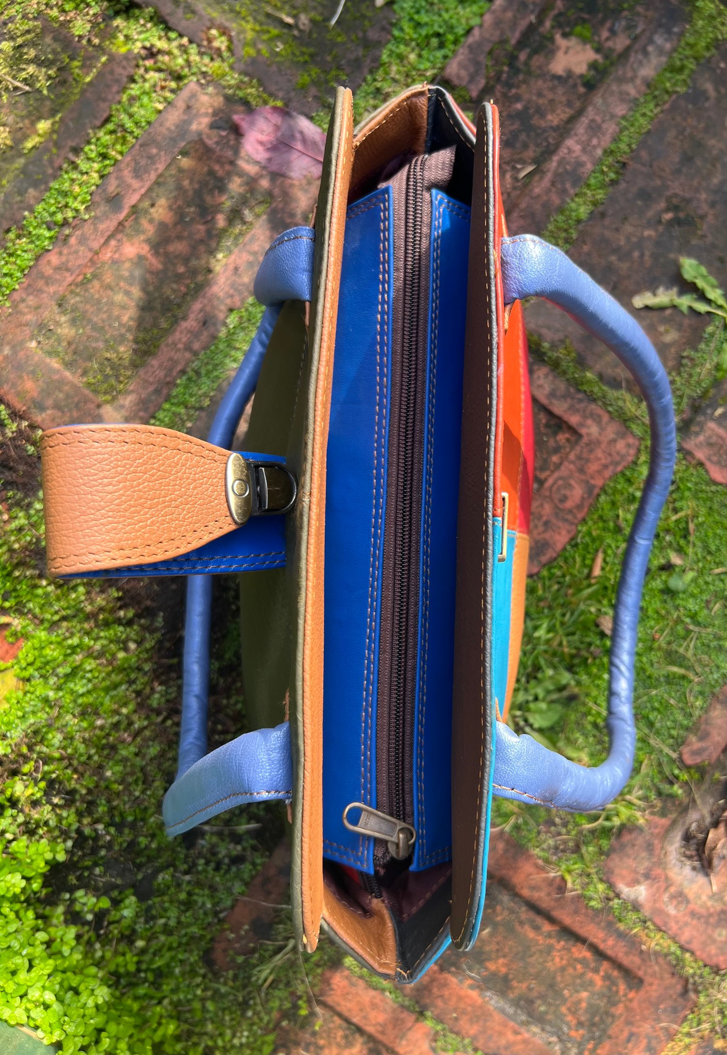 New to our Harlequin Collection is this fabulous colourful repurposed leather handbag. It will carry your iPad, with the top zip just fastening.