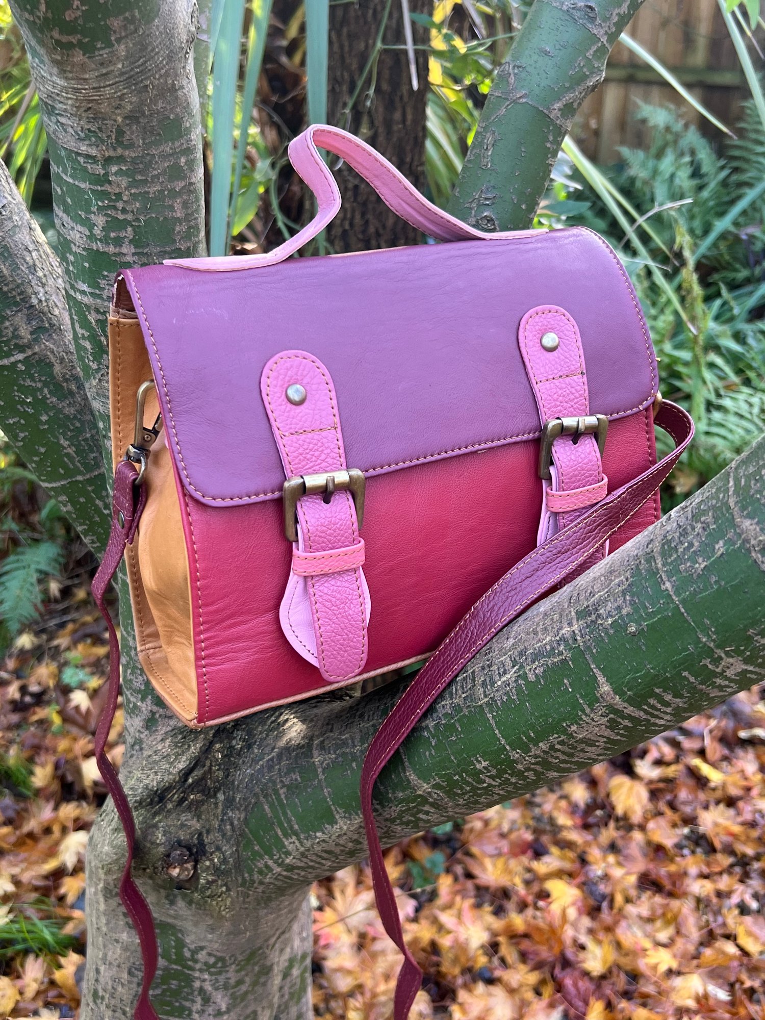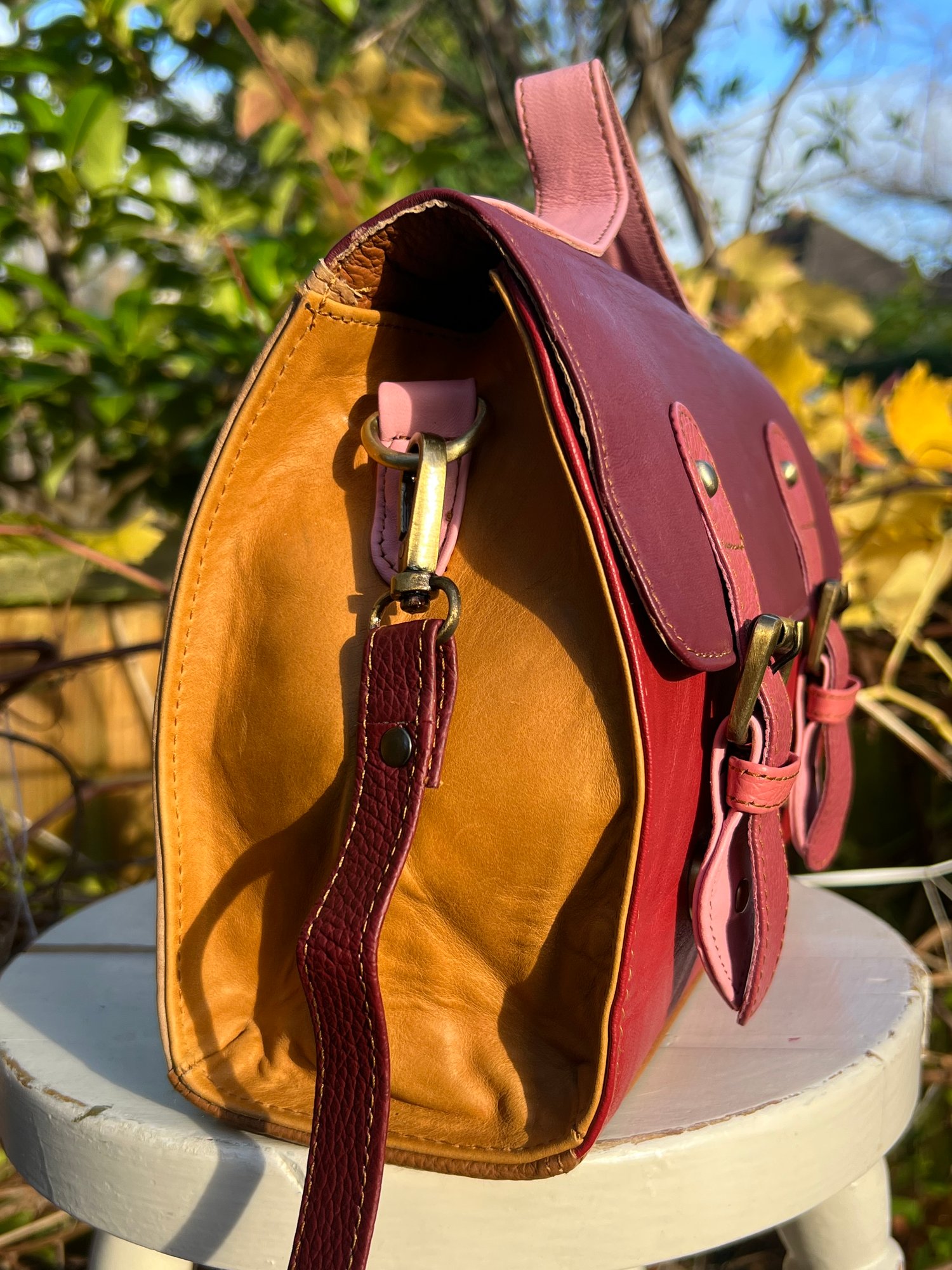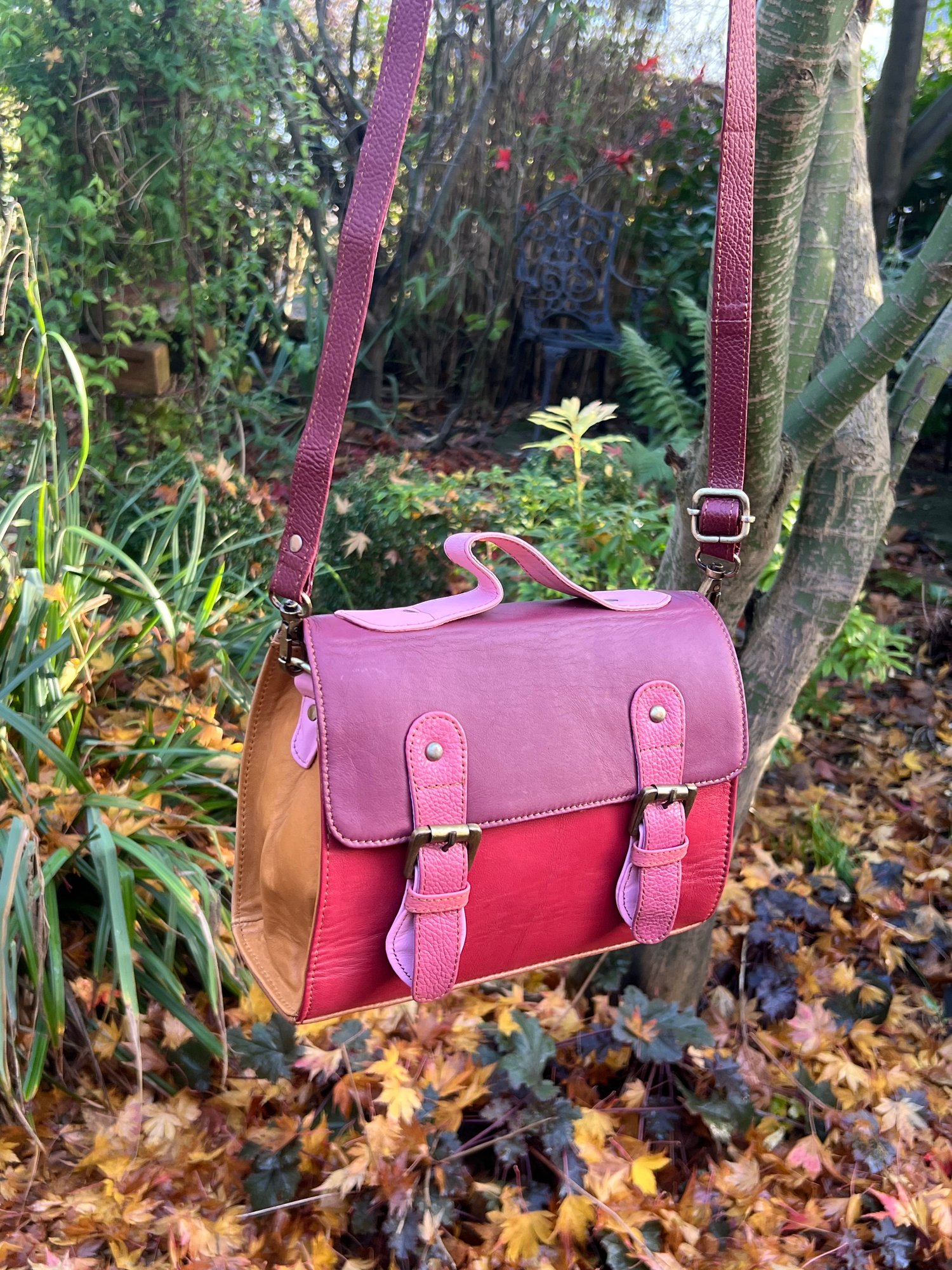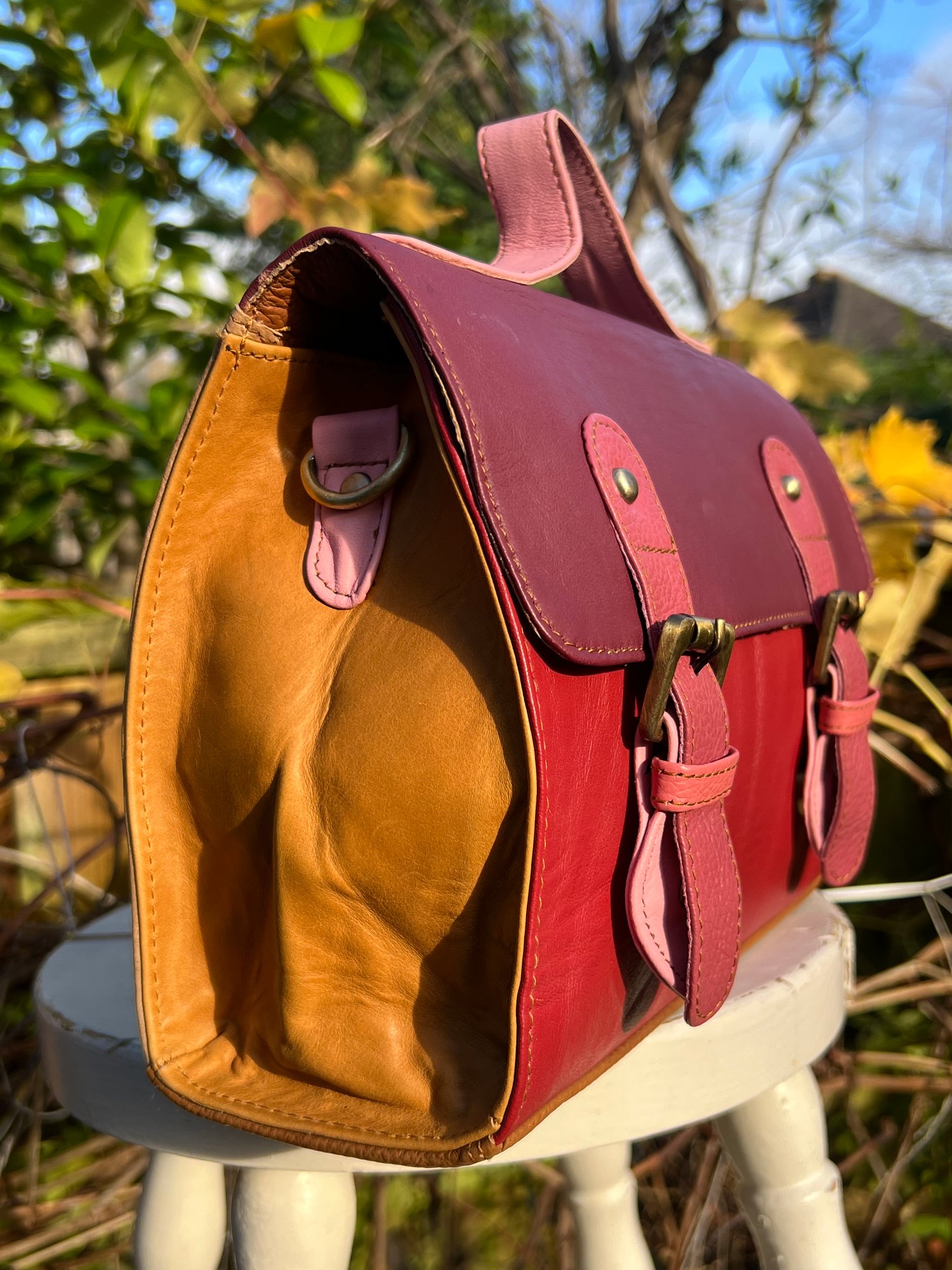 Our traditional satchels are practical and ever-popular, so we incorporated the design using multi-coloured buffalo leather offcuts. With long strap and a useful carry handle, this one-of-a-kind bag is so cute, it definitely should be in every girl's wardrobe.