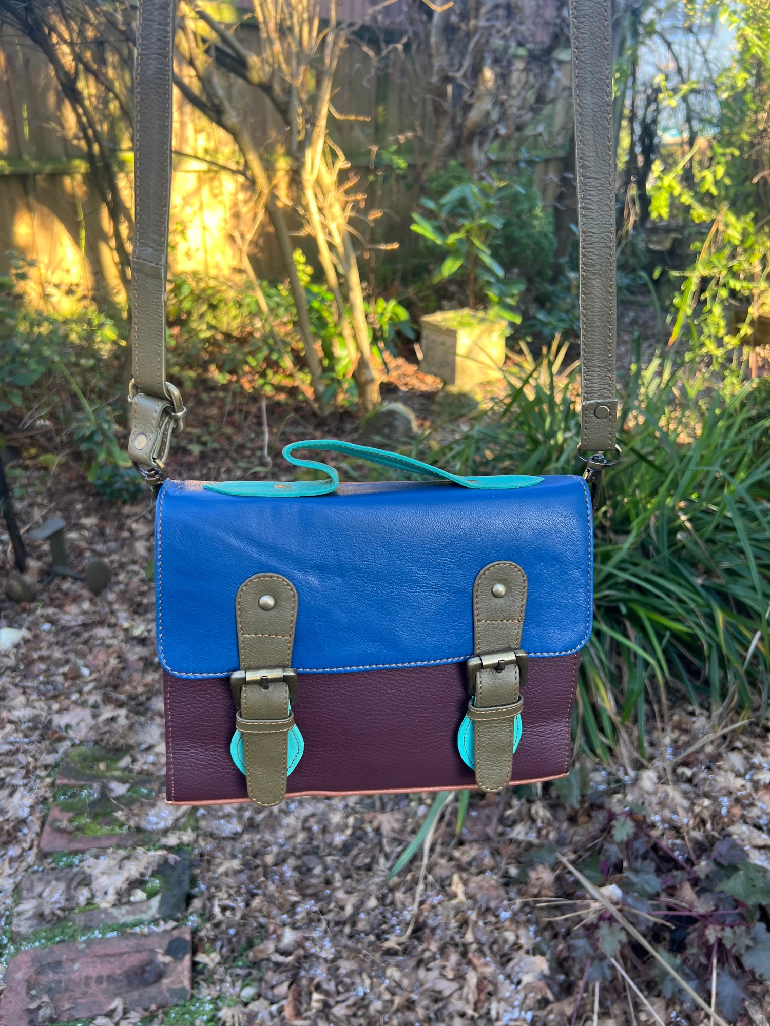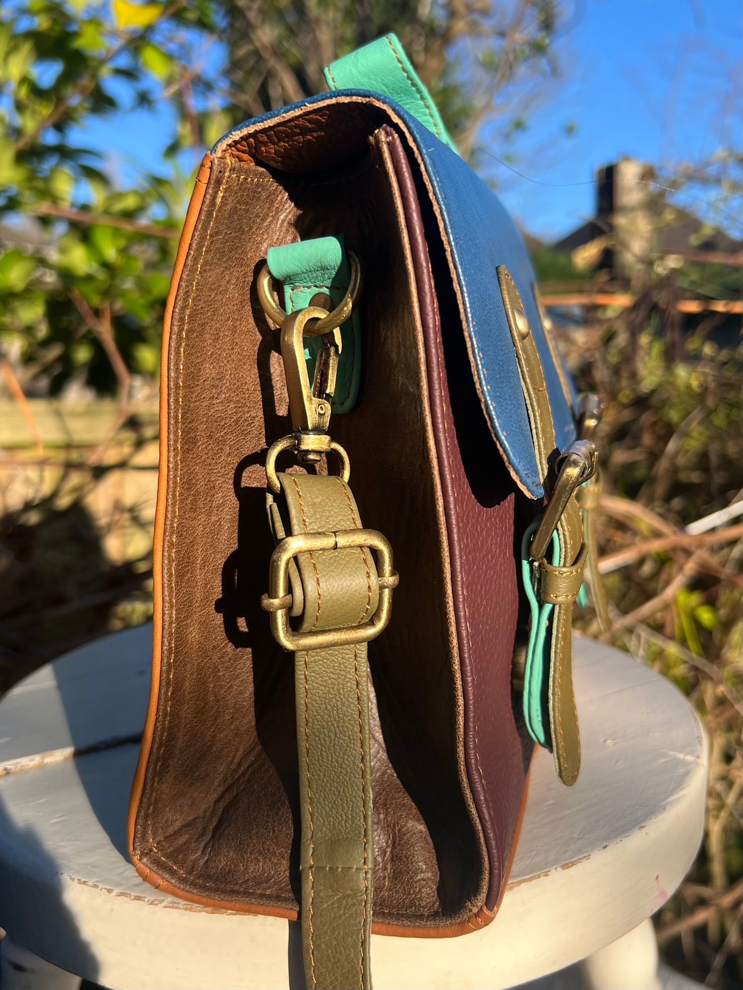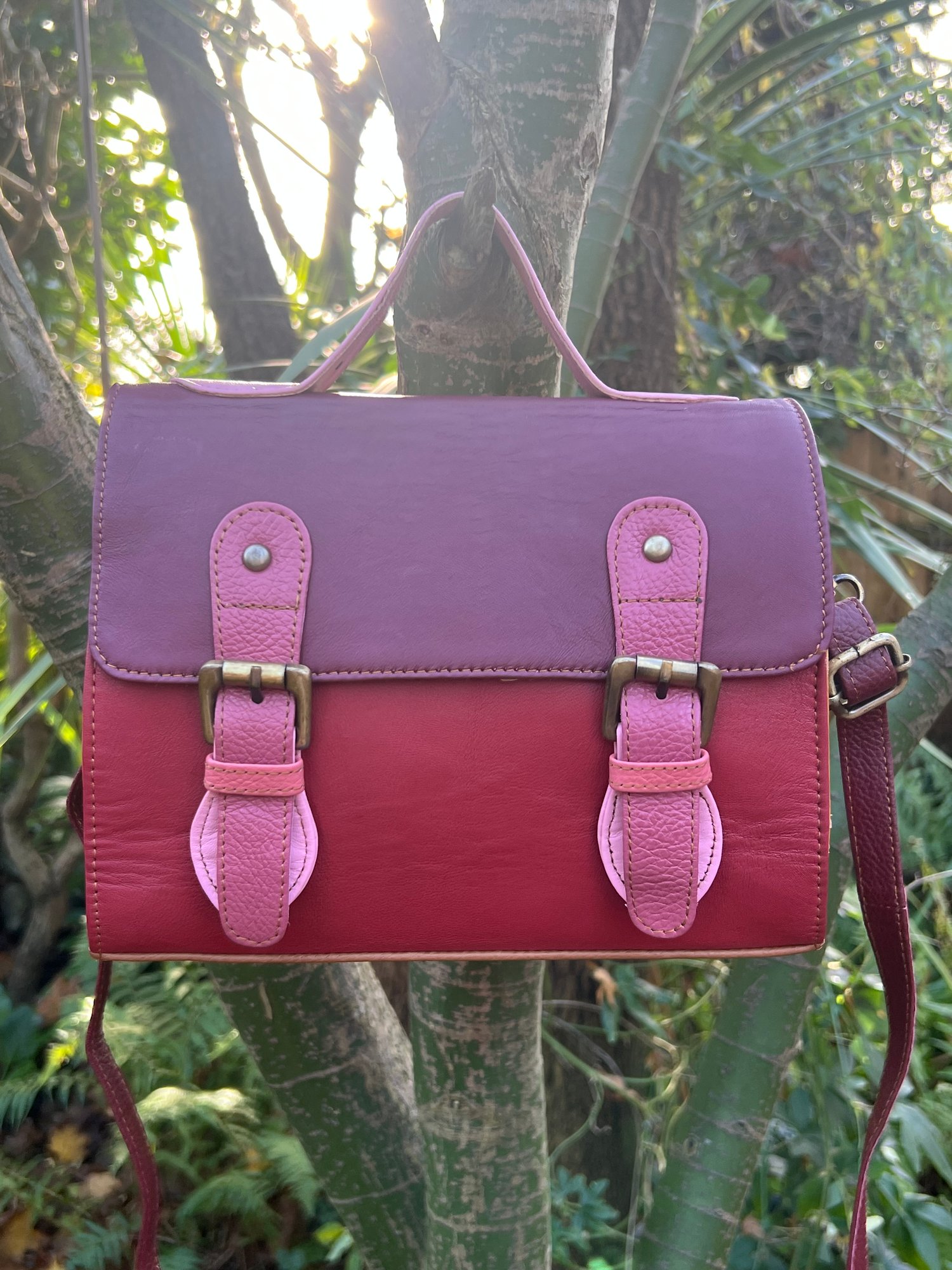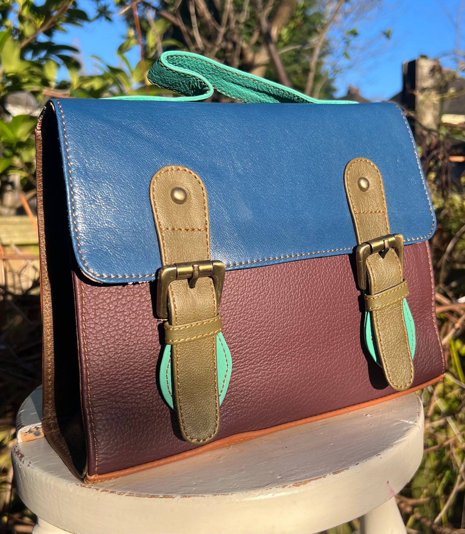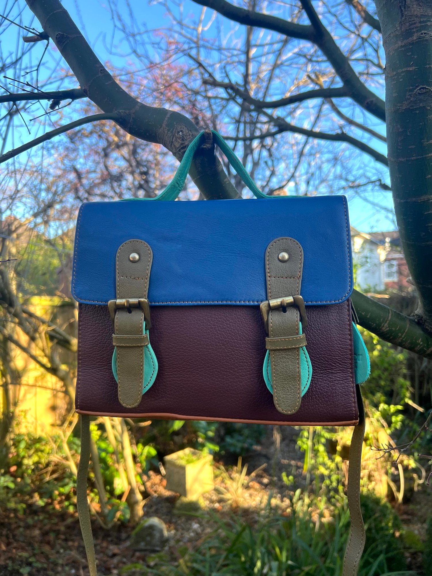 Our traditional satchels are practical and ever-popular, so we incorporated the design using multi-coloured buffalo leather offcuts. With long strap and a useful carry handle, this one-of-a-kind bag is so cute, it definitely should be in every girl's wardrobe.