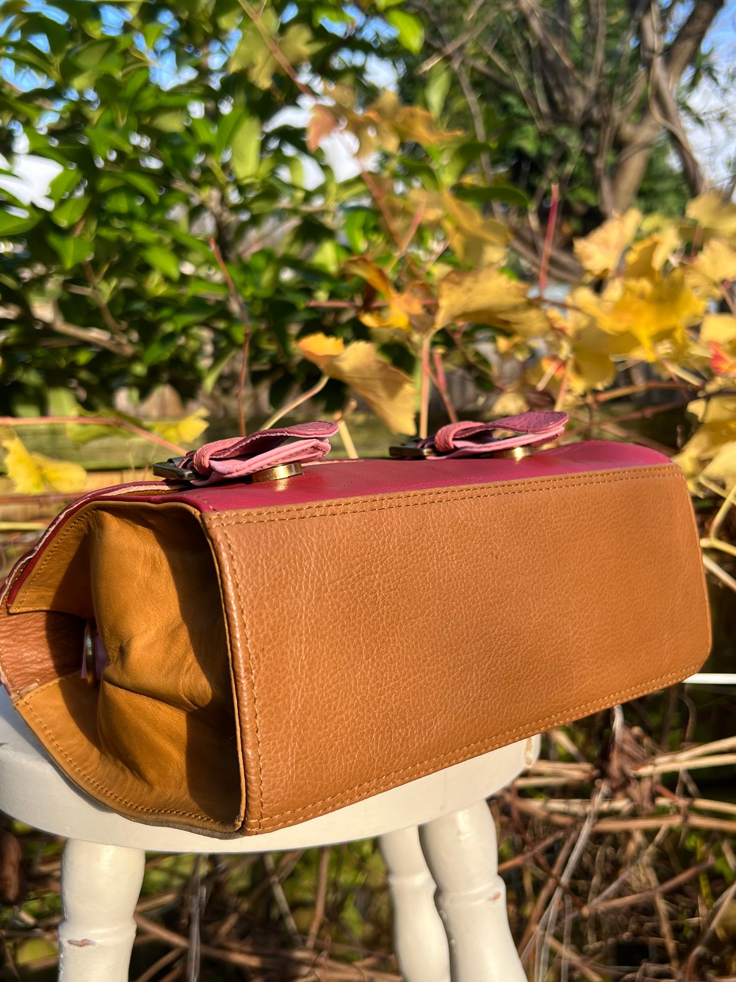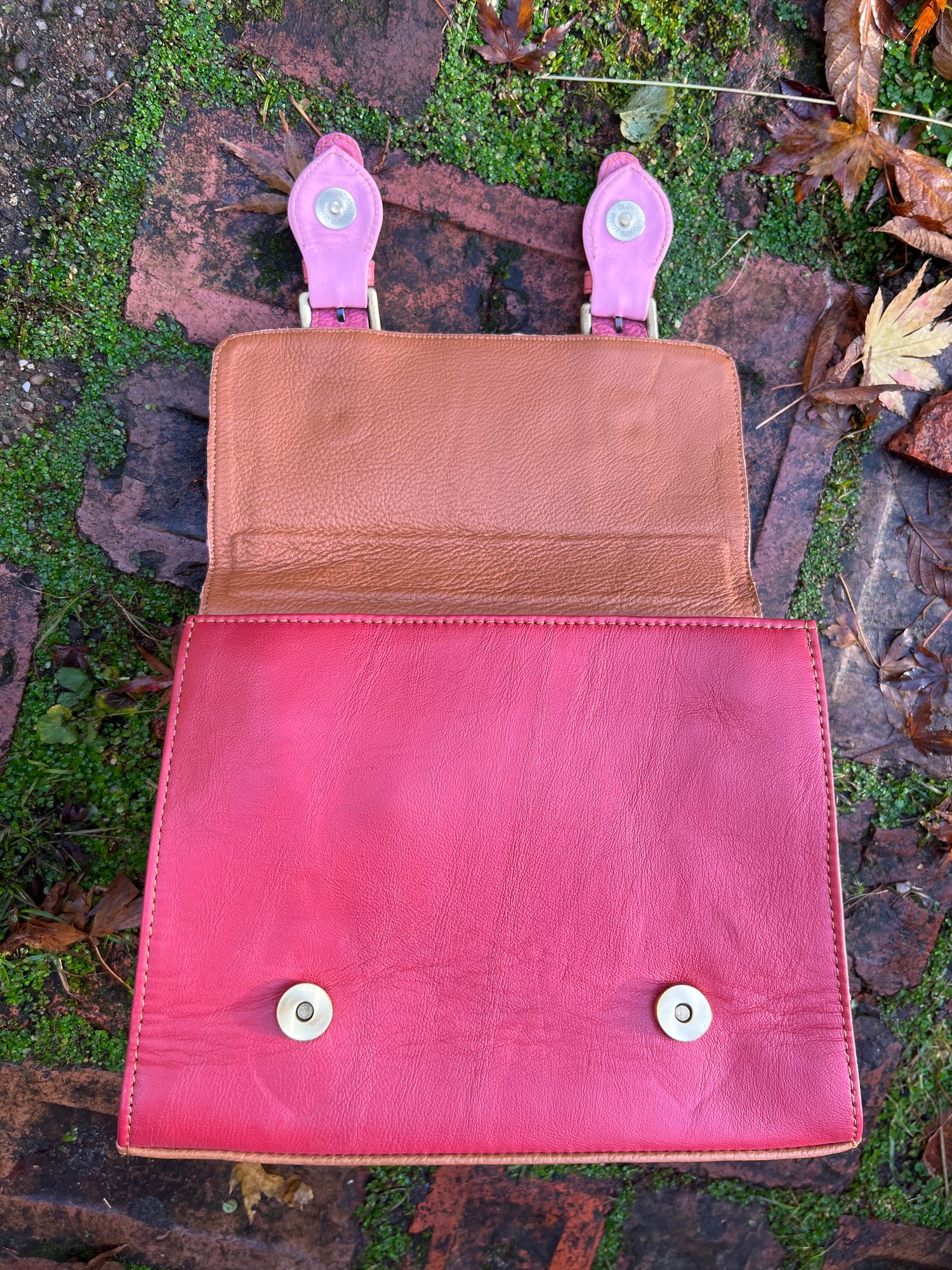 The bag has a top handle, fastens with 2 magnetic studs beneath mock buckles and has a bolt-on adjustable strap 58” (147cm)