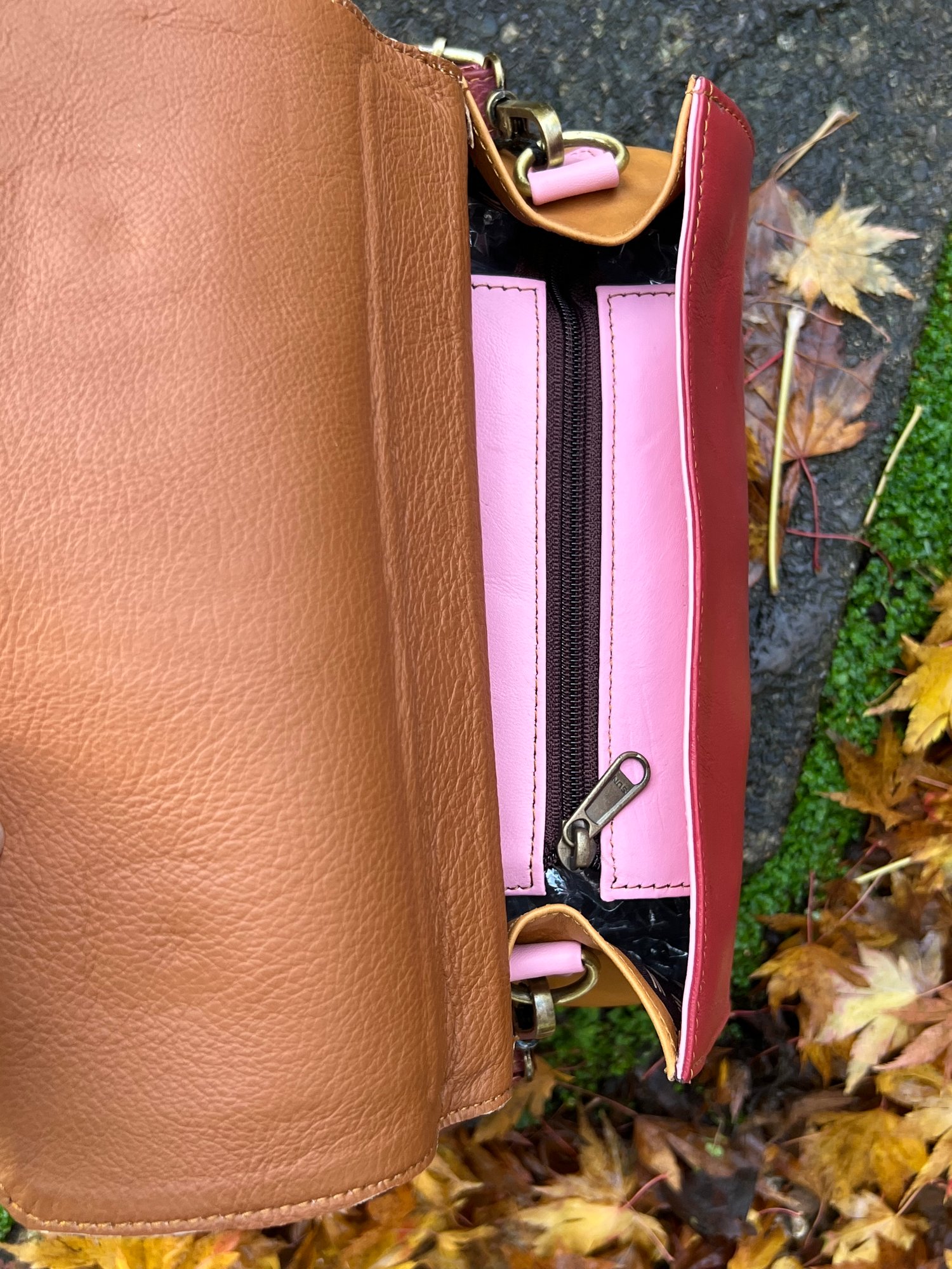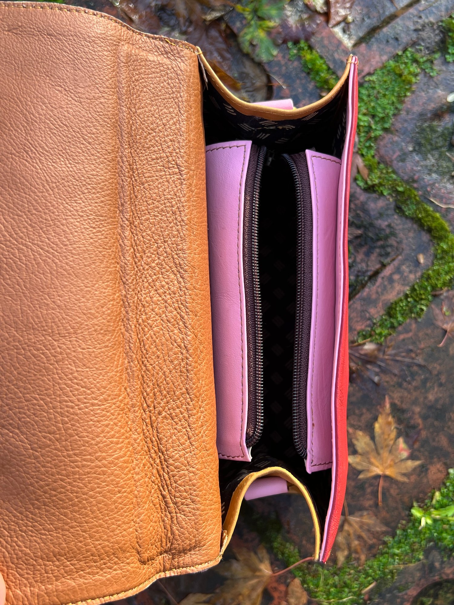 The inside is lined, has a zipped pocket, and is fully enclosed by a zip for security.