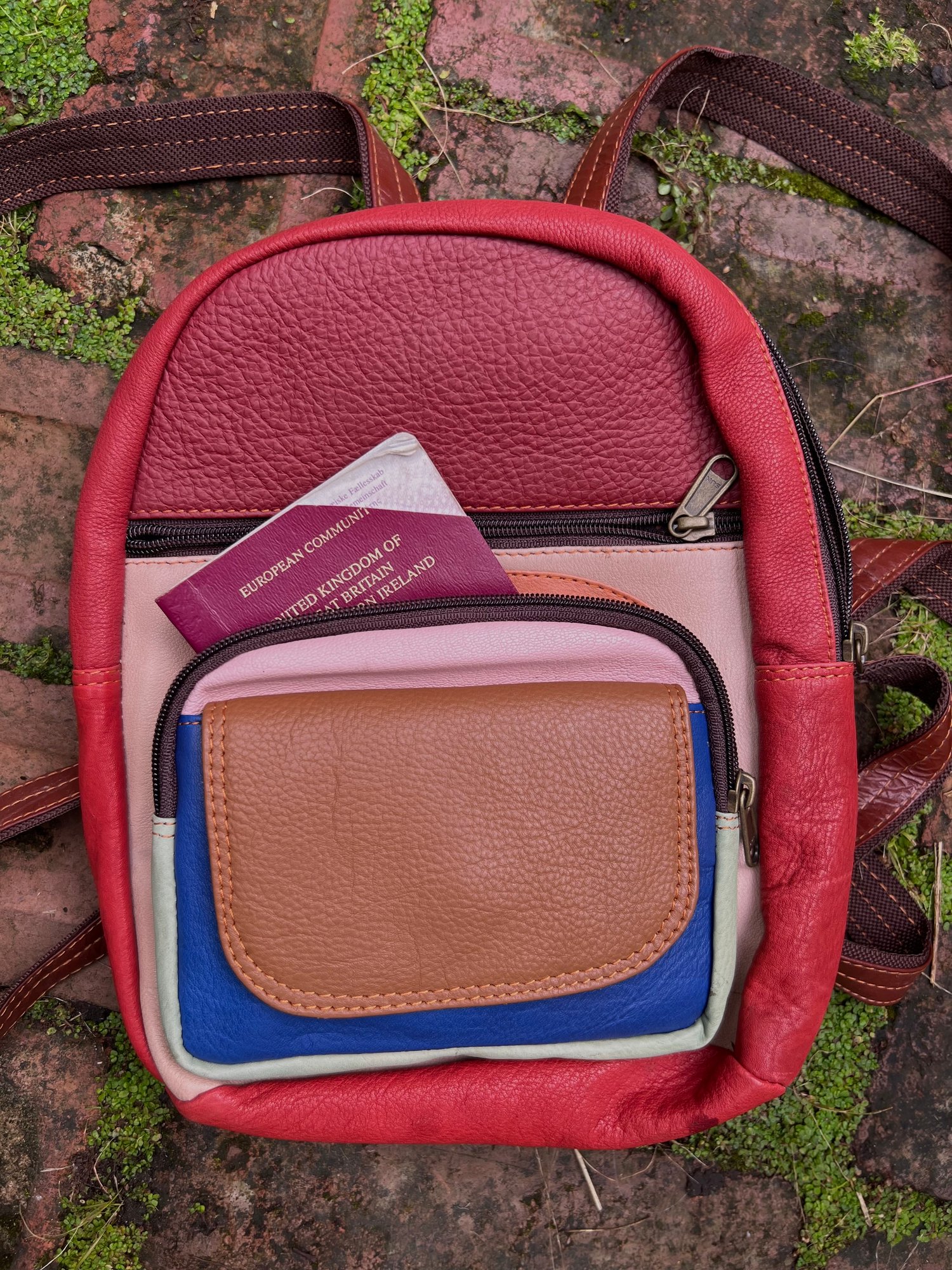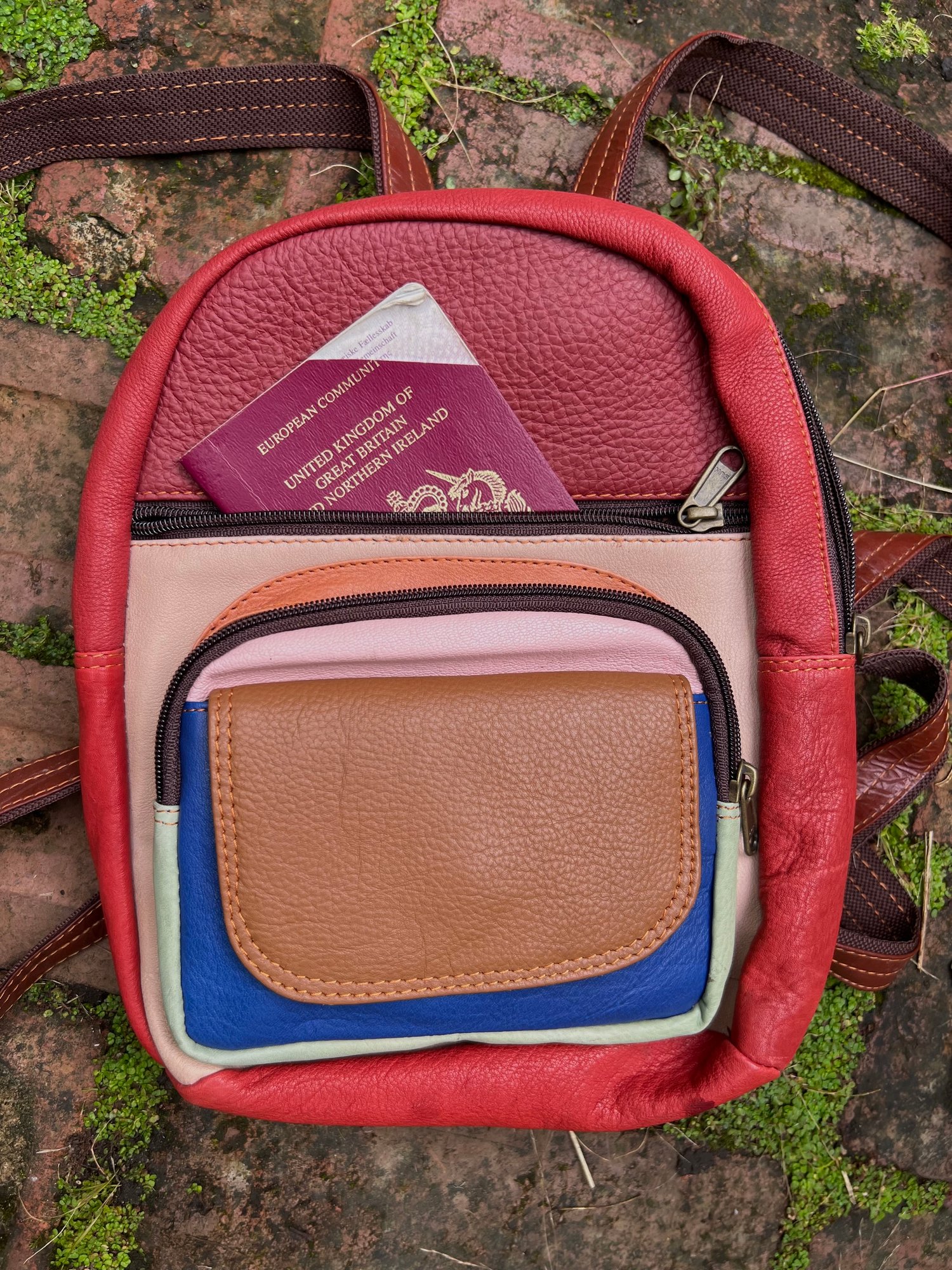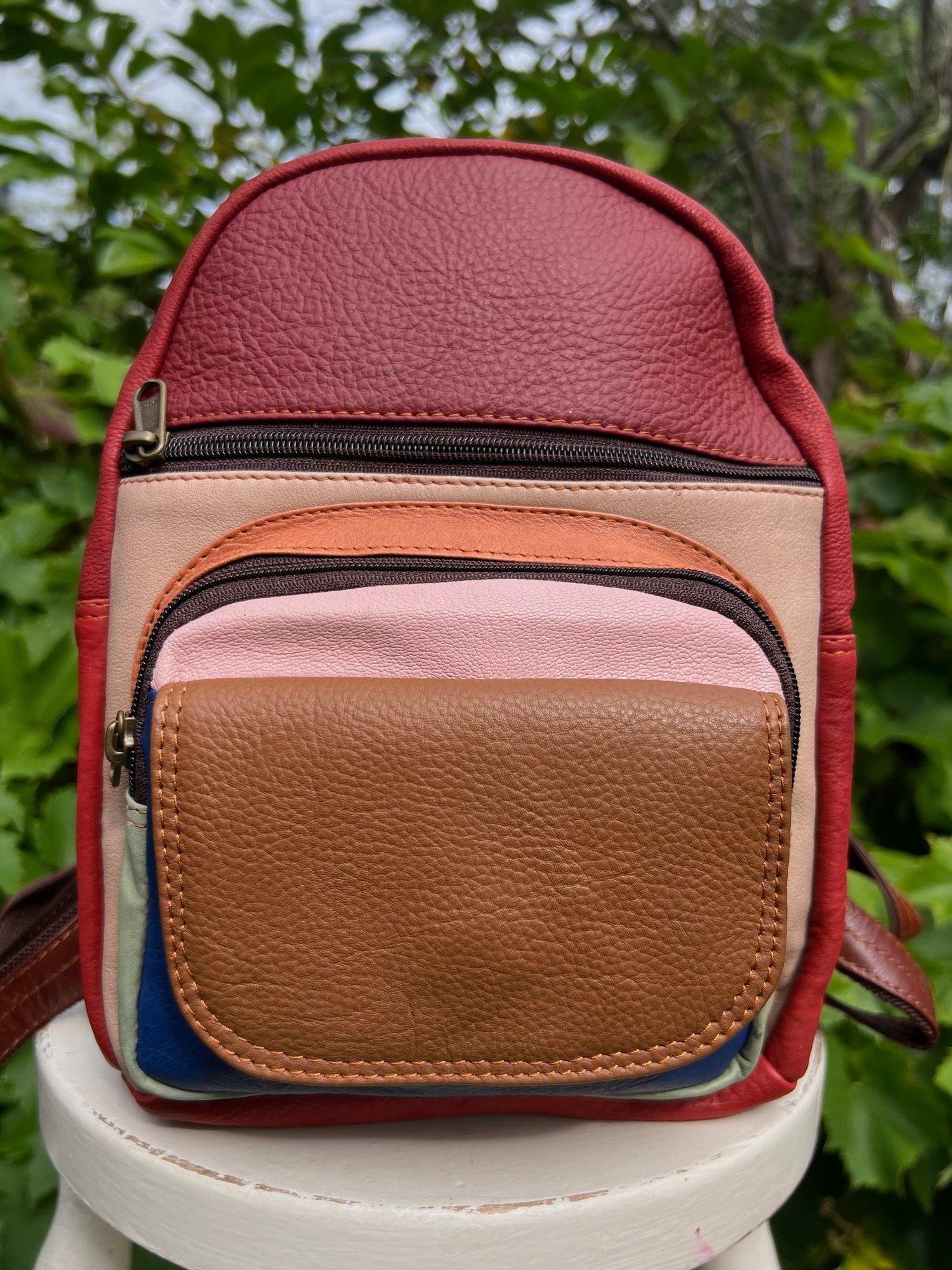 New to our Harlequin Collection is this multicoloured buffalo leather baby backpack. Made from discarded leather offcuts, each one of our bags is one-of-a-kind.