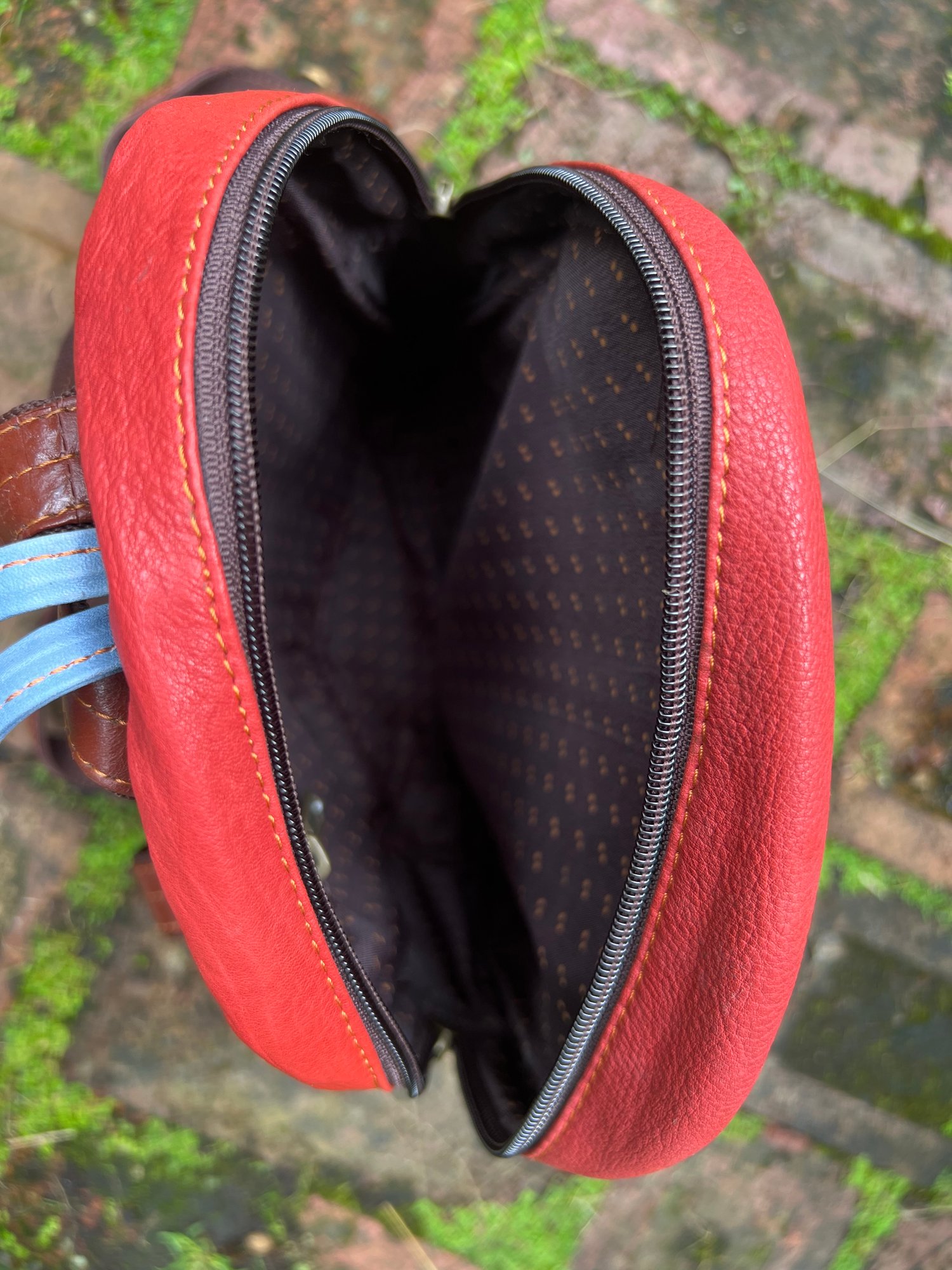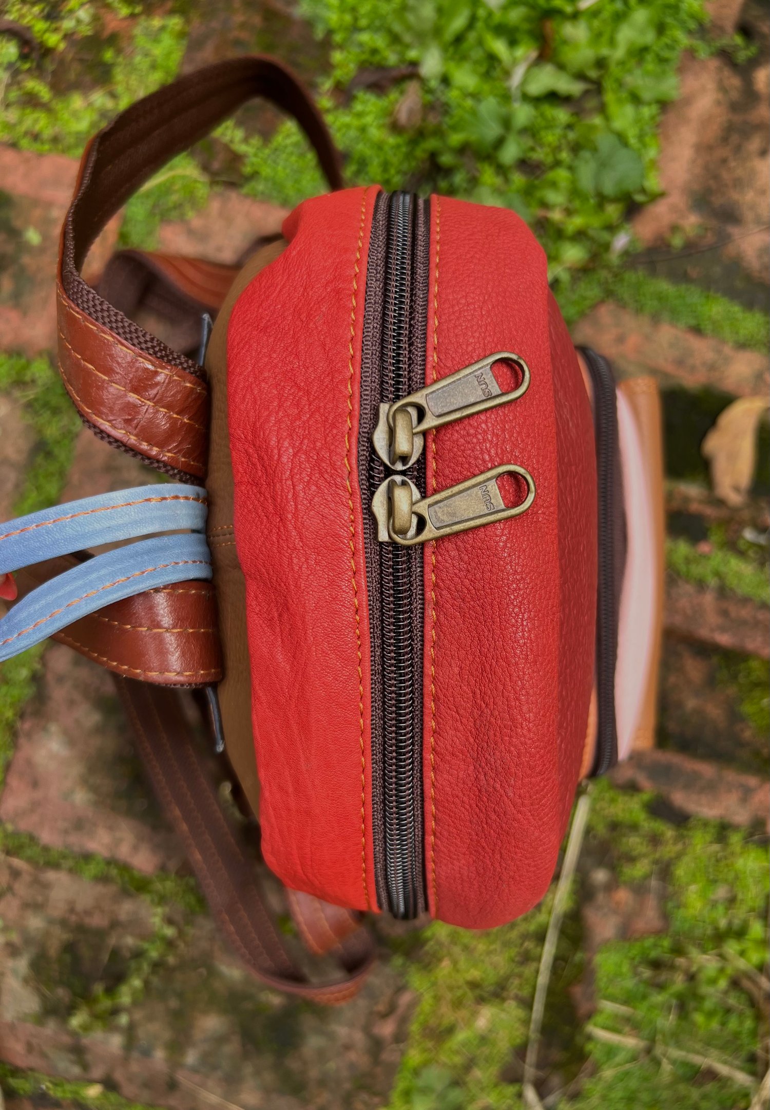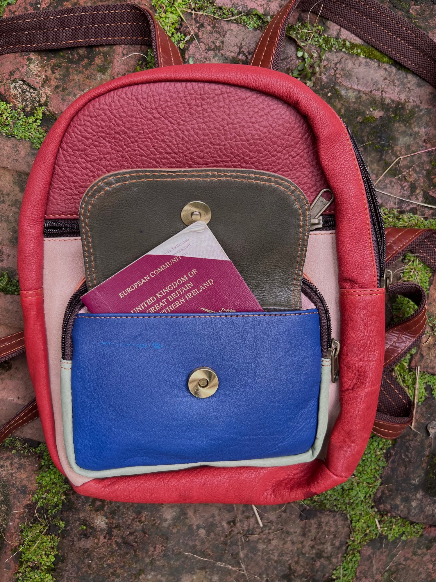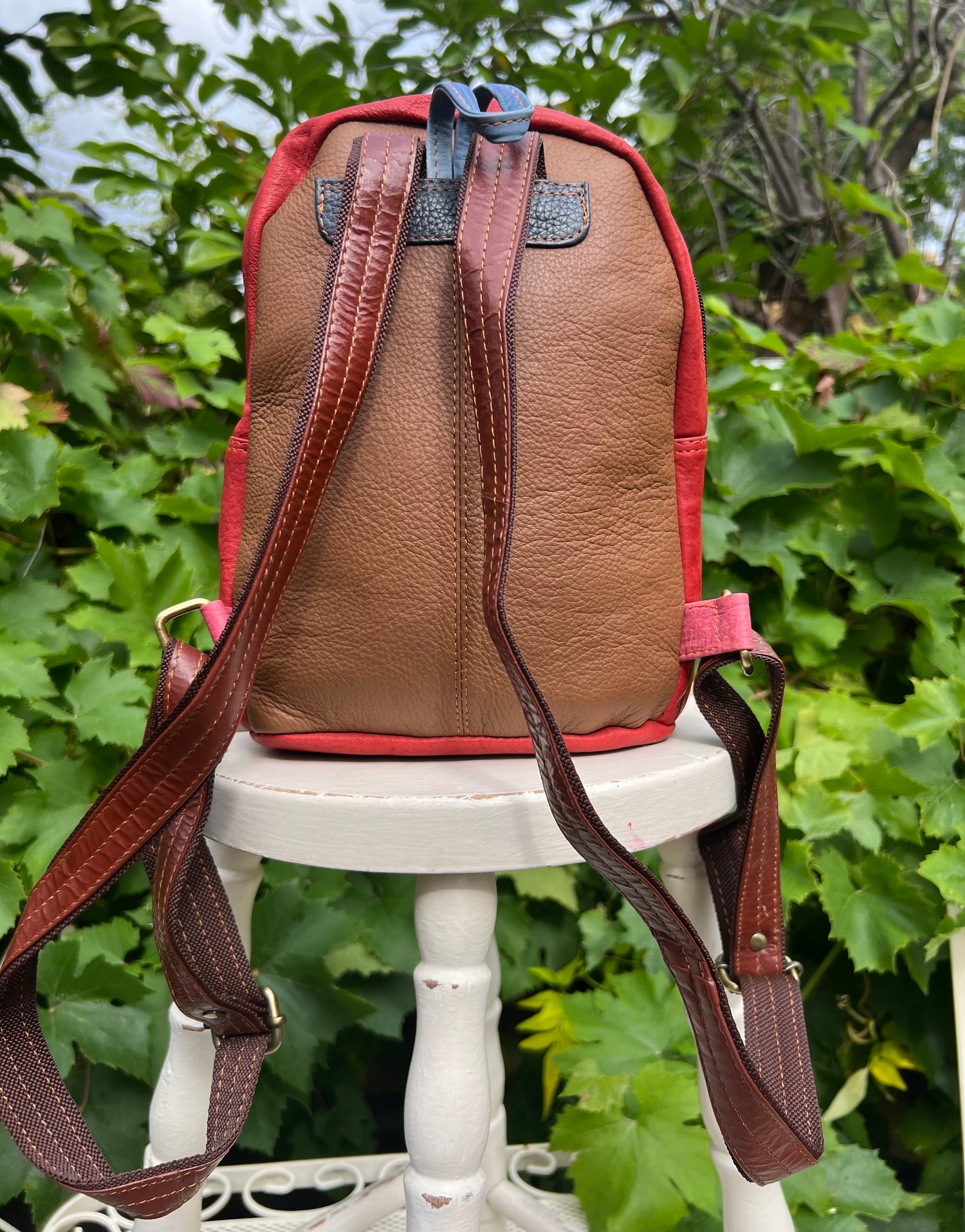 New to our Harlequin Collection is this multicoloured buffalo leather baby backpack. Made from discarded leather offcuts, each one of our bags is one-of-a-kind.