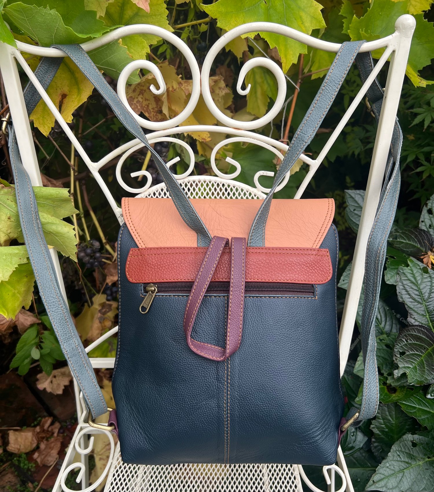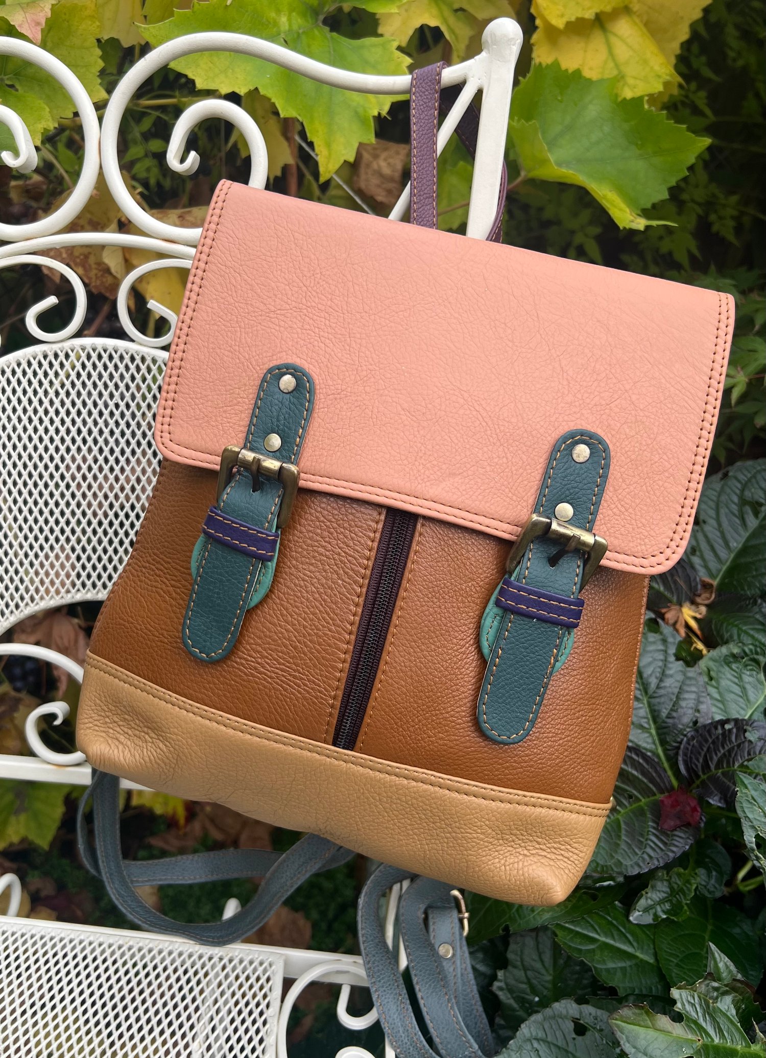 New to our Harlequin Collection is this multicoloured buffalo leather baby backpack. Made from discarded leather offcuts, each one of our bags is one-of-a-kind.