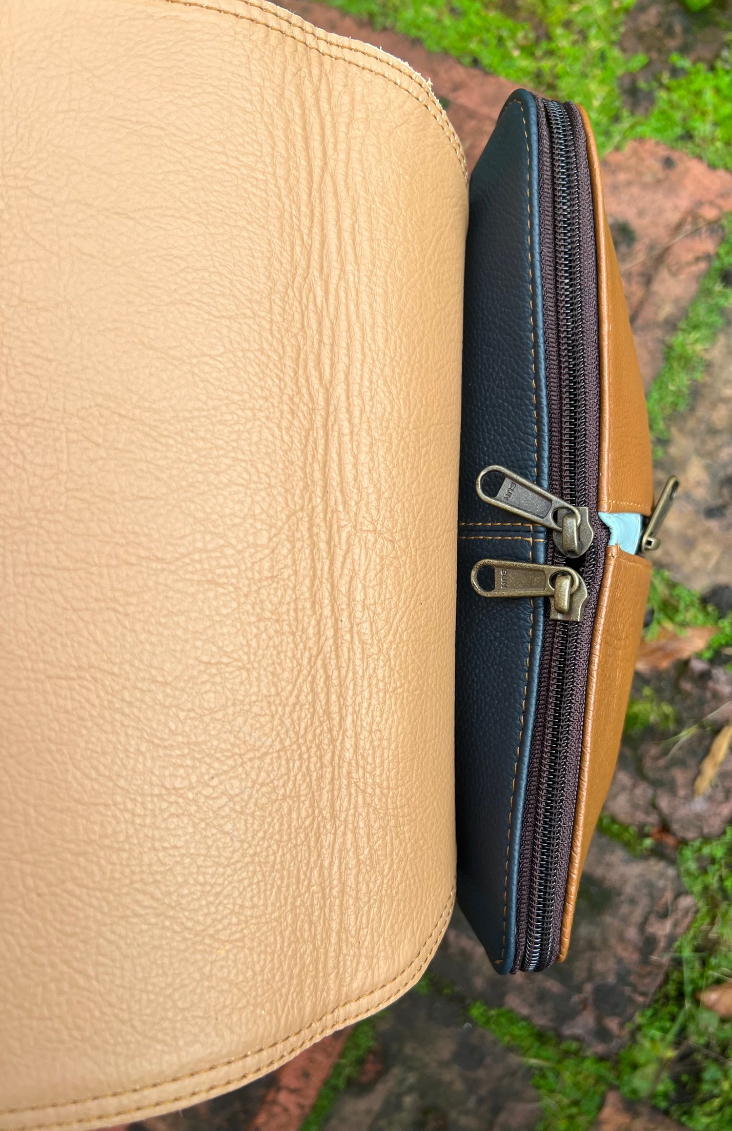 Inside the lined bag is a zipped pocket + open pocket. A full zip-around opens up this section, and closes for security.