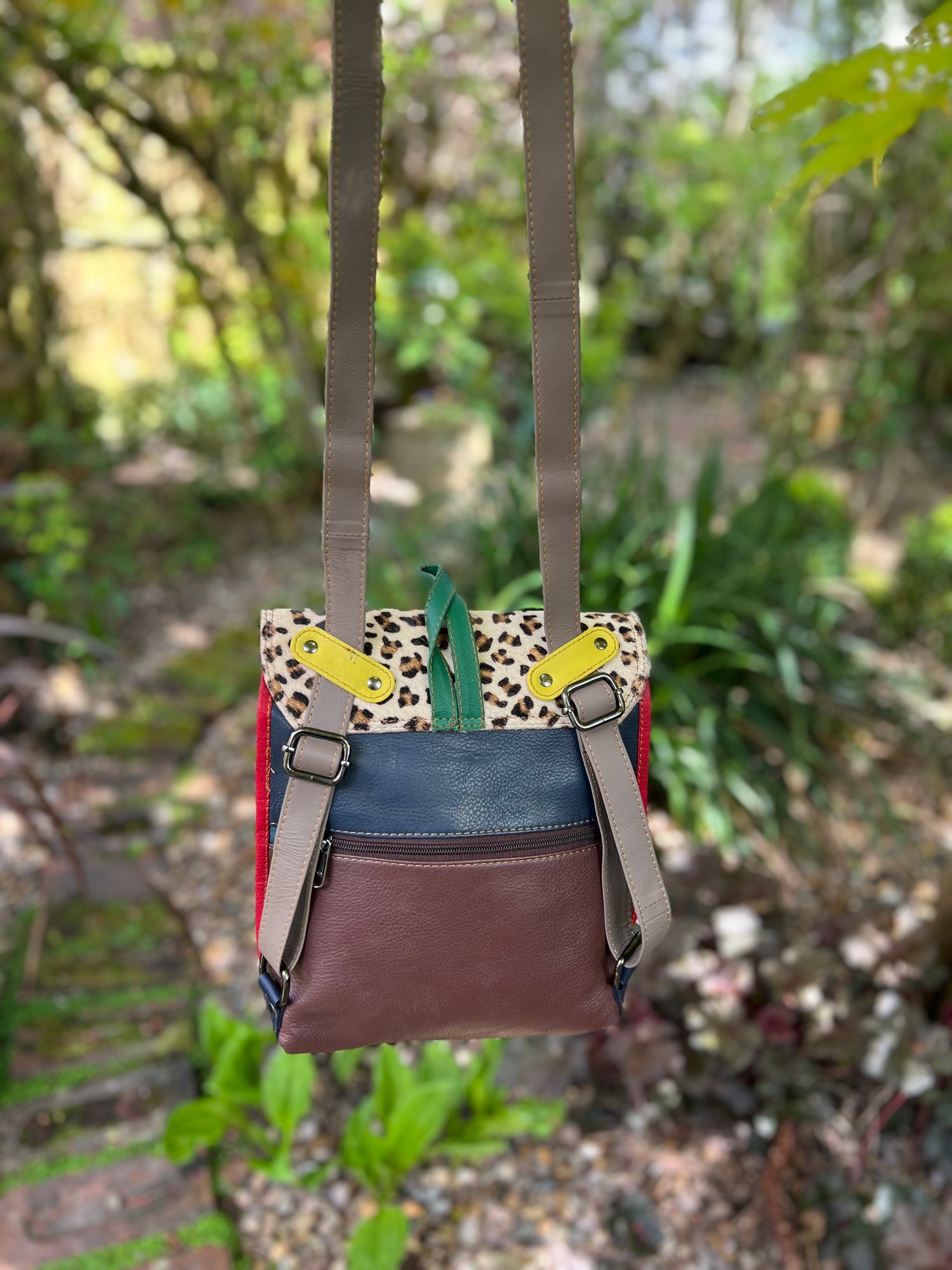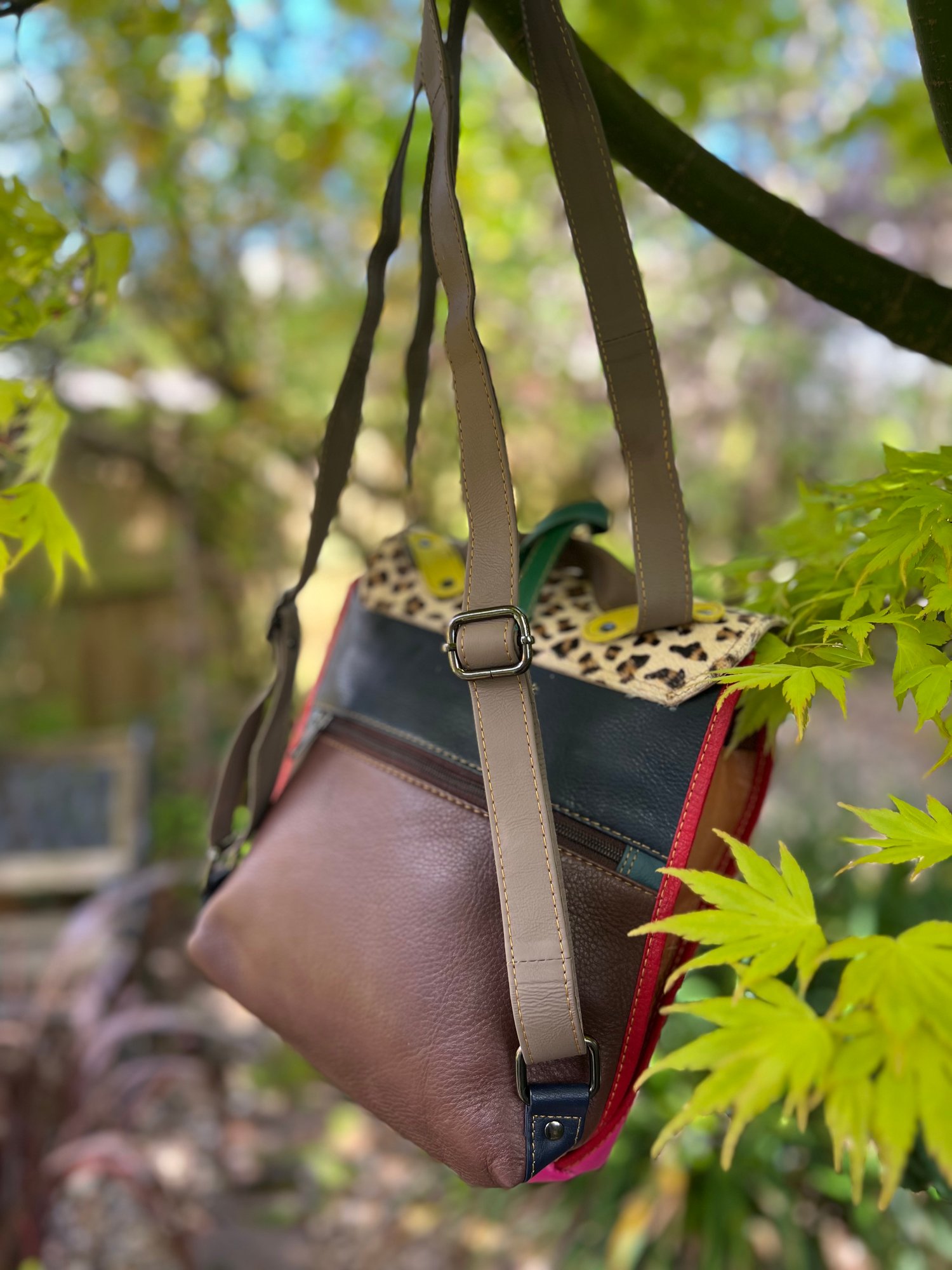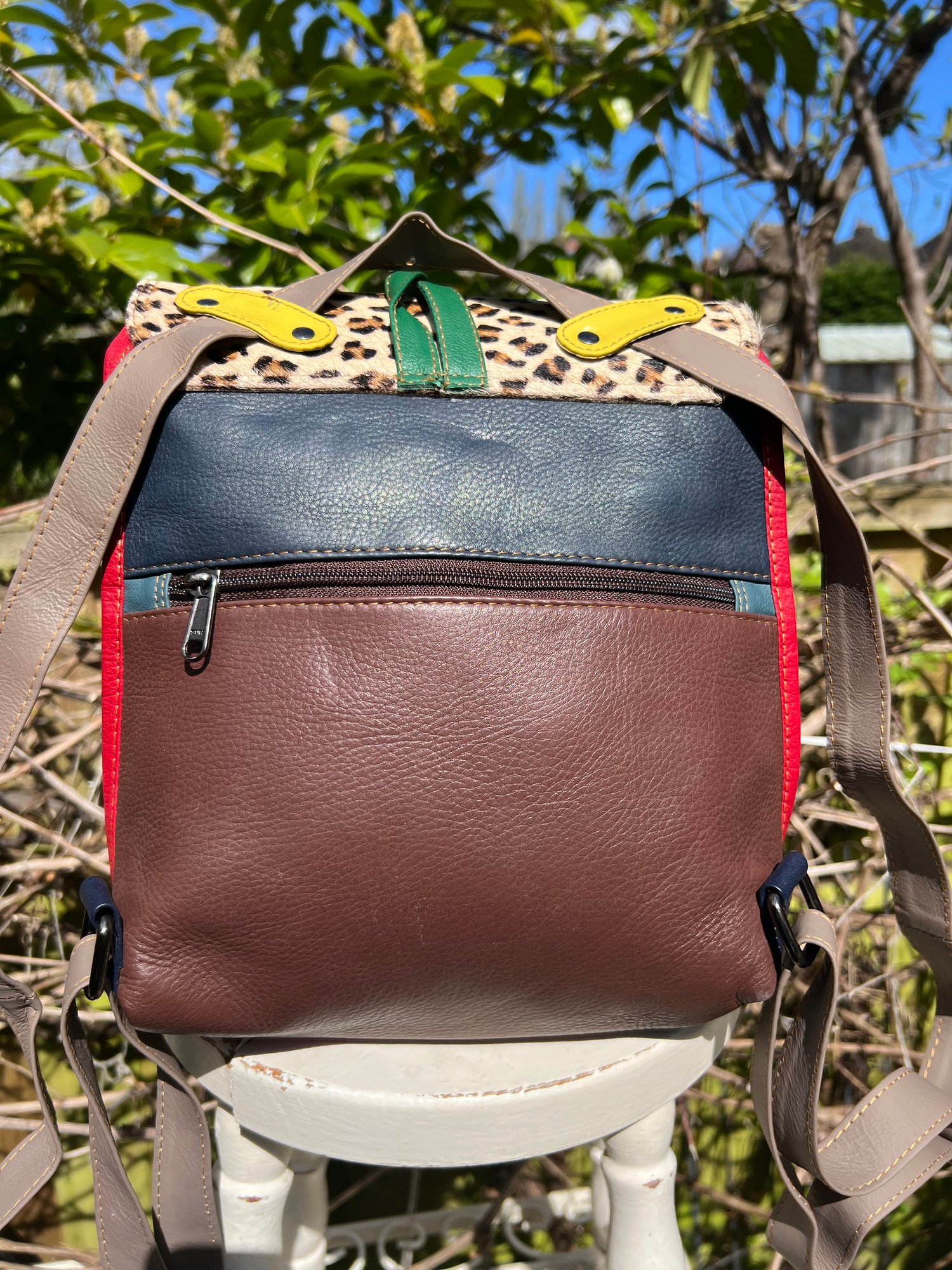 New to our Harlequin Collection is this multicoloured buffalo leather baby backpack which easily converts to a crossbody bag. Made from discarded leather offcuts, each one of our bags is one-of-a-kind.