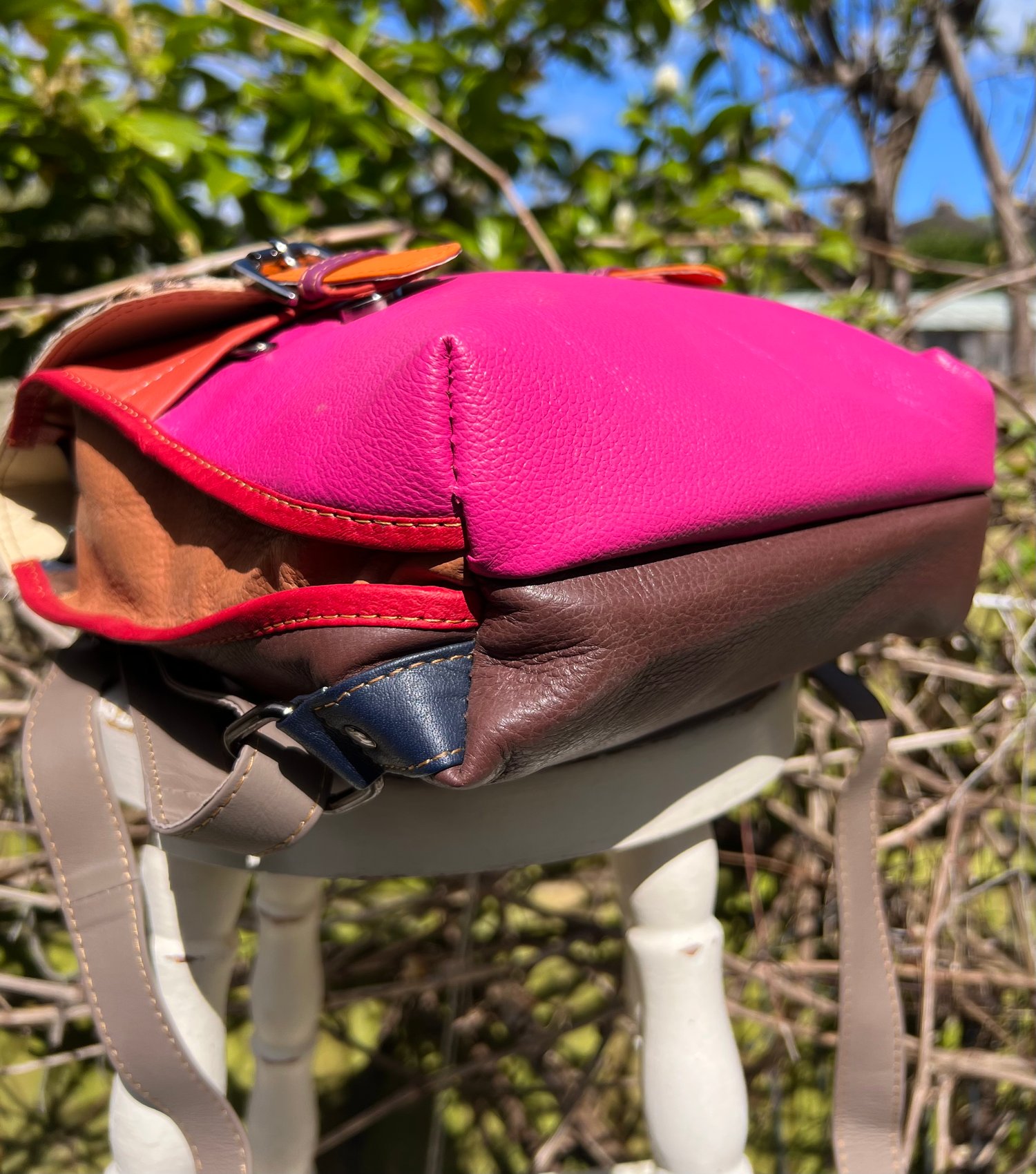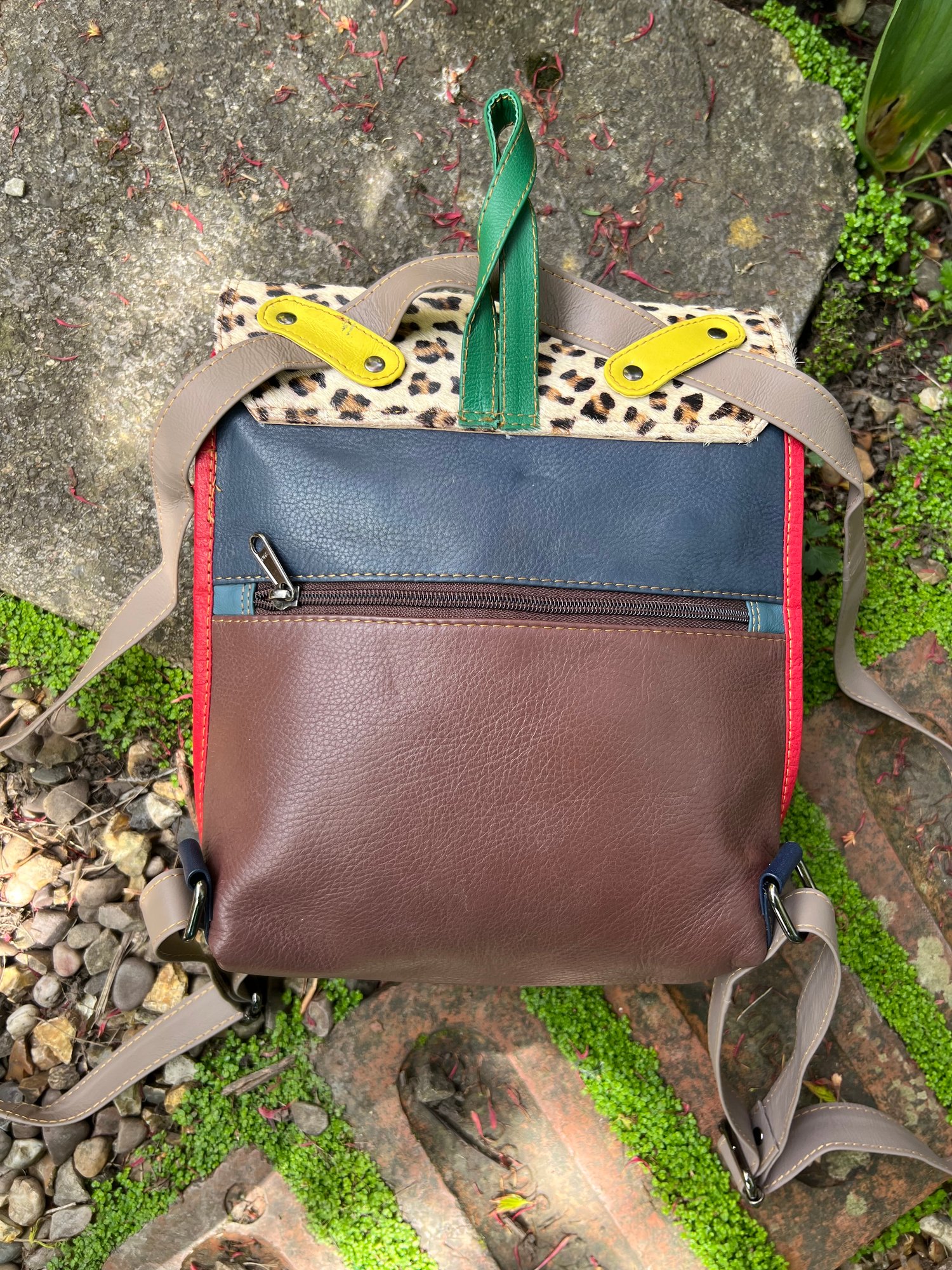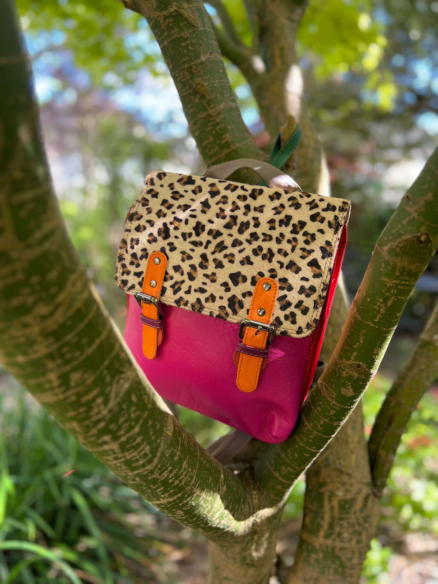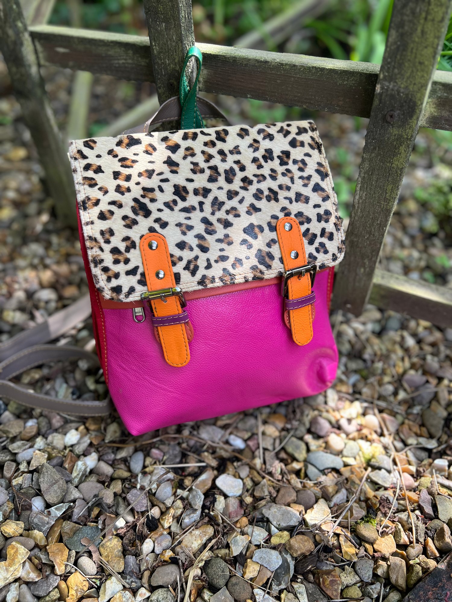 New to our Harlequin Collection is this multicoloured buffalo leather baby backpack which easily converts to a crossbody bag. Made from discarded leather offcuts, each one of our bags is one-of-a-kind.