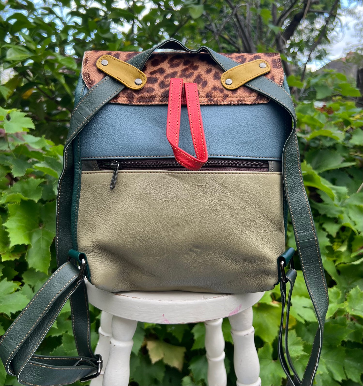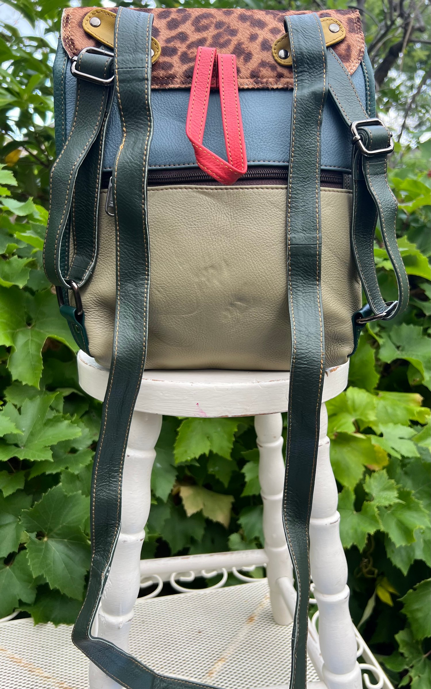 New to our Harlequin Collection is this multicoloured buffalo leather baby backpack which easily converts to a crossbody bag. Made from discarded leather offcuts, each one of our bags is one-of-a-kind.