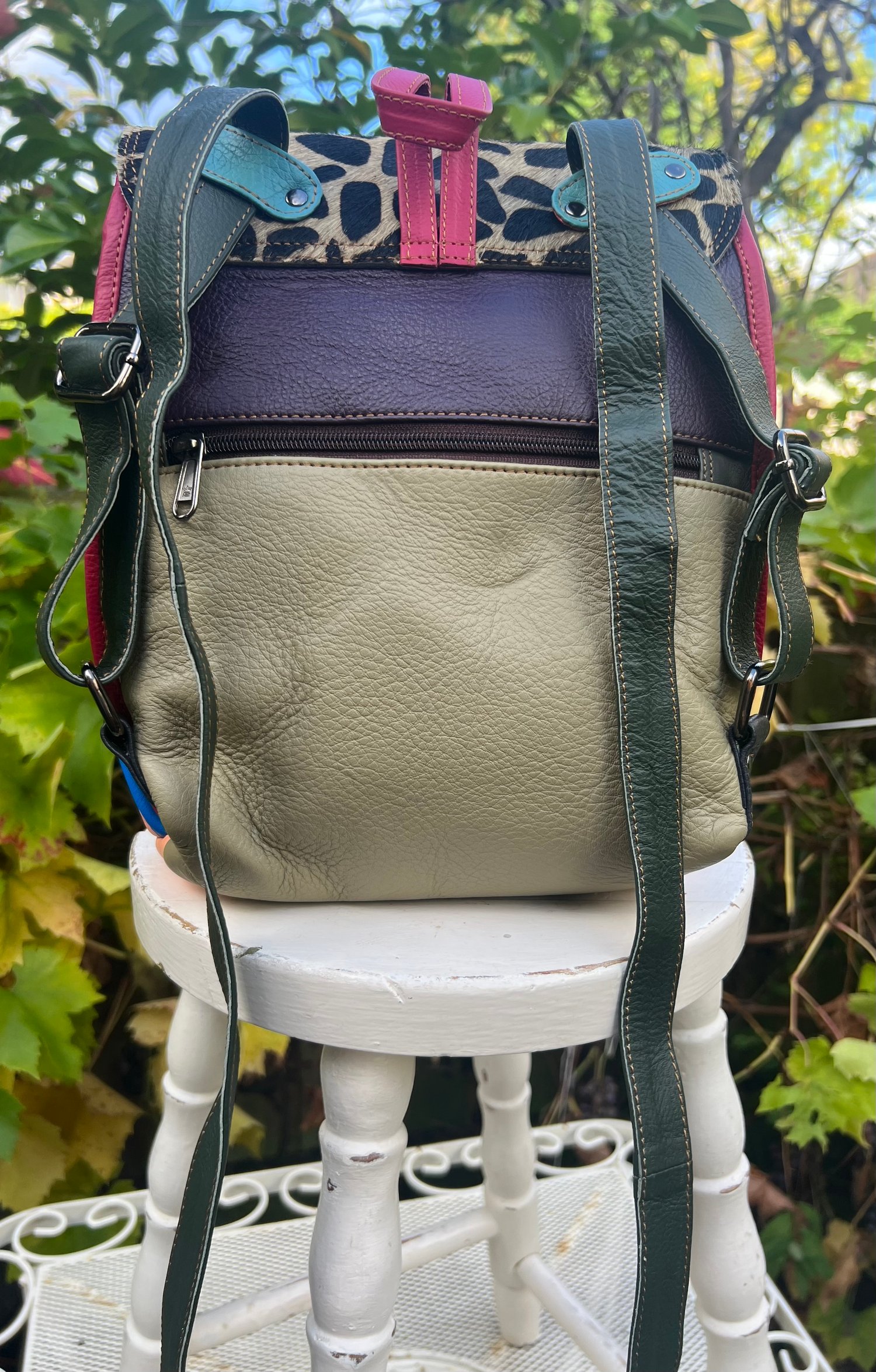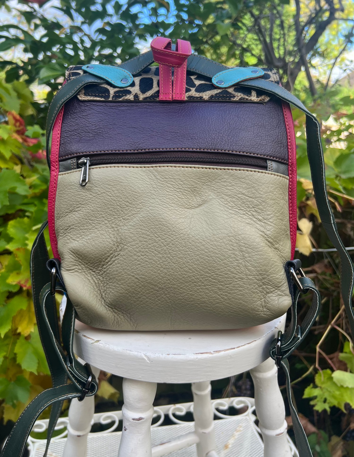 New to our Harlequin Collection is this multicoloured buffalo leather baby backpack which easily converts to a crossbody bag. Made from discarded leather offcuts, each one of our bags is one-of-a-kind.