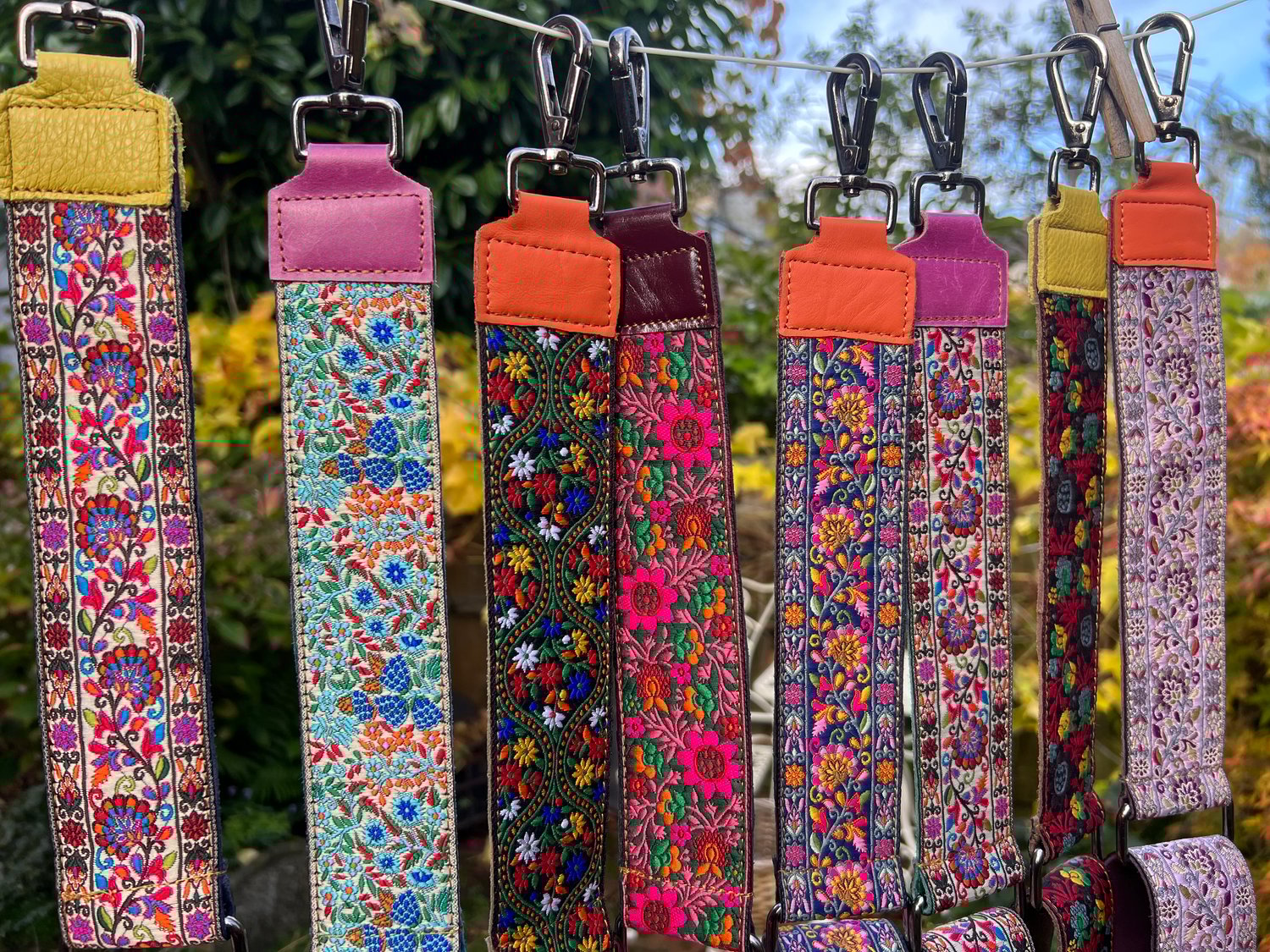 Beautiful and colourful embroidered/leather clip-on bag strap. Silver metal clips, adjustable for shoulder or crossbody use, backed with leather.