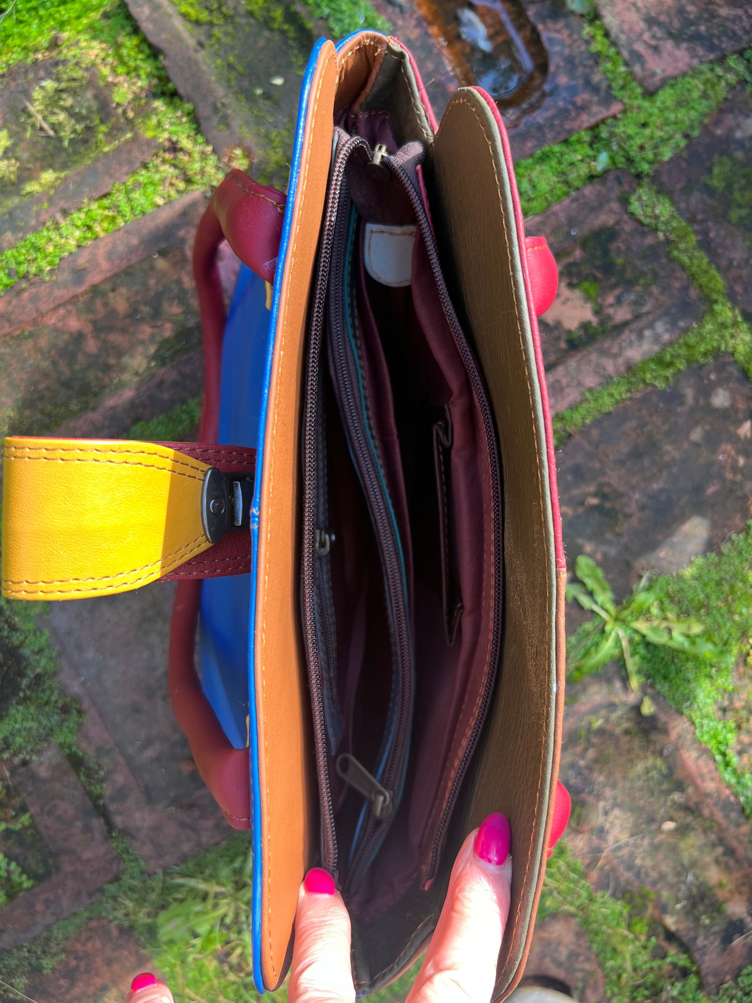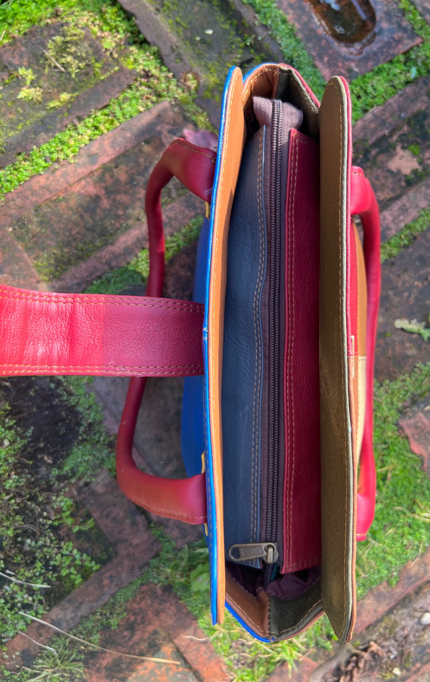 New to our Harlequin Collection is this fabulous colourful repurposed leather handbag. It will carry your iPad, with the top zip just fastening.