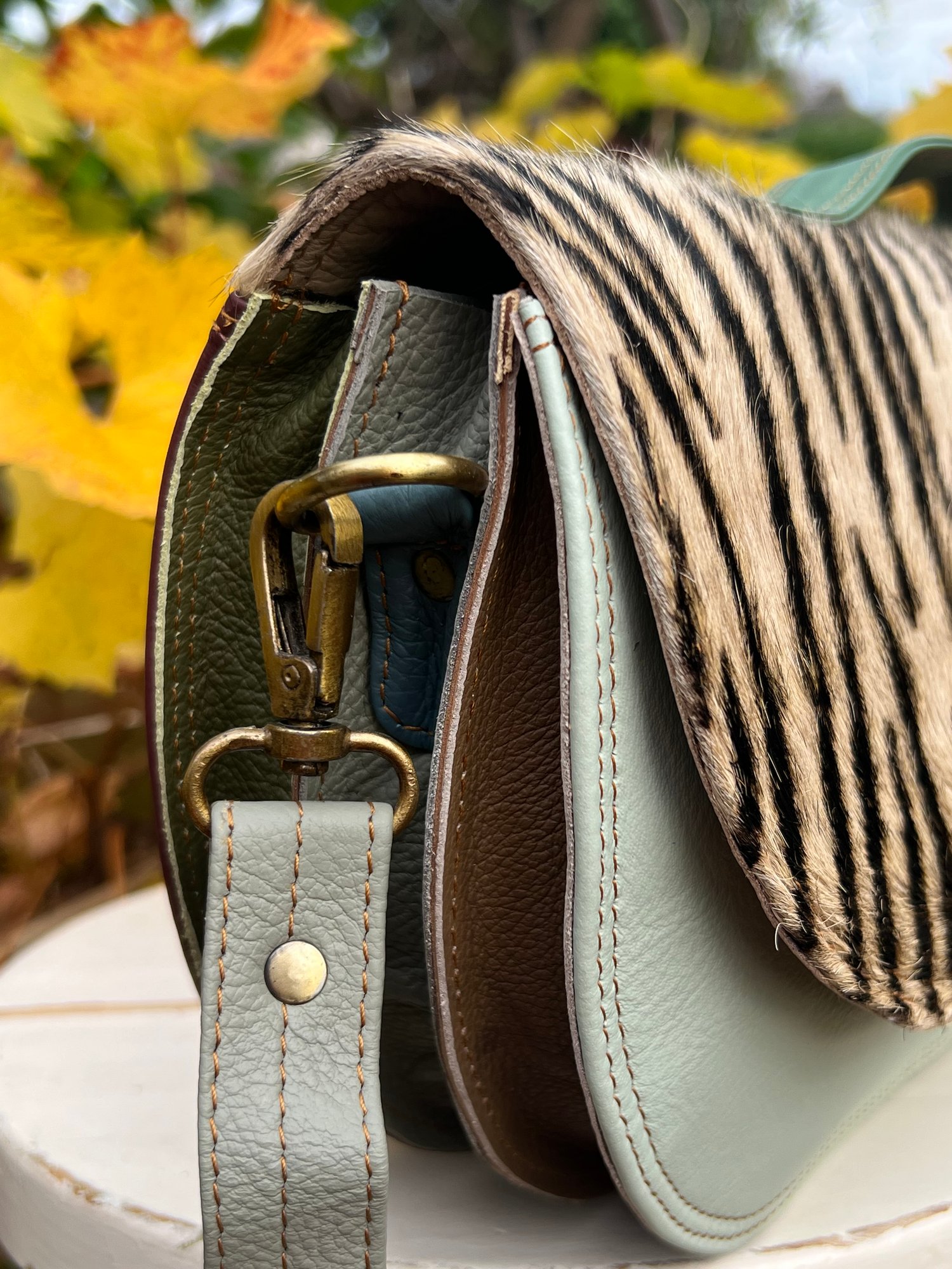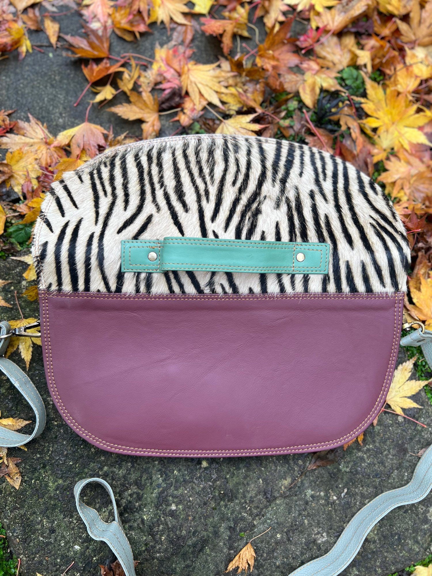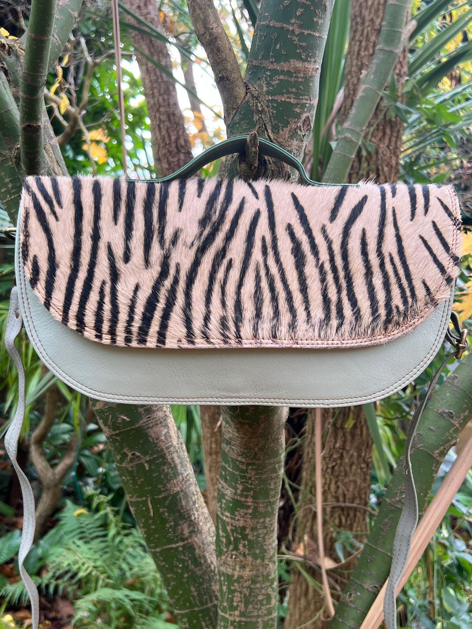 Externally, the animal print fur flap closes with two magnetic studs, there is a carry handle plus a long adjustable bolt-on leather strap (59”)