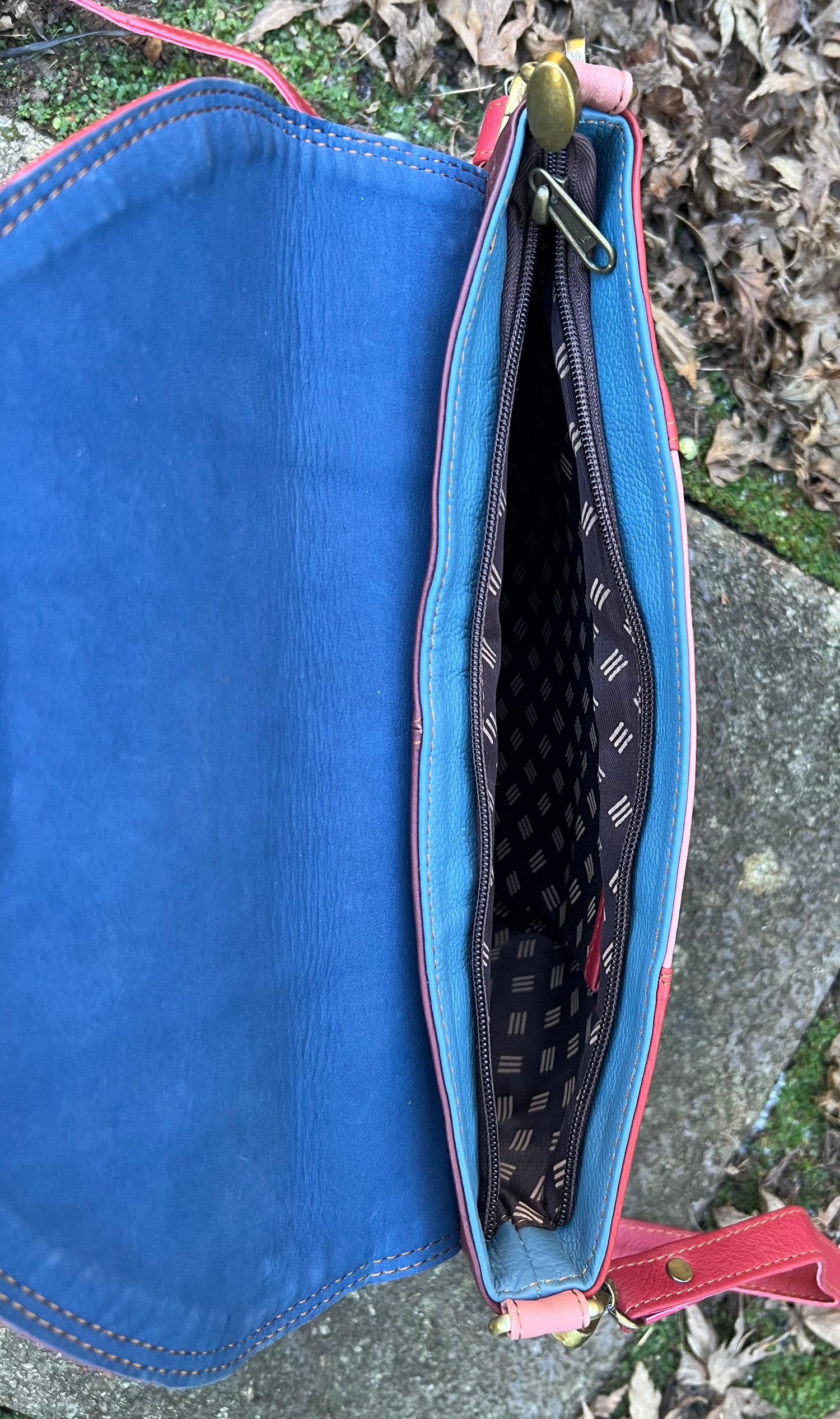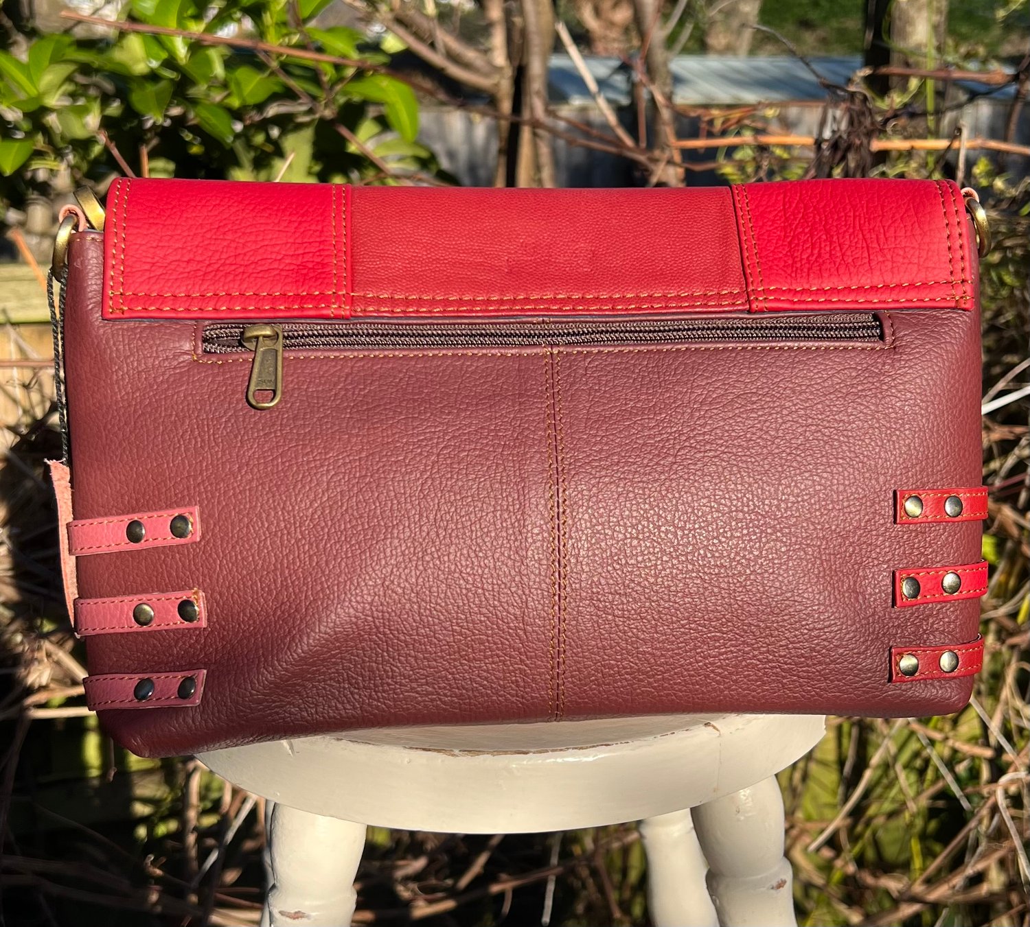 Externally, to the back is a large zipped pocket and the front flap fastens with a magnetic stud.