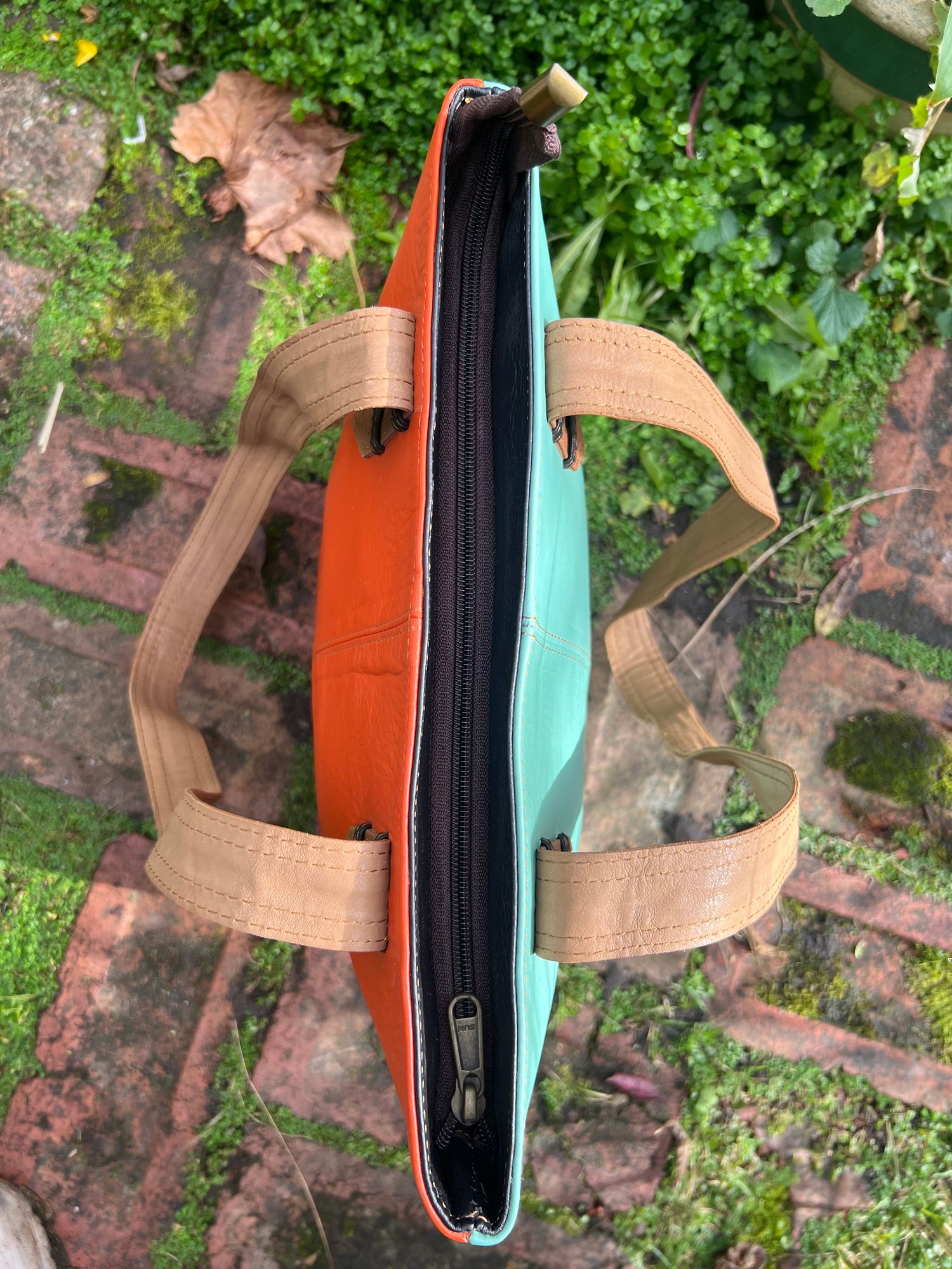 A simply designed, stylish and sturdy tote in coloured buffalo leather.  Different colour combos on each side, so 2 bags in 1!