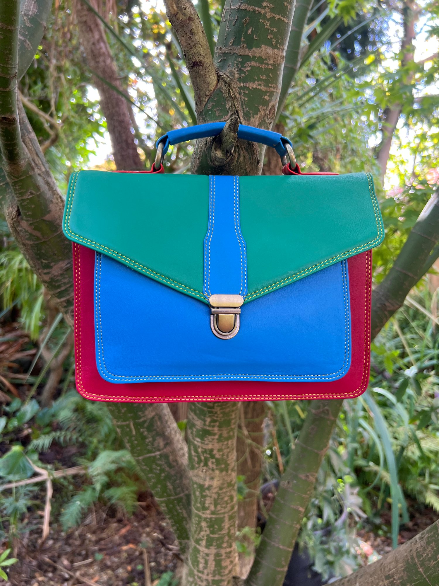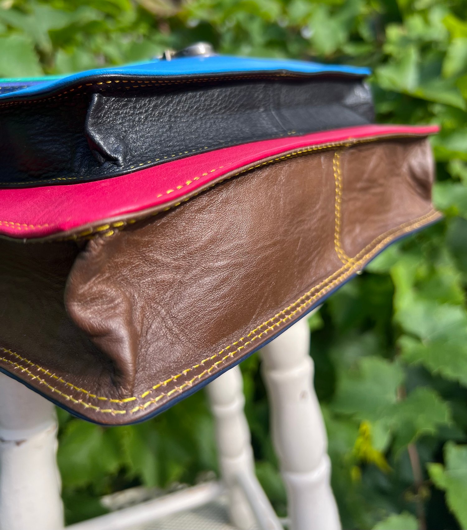 A favourite of our Harlequin Collection is this unusual recycled buffalo leather bag with shoulder strap and carry handle.