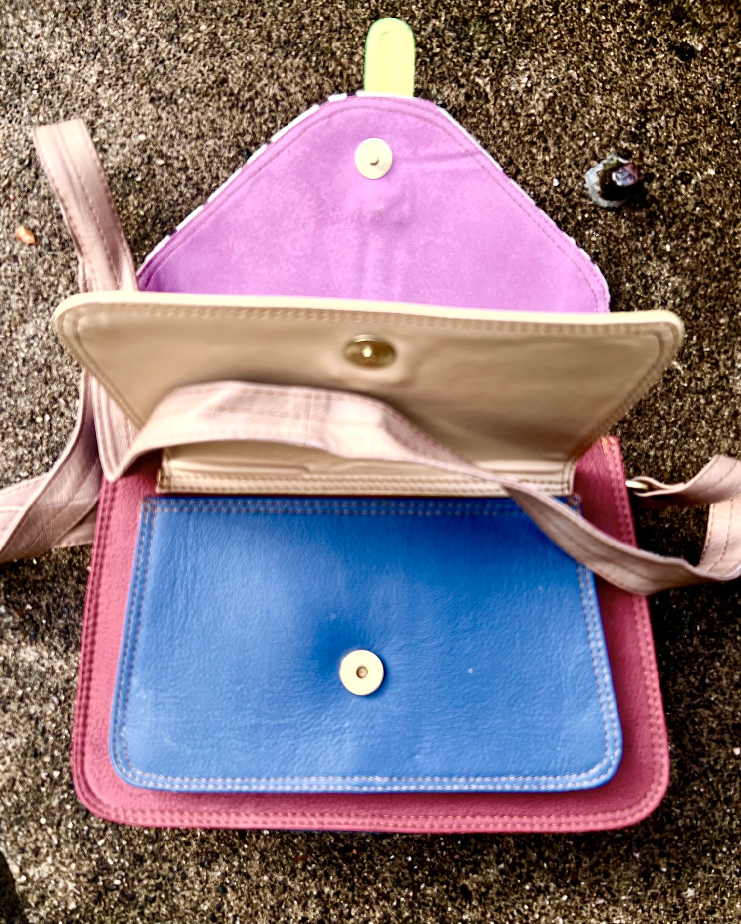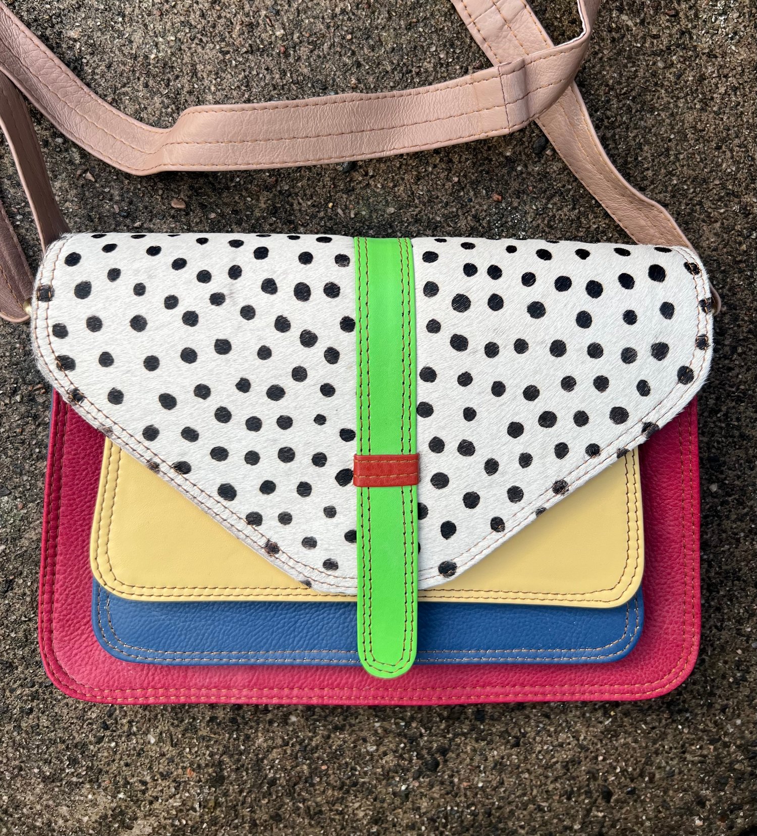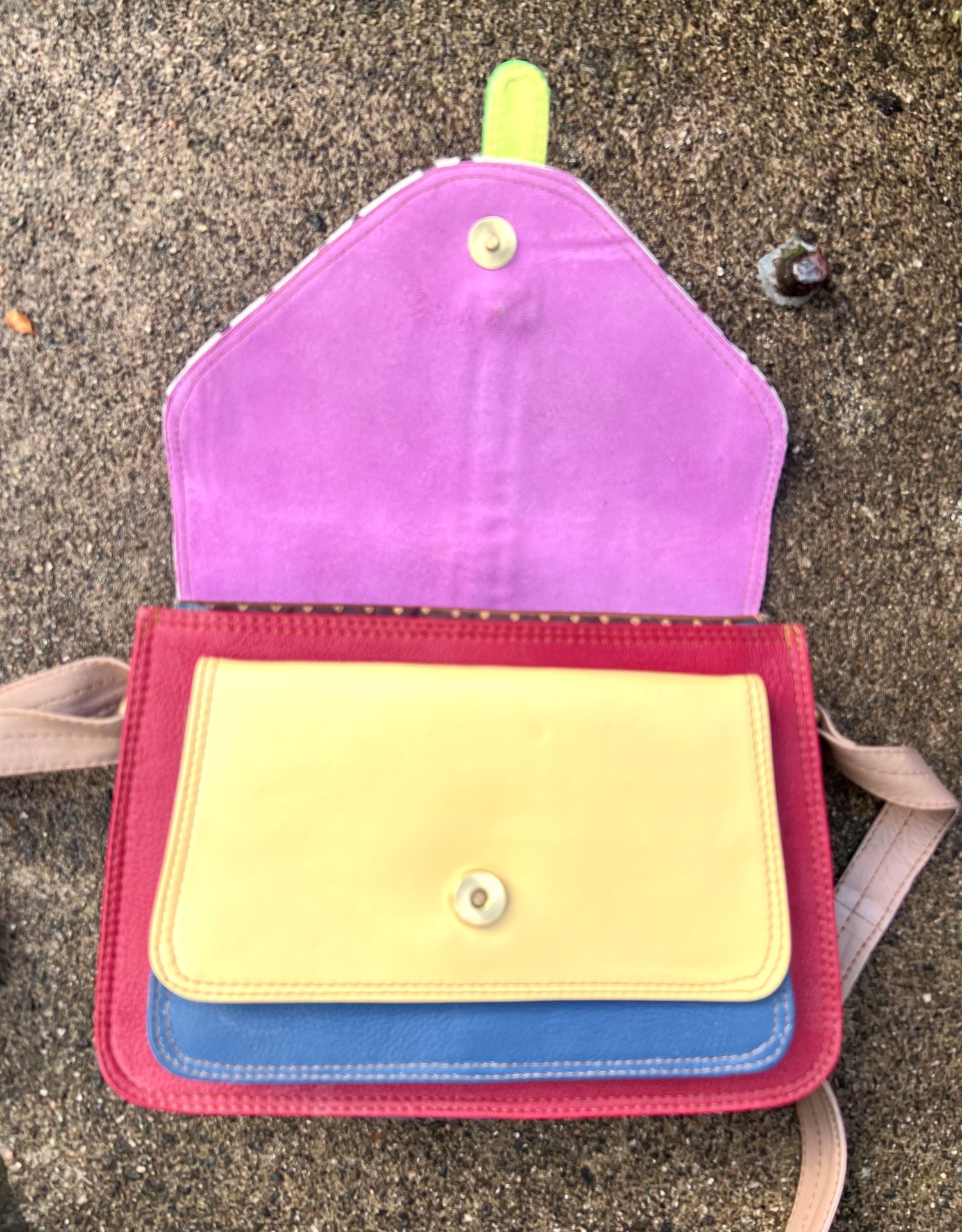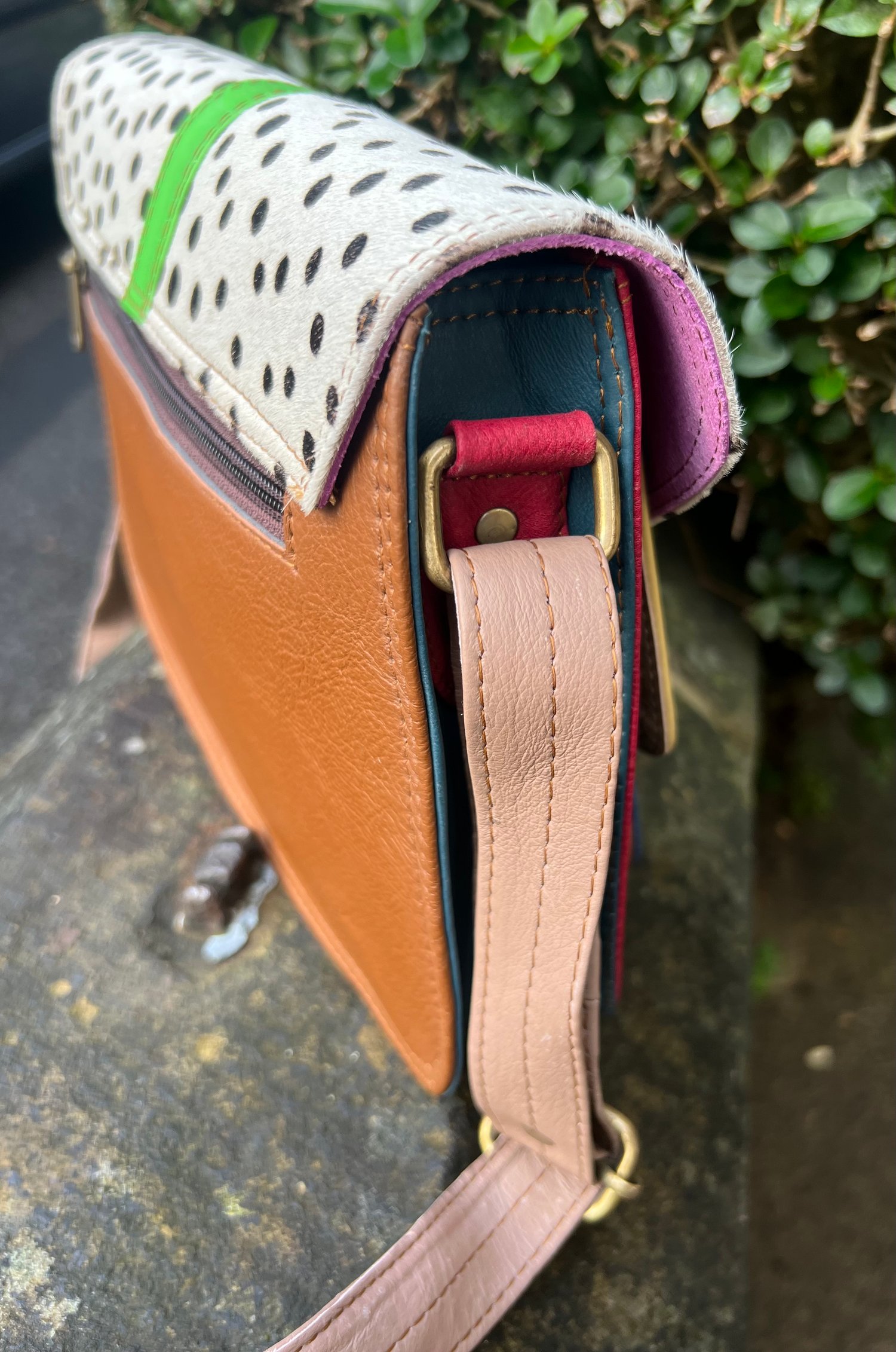 A unusual stylish bag of fabulous colours, which will brighten up any outfit. Crafted by our Indian artisans from leather offcuts, it’s a unique, one-of-a-kind bag - and a really useful size.