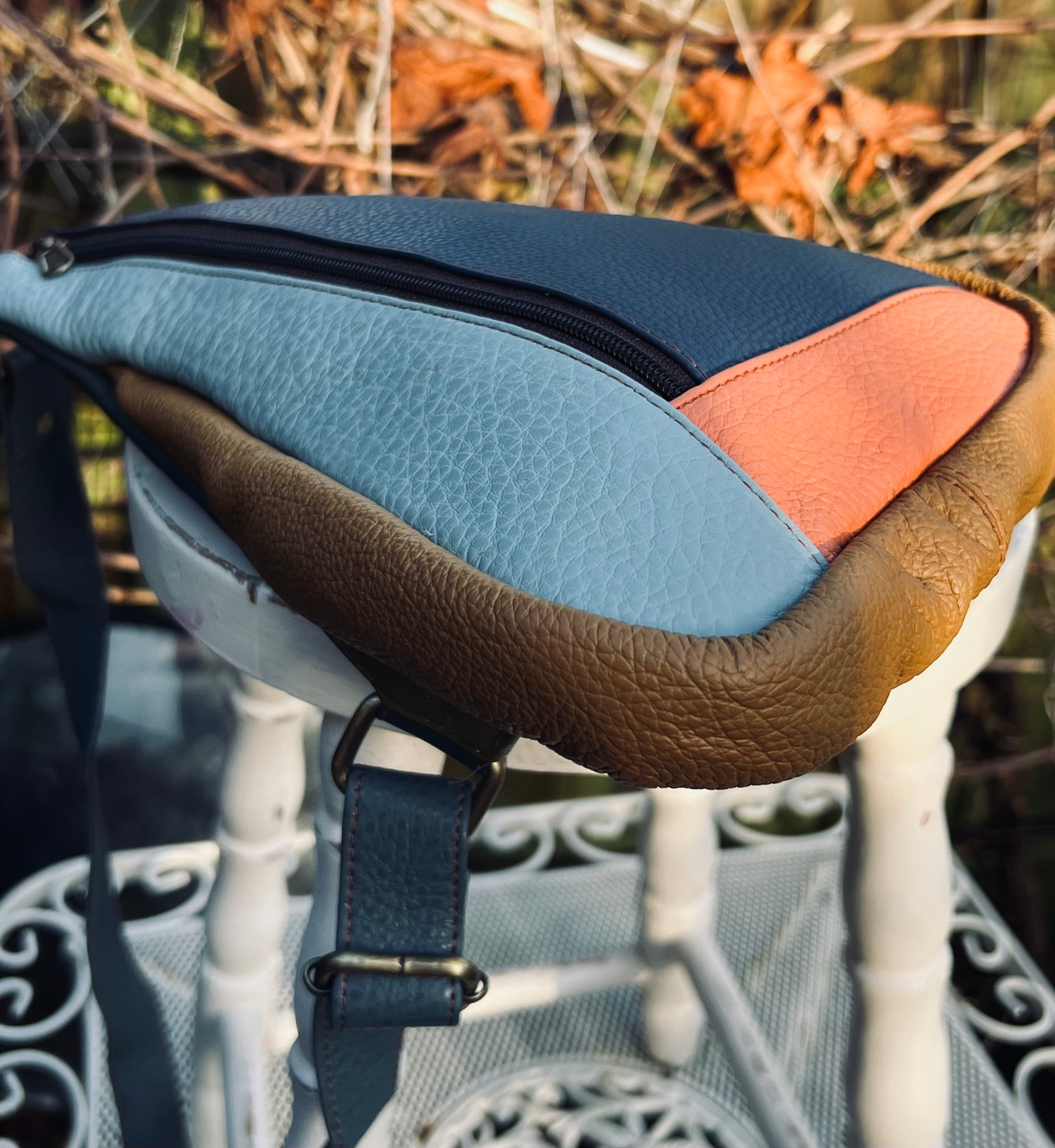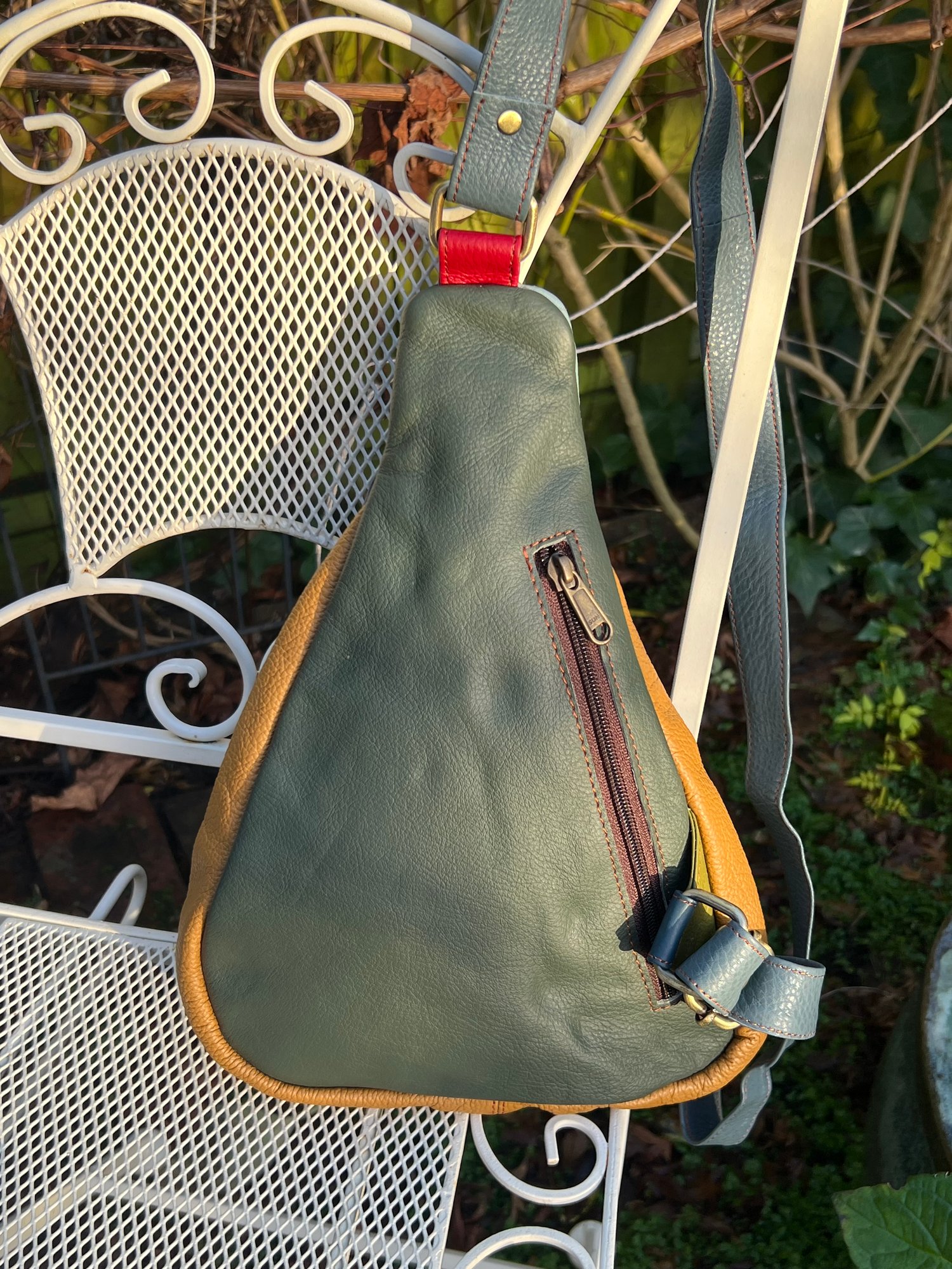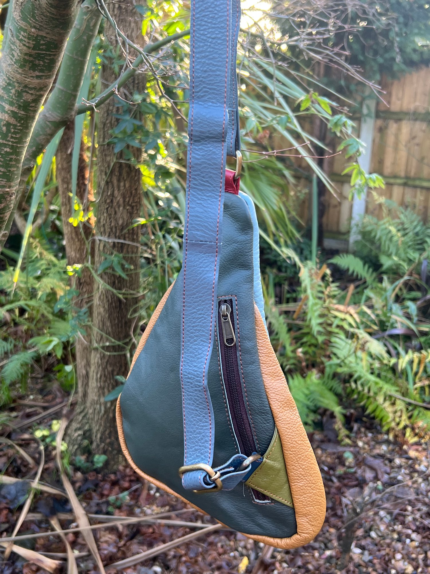 This small stylish bag is unique and crafted from repurposed offcuts of coloured buffalo leather.