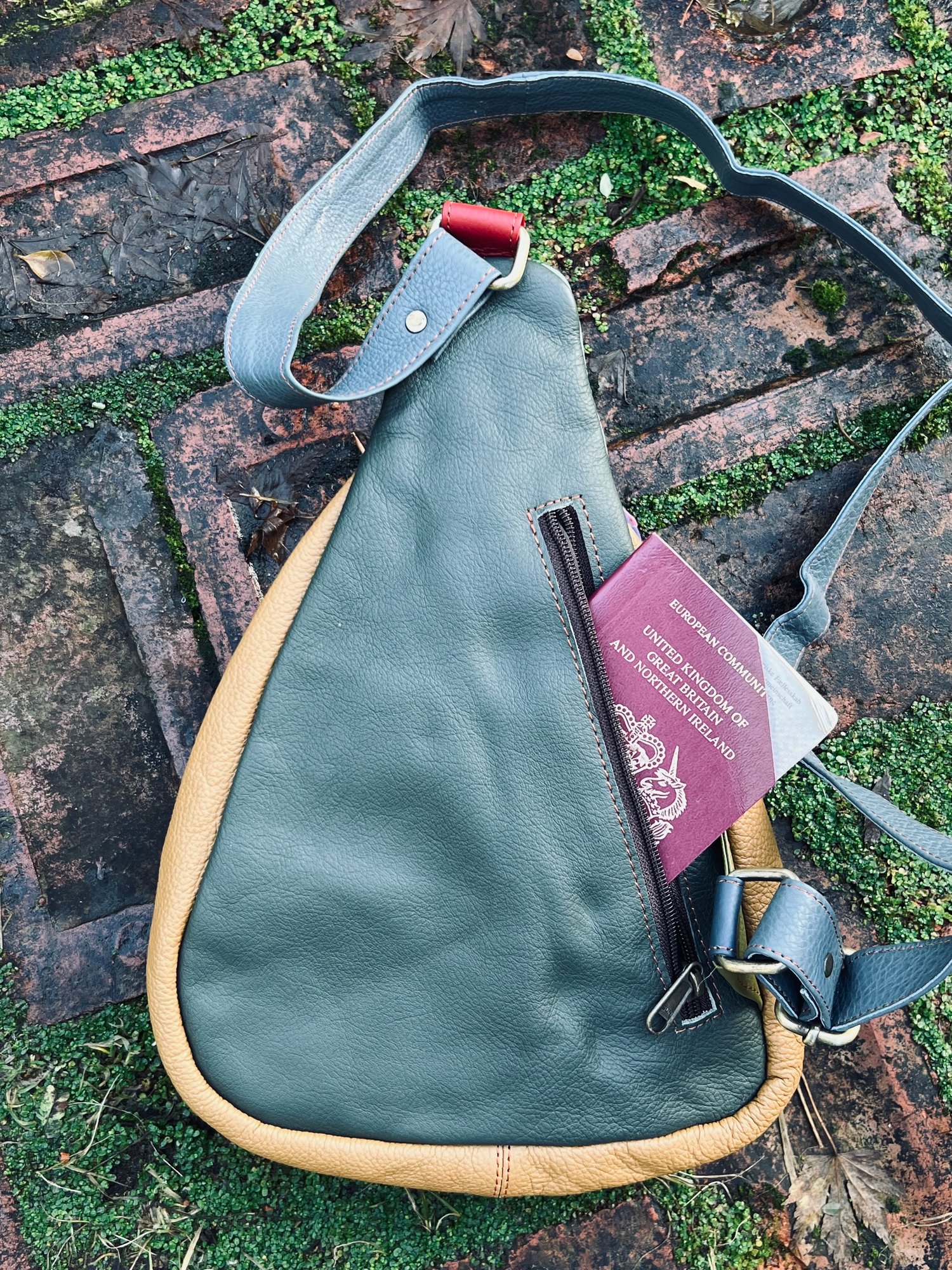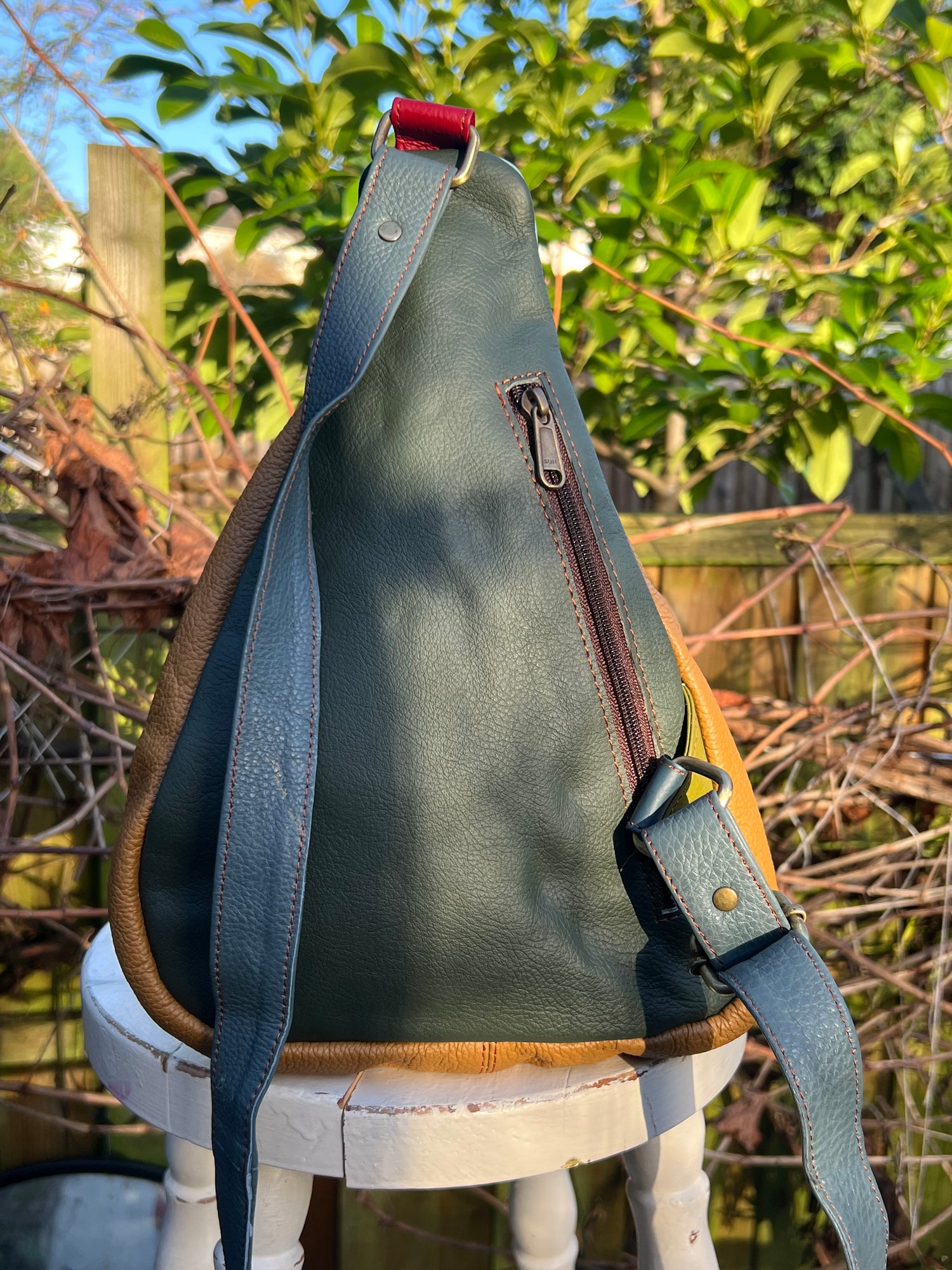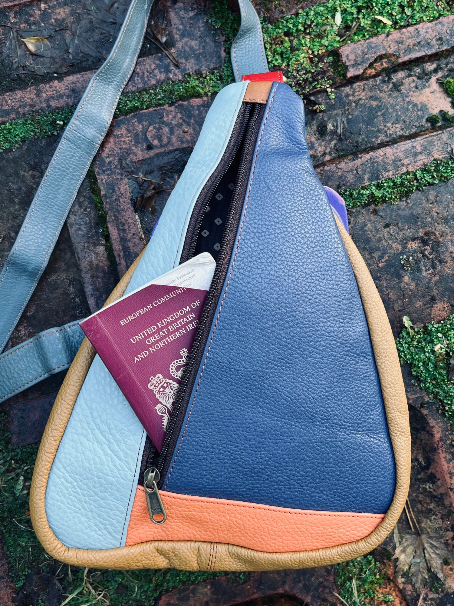 This small stylish bag is unique and crafted from repurposed offcuts of coloured buffalo leather.
