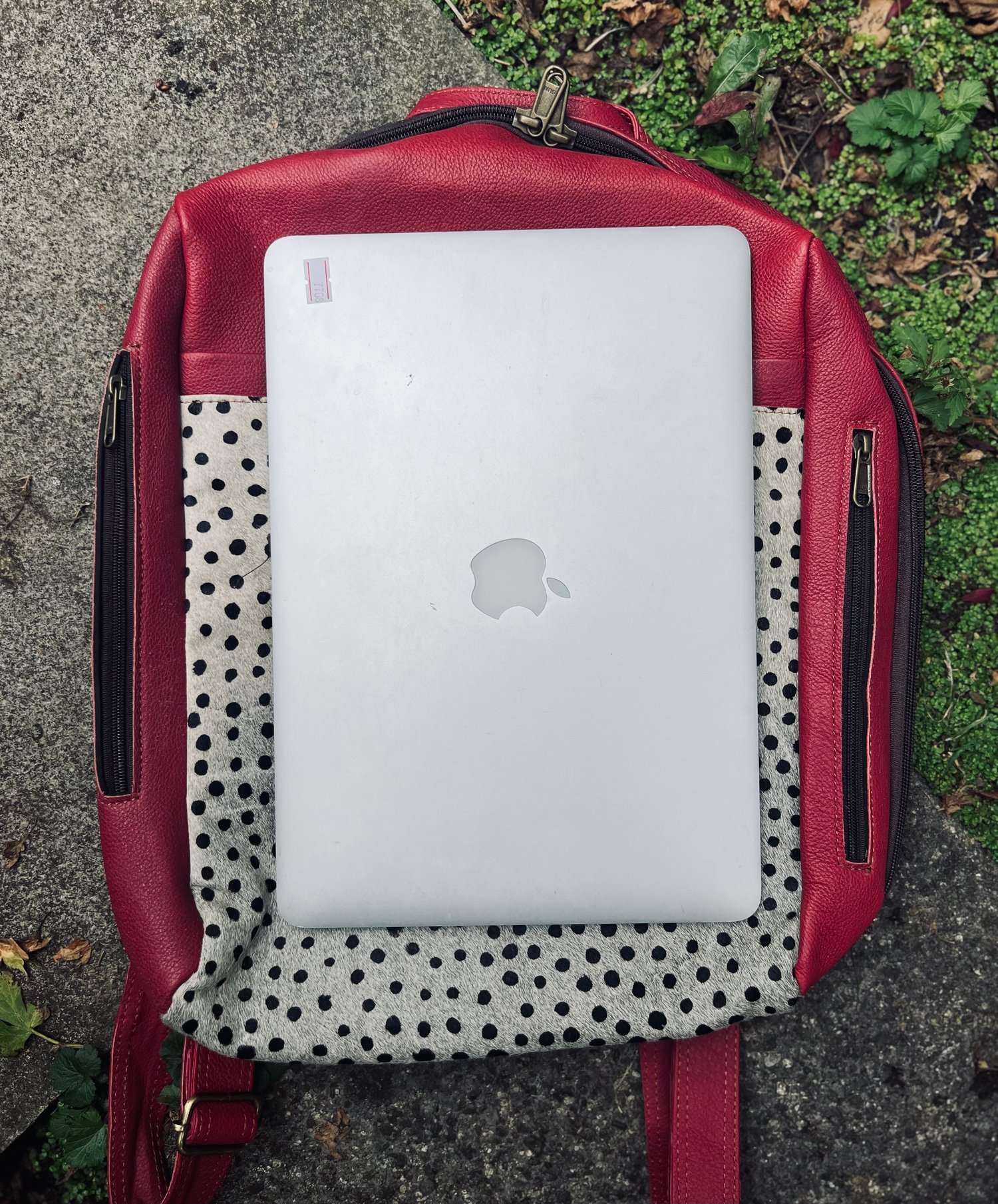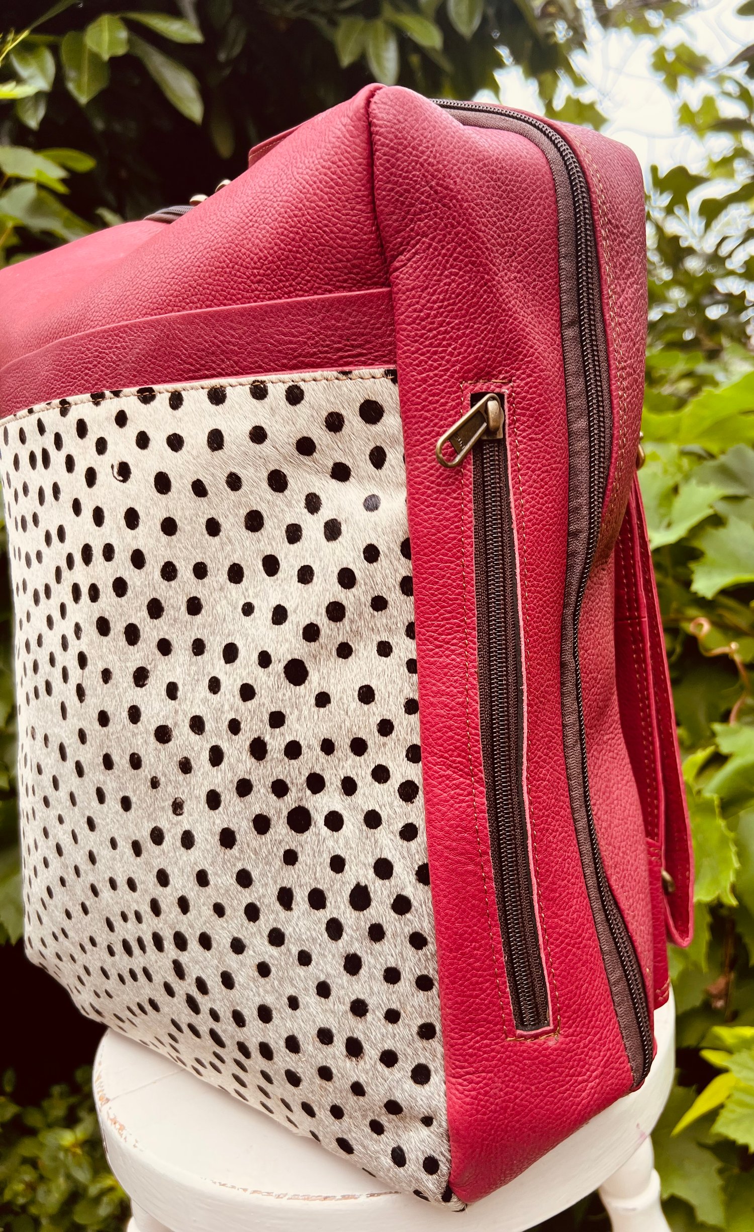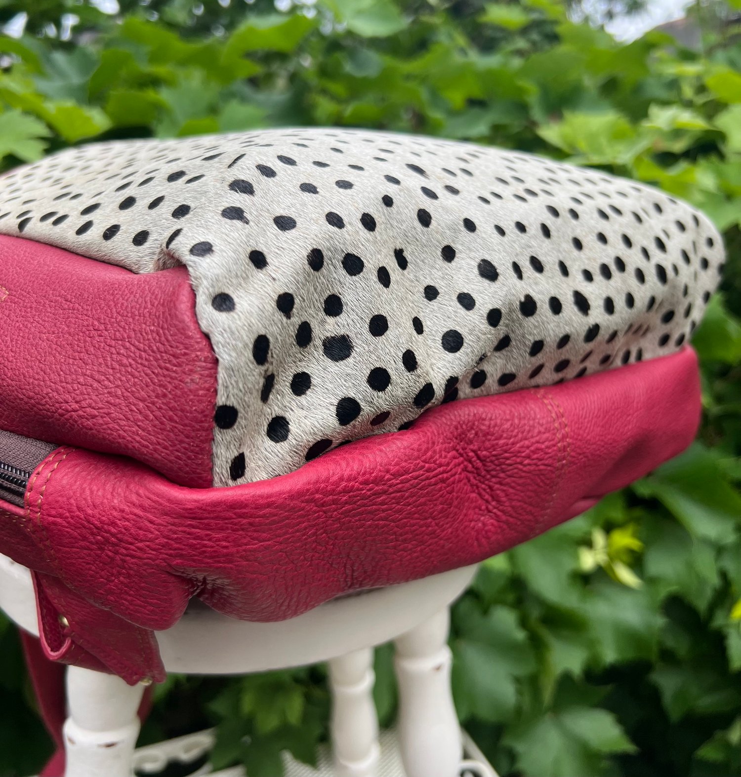 Large buffalo leather/printed fur backpack which easily converts to a crossbody bag.