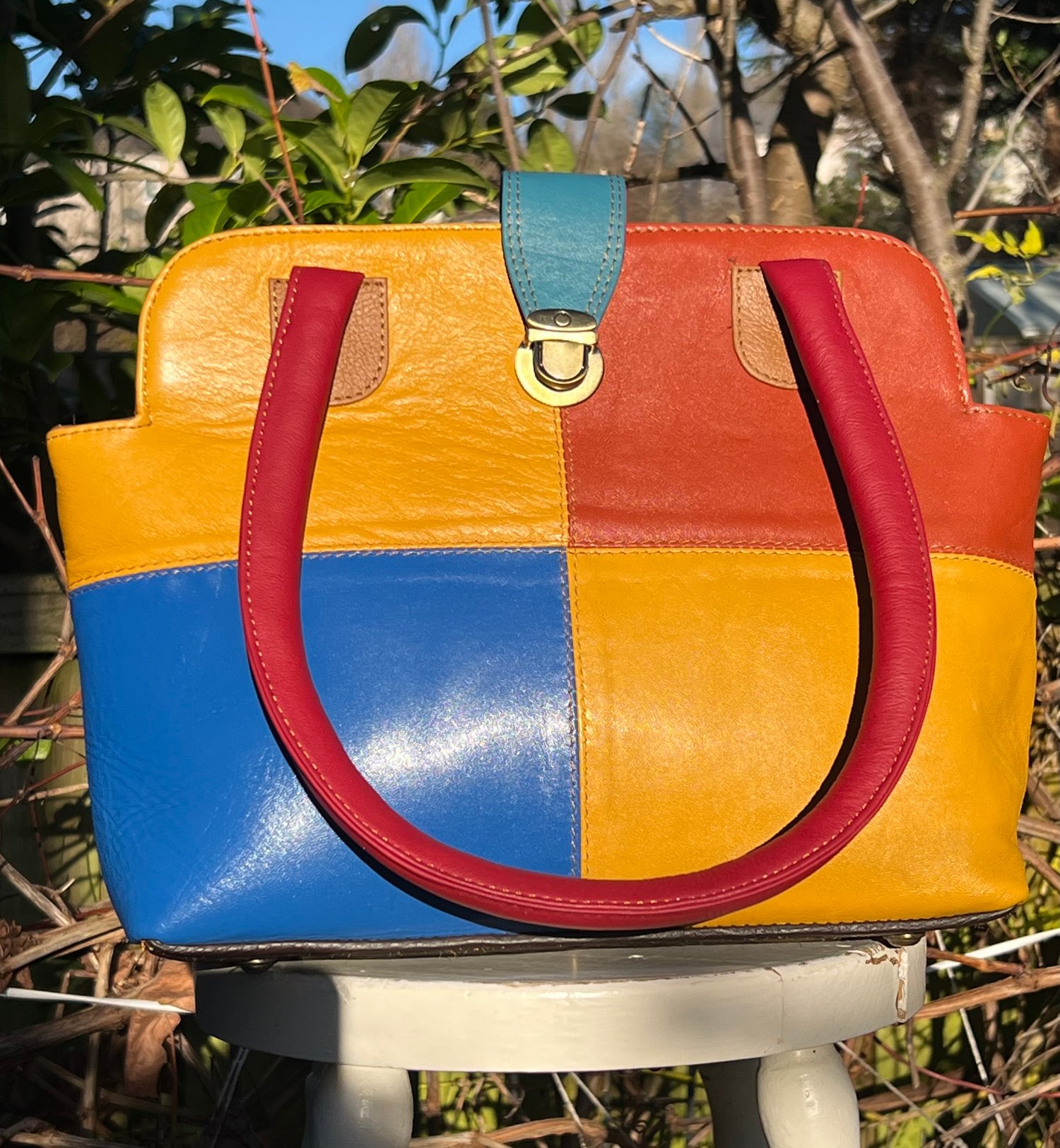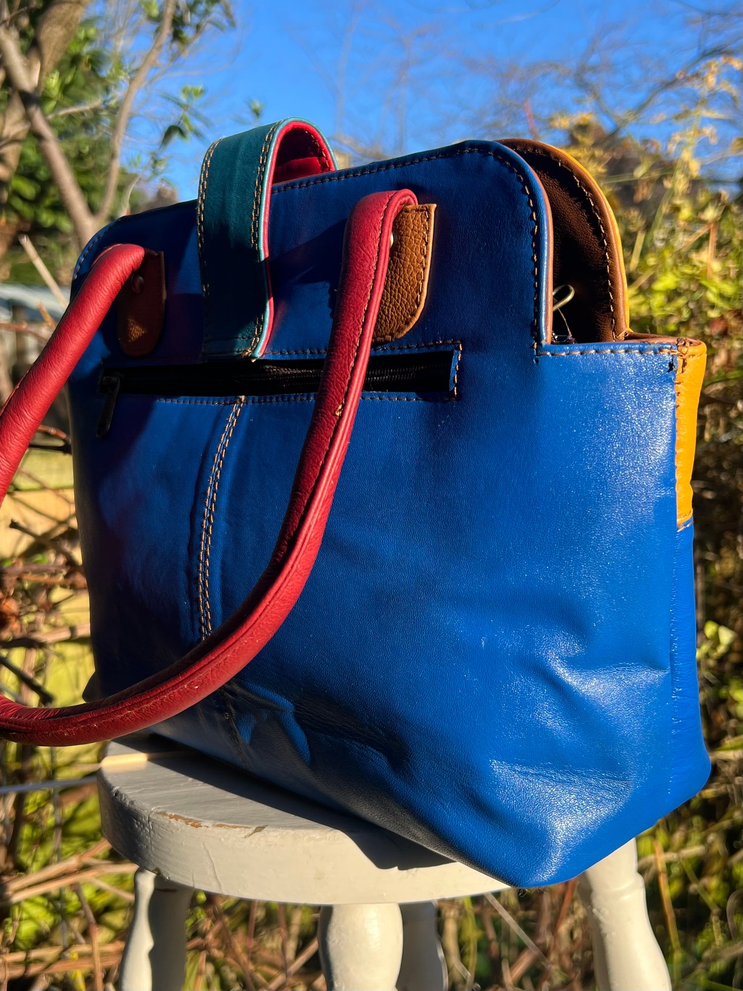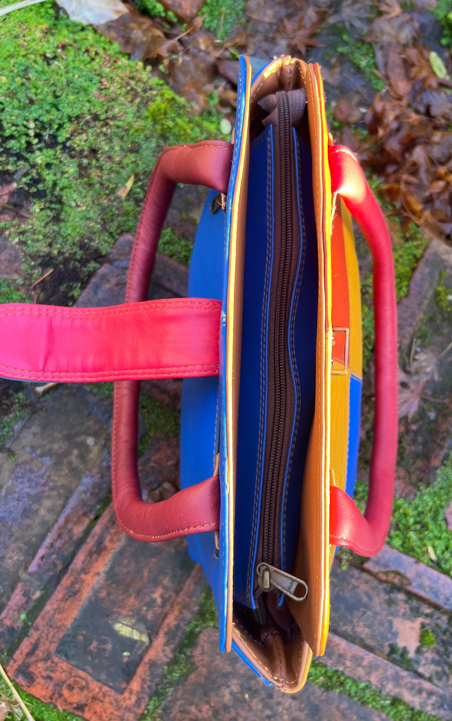New to our Harlequin Collection is this fabulous colourful repurposed leather handbag. It will carry your iPad, with the top zip just fastening.
