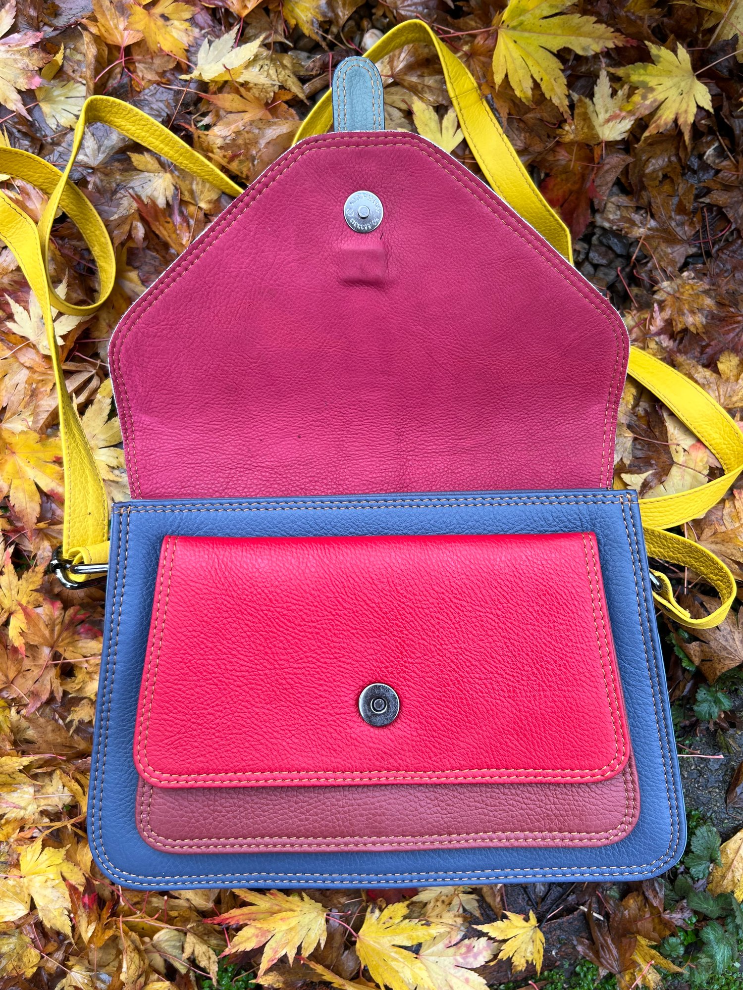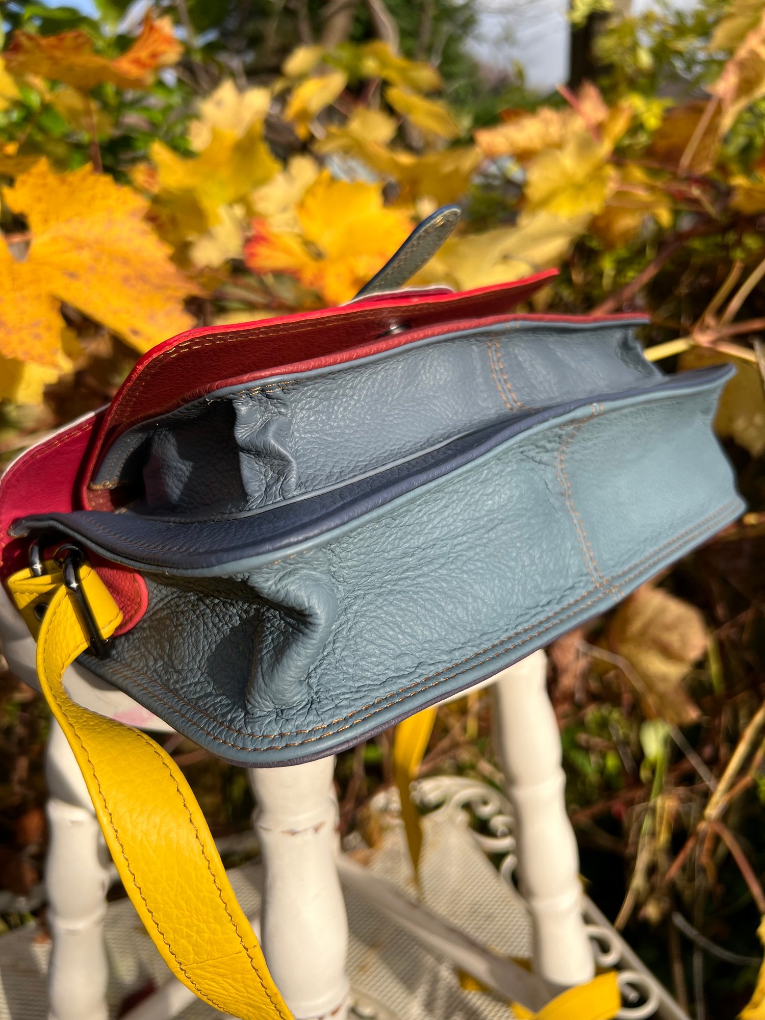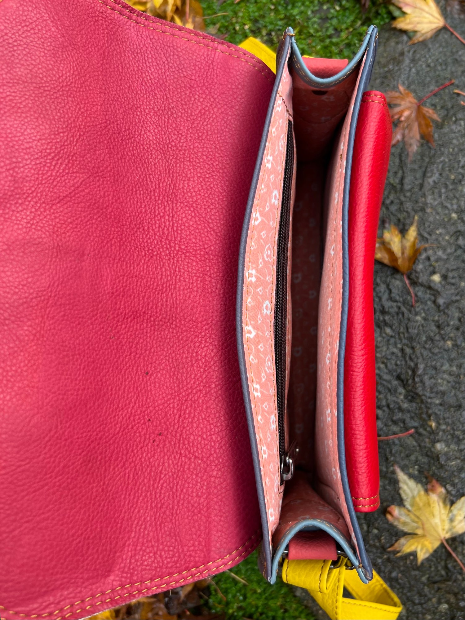 A unusual stylish bag of fabulous colours, which will brighten up any outfit. Crafted by our Indian artisans from leather offcuts, it’s a unique, one-of-a-kind bag - and a really useful size.