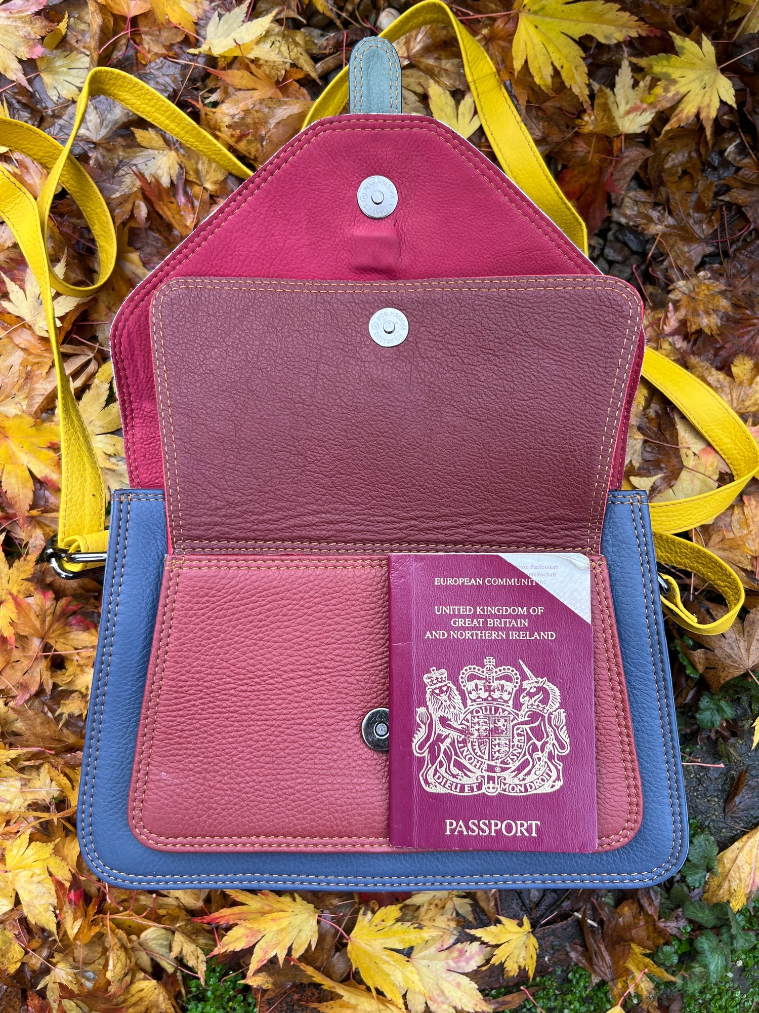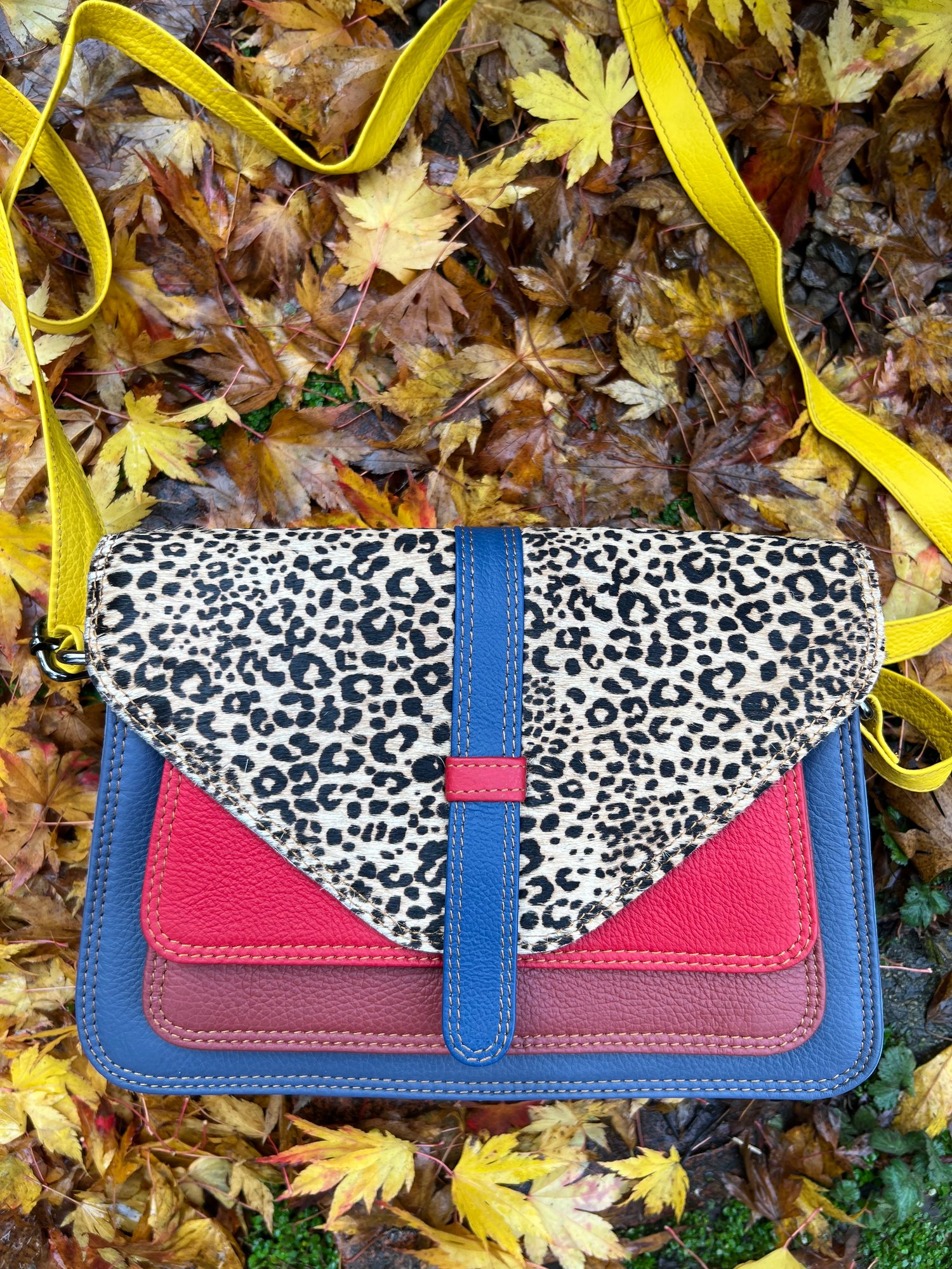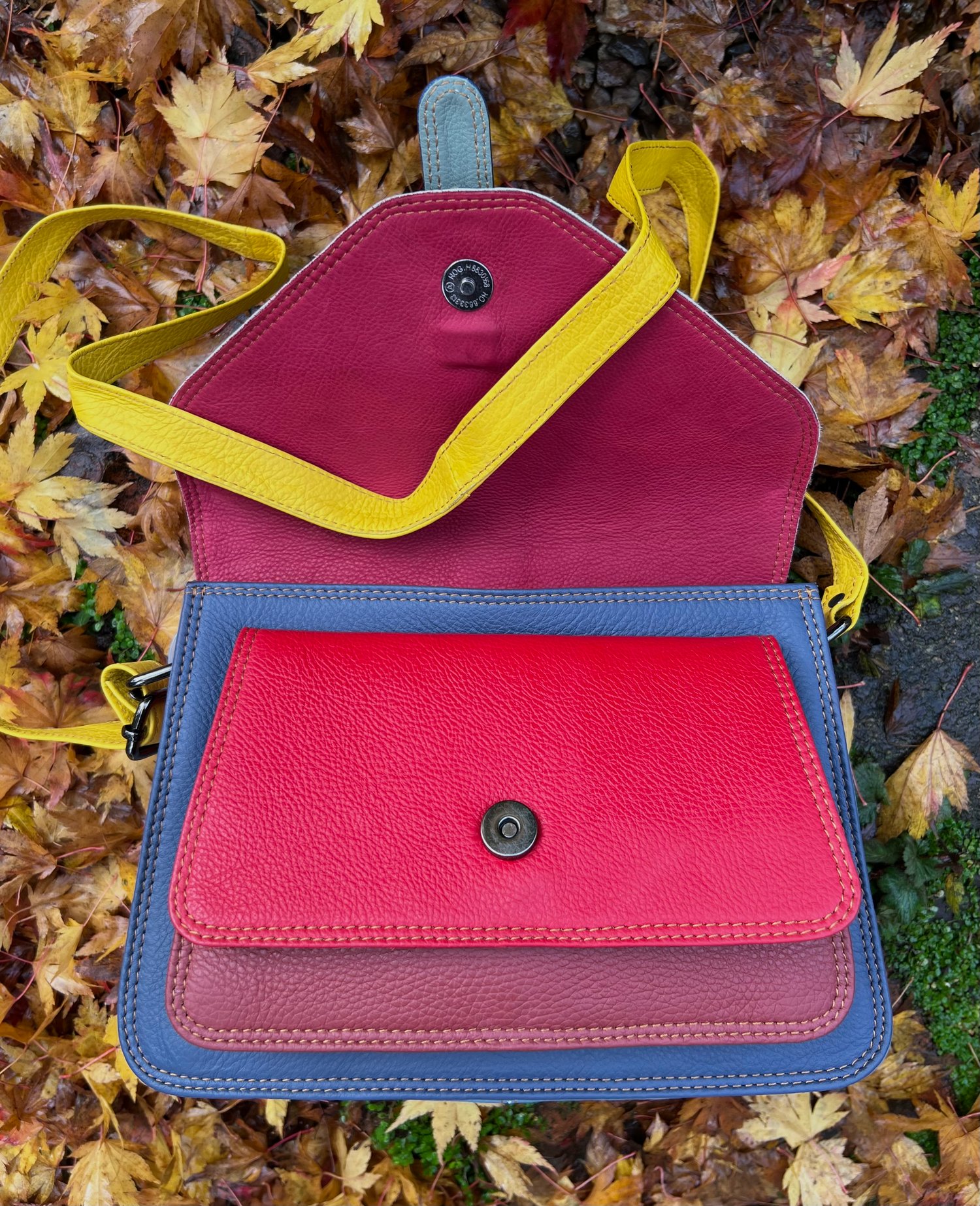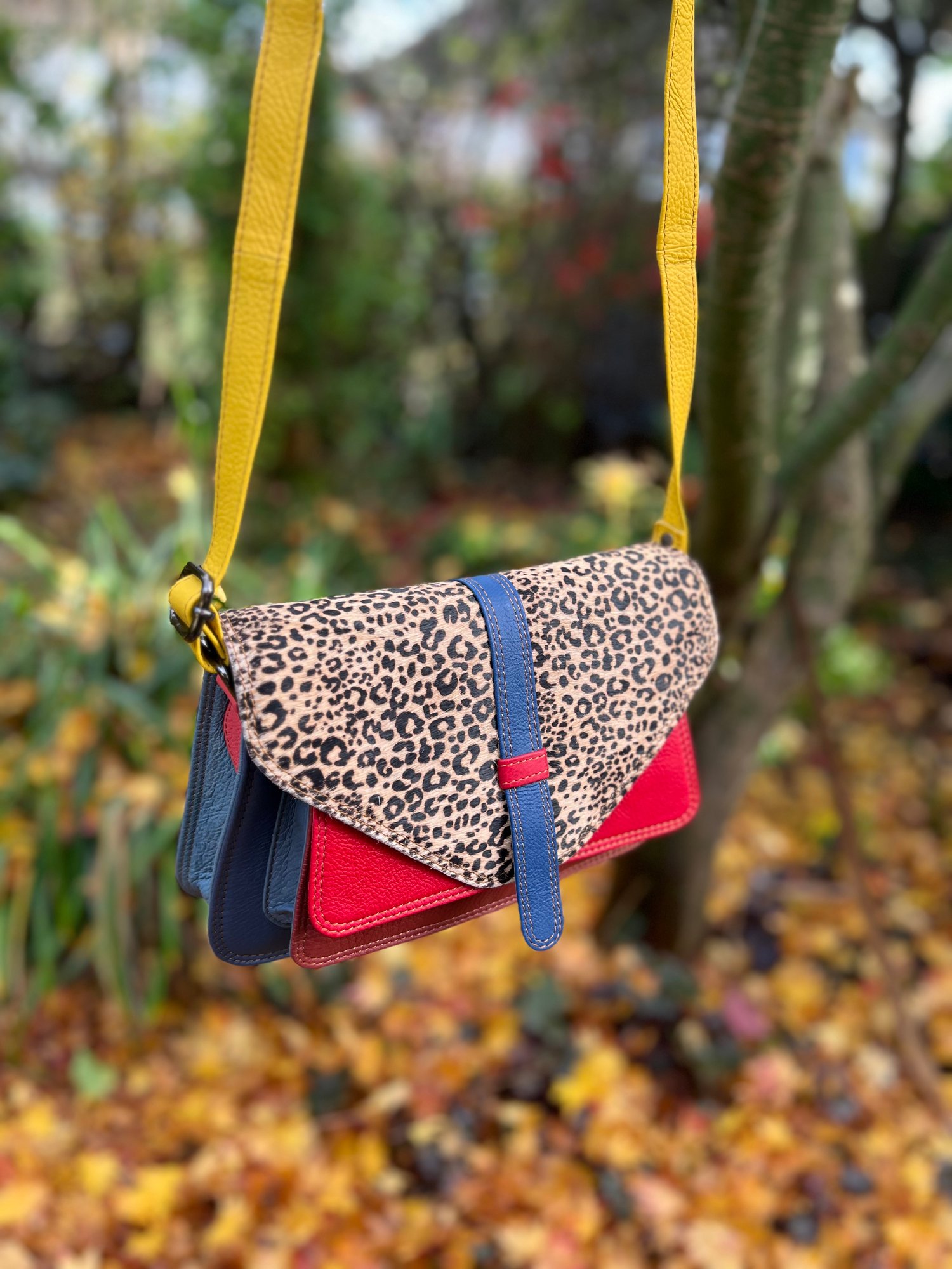 A unusual stylish bag of fabulous colours, which will brighten up any outfit. Crafted by our Indian artisans from leather offcuts, it’s a unique, one-of-a-kind bag - and a really useful size.