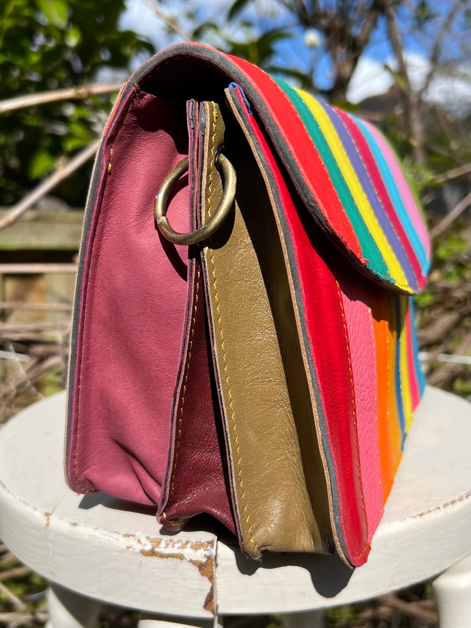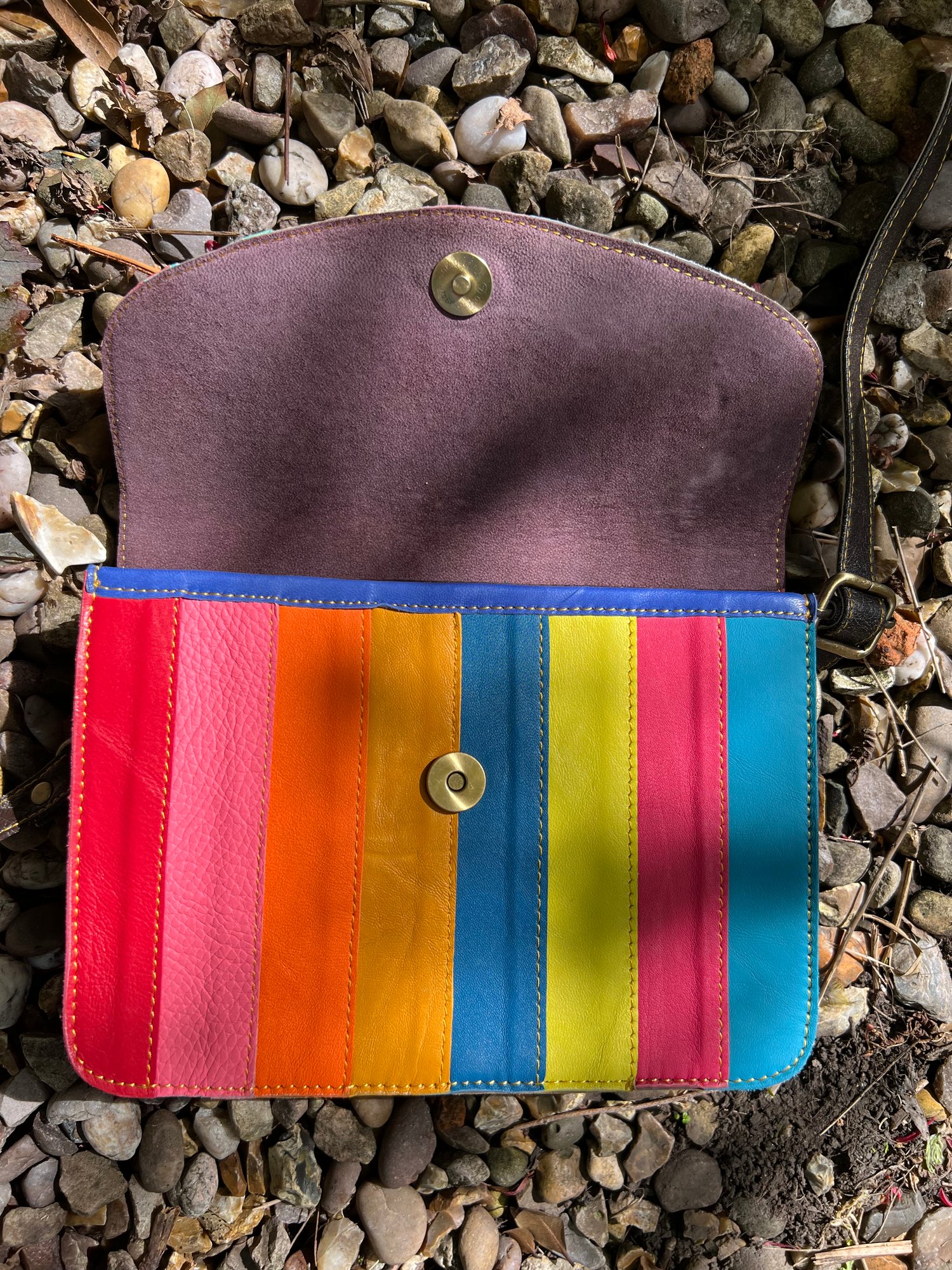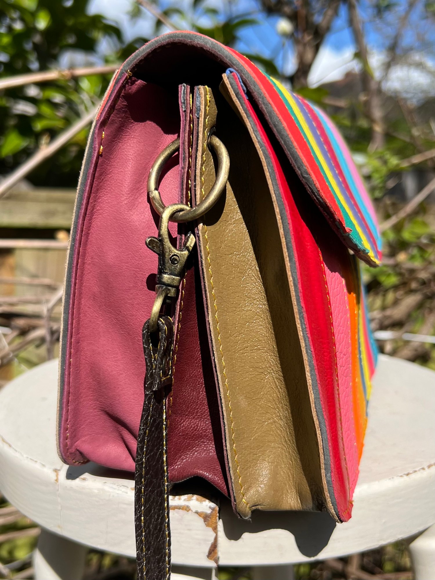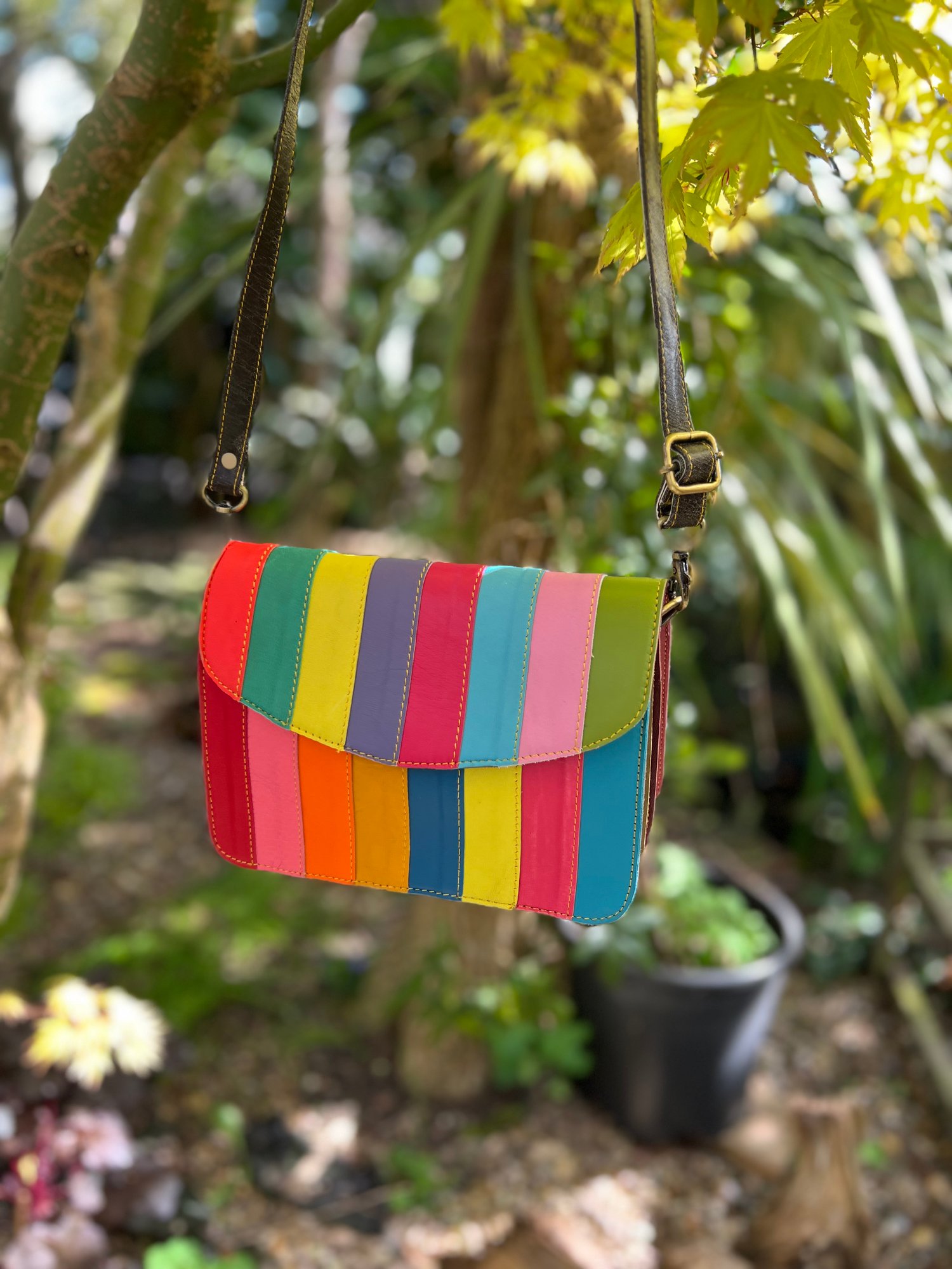 Brand new to our Harlequin Collection is this amazing multi-coloured striped bag, which will certainly bring a wow to any outfit! Made from sustainable buffalo leather offcuts, otherwise destined for landfill, this unique small bag is crafted by our Indian artisans.