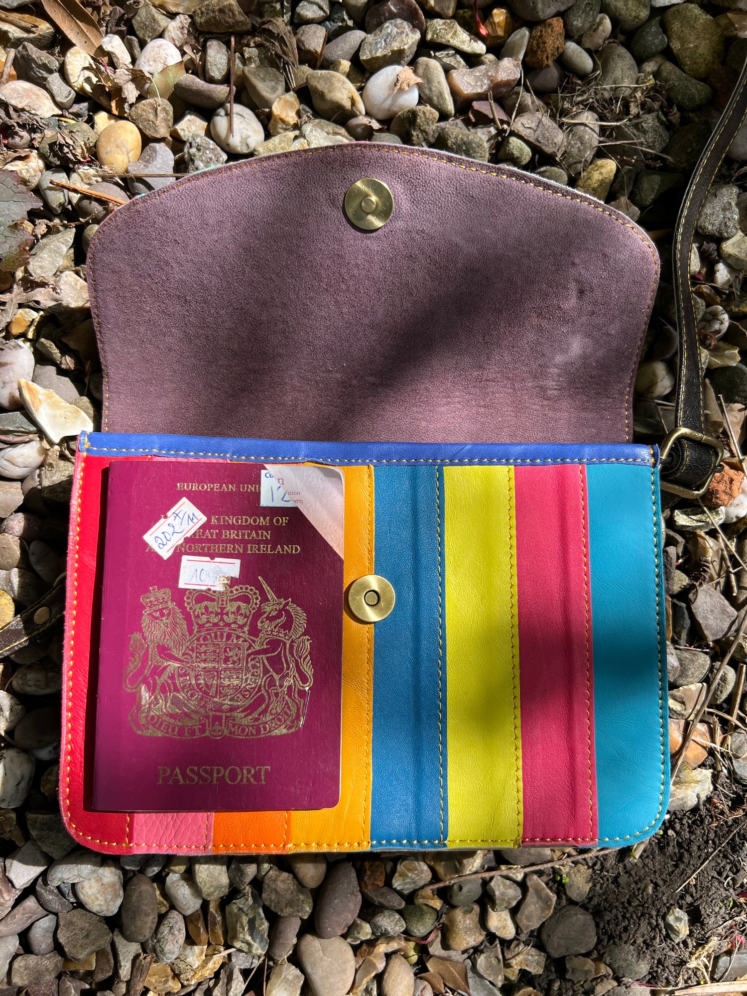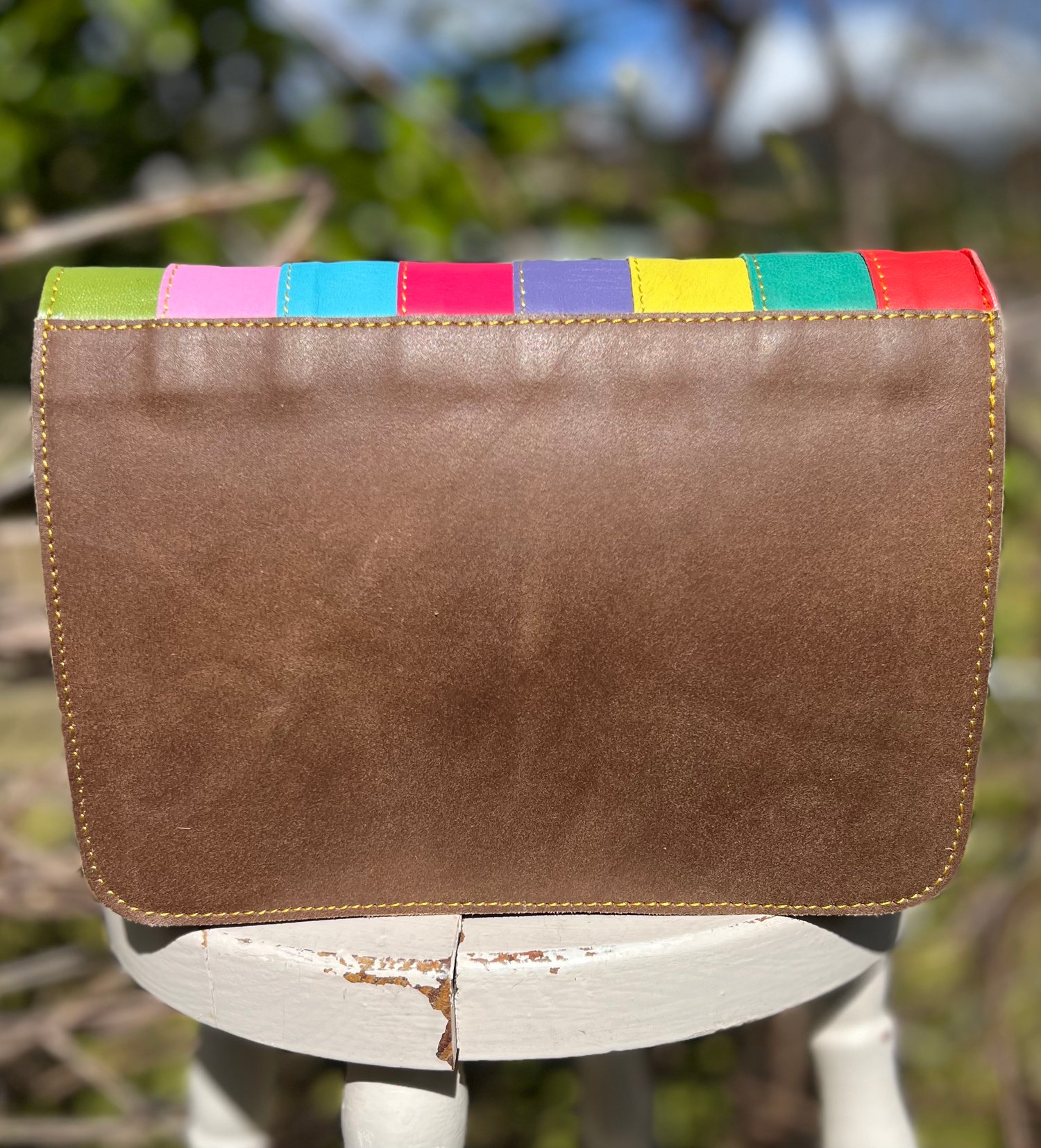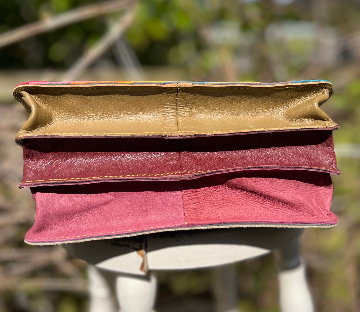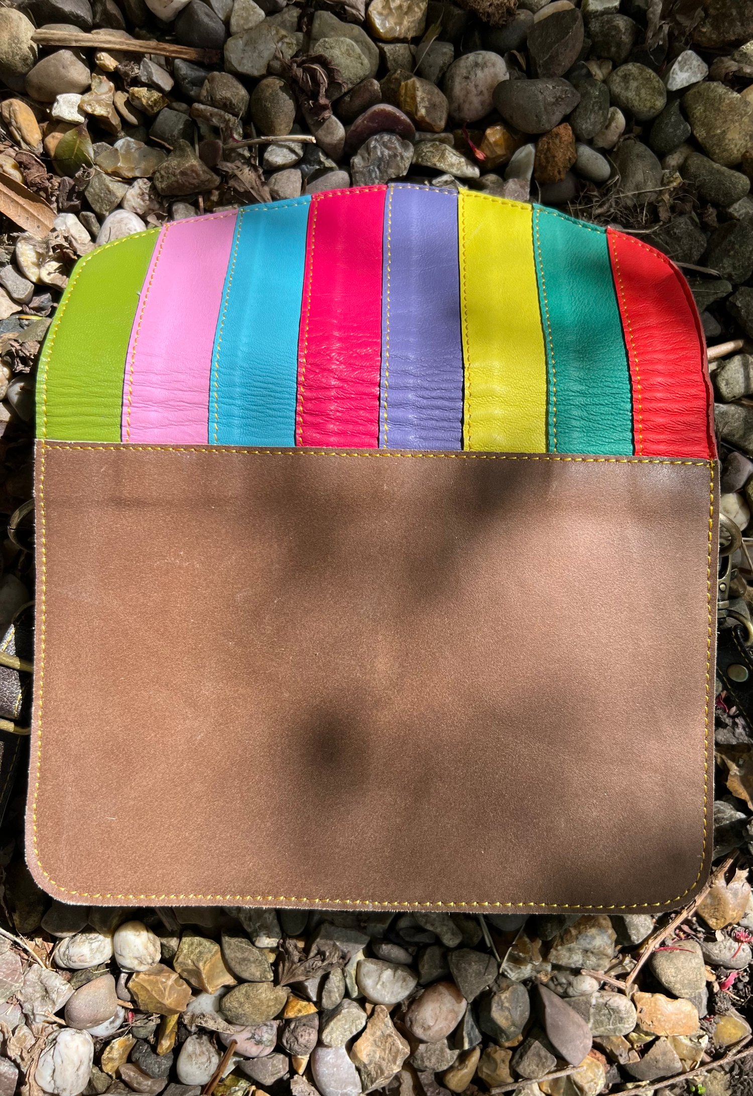 Brand new to our Harlequin Collection is this amazing multi-coloured striped bag, which will certainly bring a wow to any outfit! Made from sustainable buffalo leather offcuts, otherwise destined for landfill, this unique small bag is crafted by our Indian artisans.