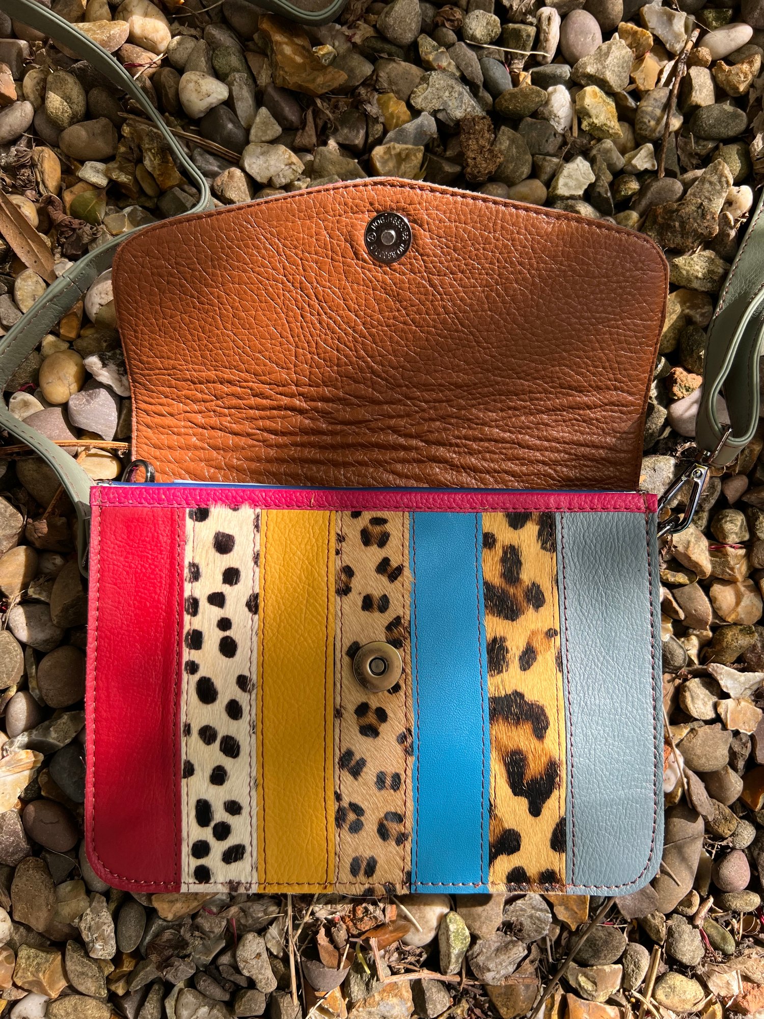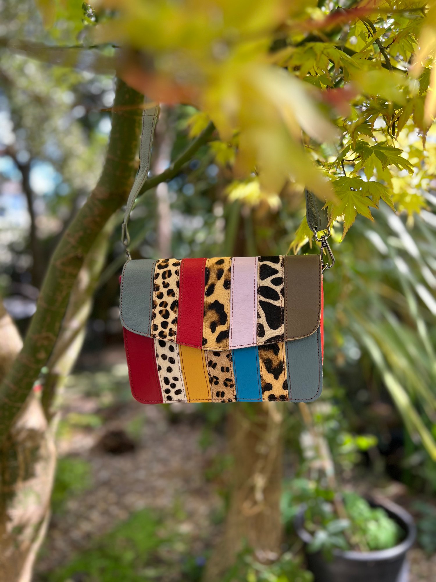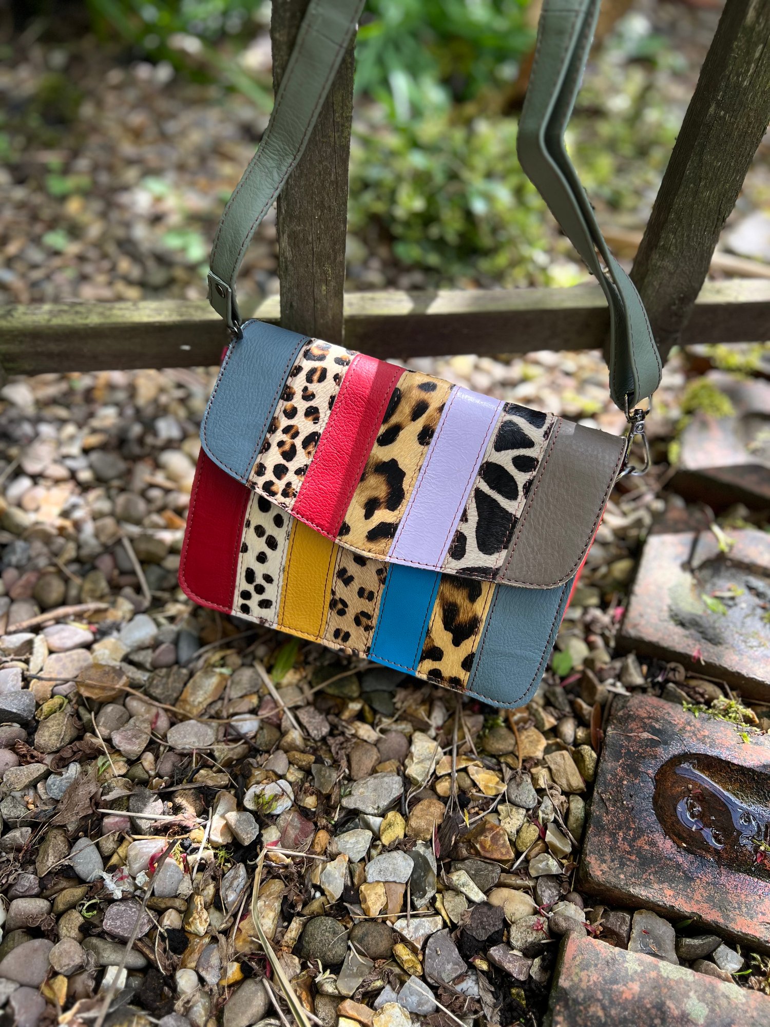 Brand new to our Harlequin Collection is this amazing multi-coloured striped bag, which will certainly bring a wow to any outfit! Made from sustainable buffalo leather offcuts, otherwise destined for landfill, this unique small bag is crafted by our Indian artisans.