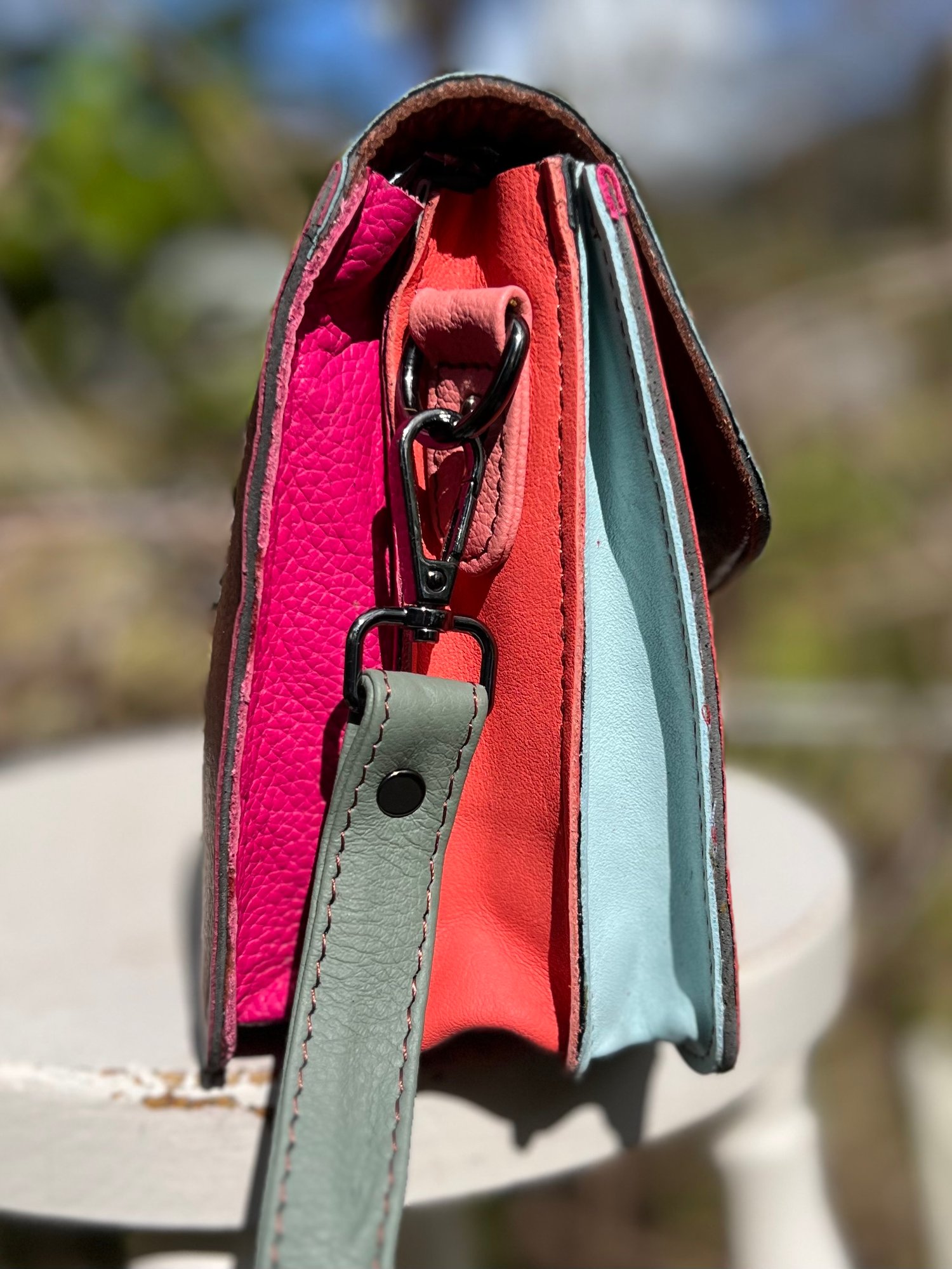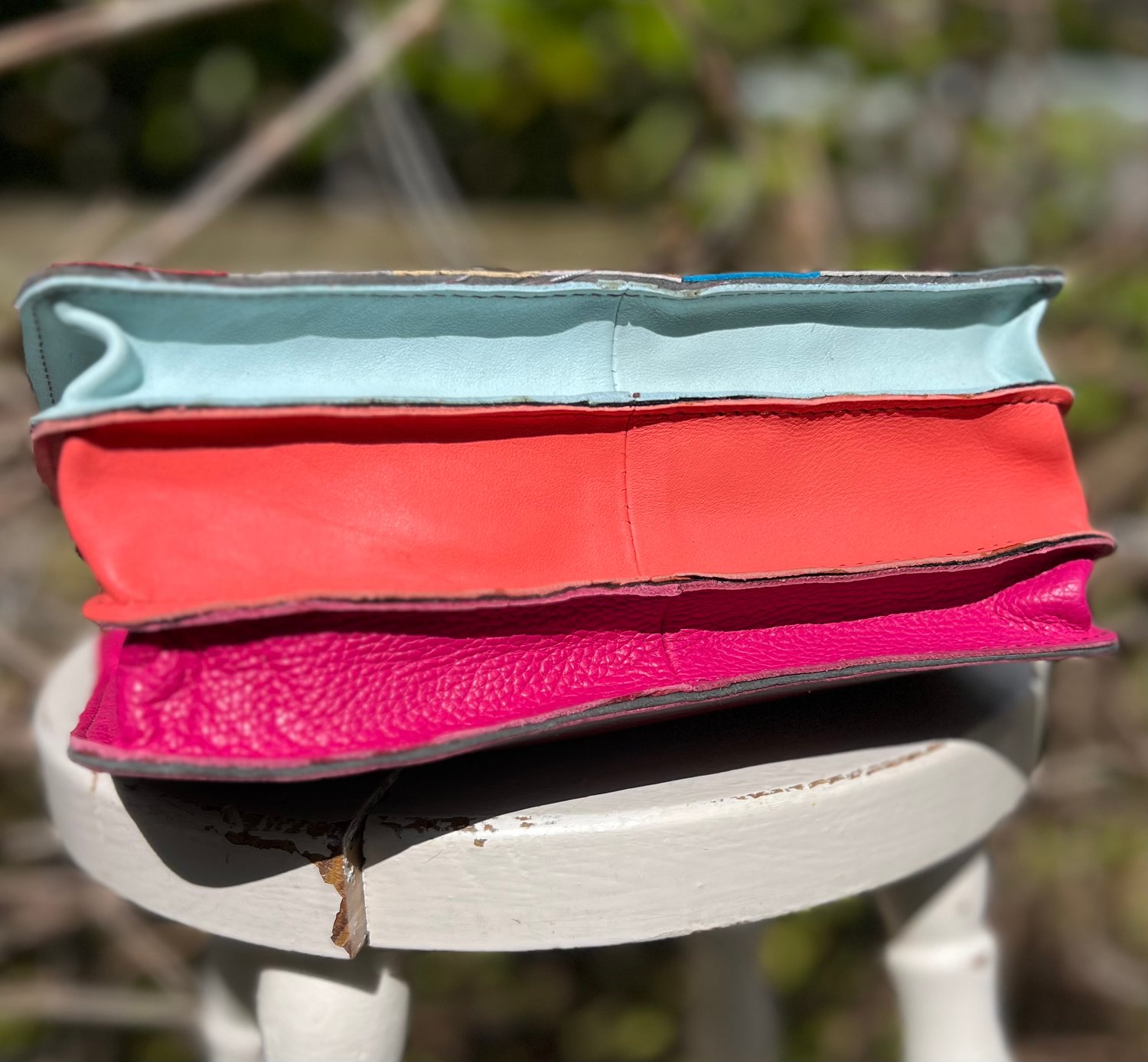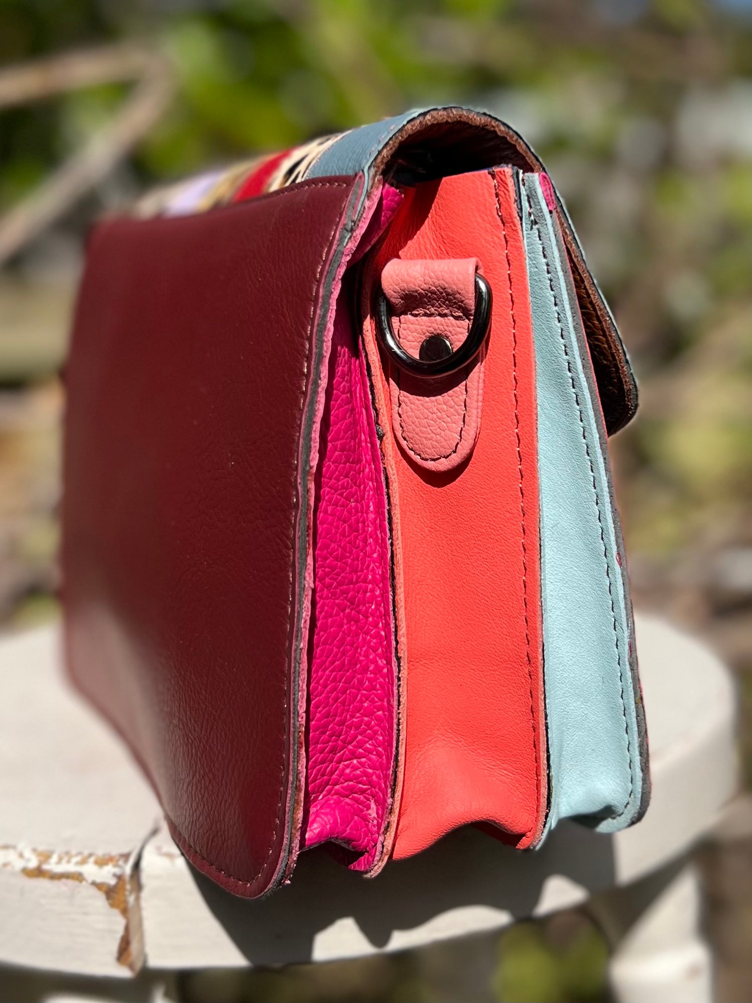 Brand new to our Harlequin Collection is this amazing multi-coloured striped bag, which will certainly bring a wow to any outfit! Made from sustainable buffalo leather offcuts, otherwise destined for landfill, this unique small bag is crafted by our Indian artisans.