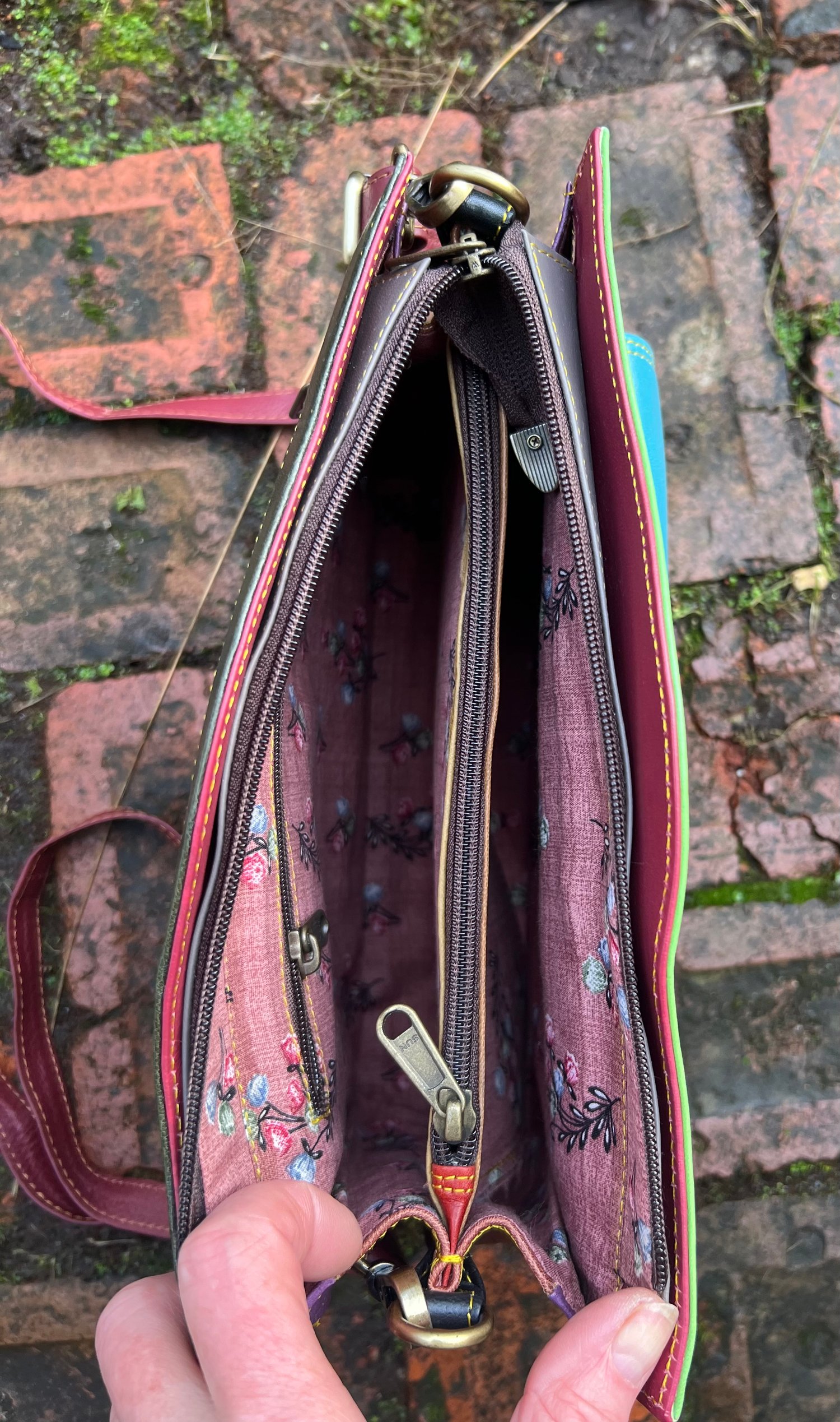 The inside is lined in a floral cotton fabric, with a zipped pocket, plus a central zipped compartment.