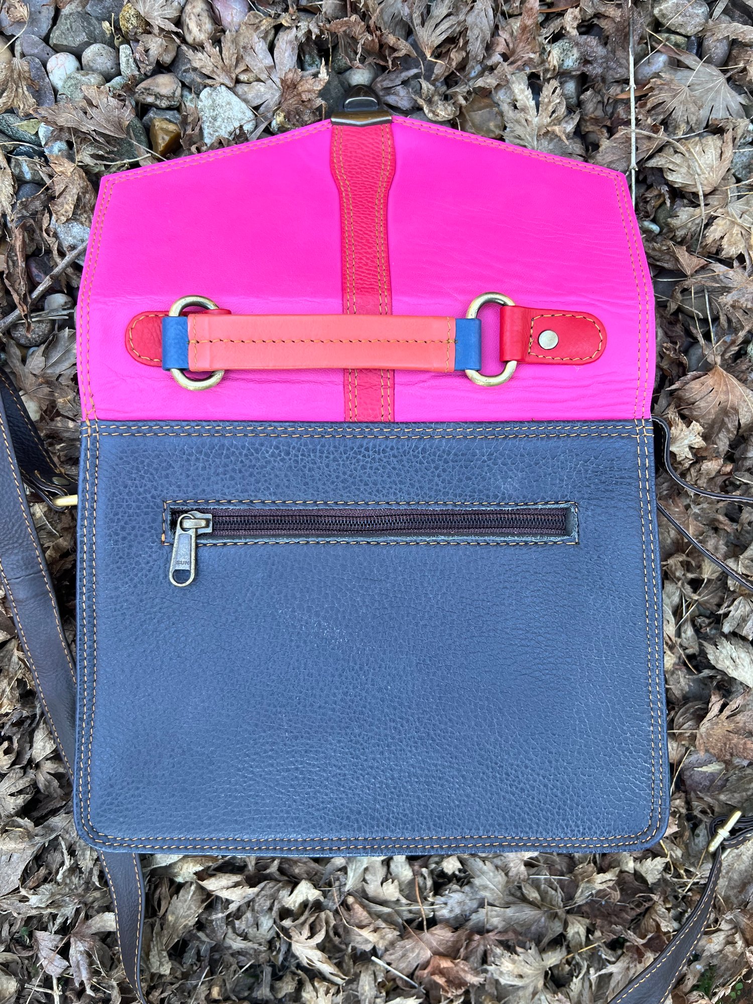 A favourite of our Harlequin Collection is this unusual recycled buffalo leather bag with shoulder strap and carry handle.